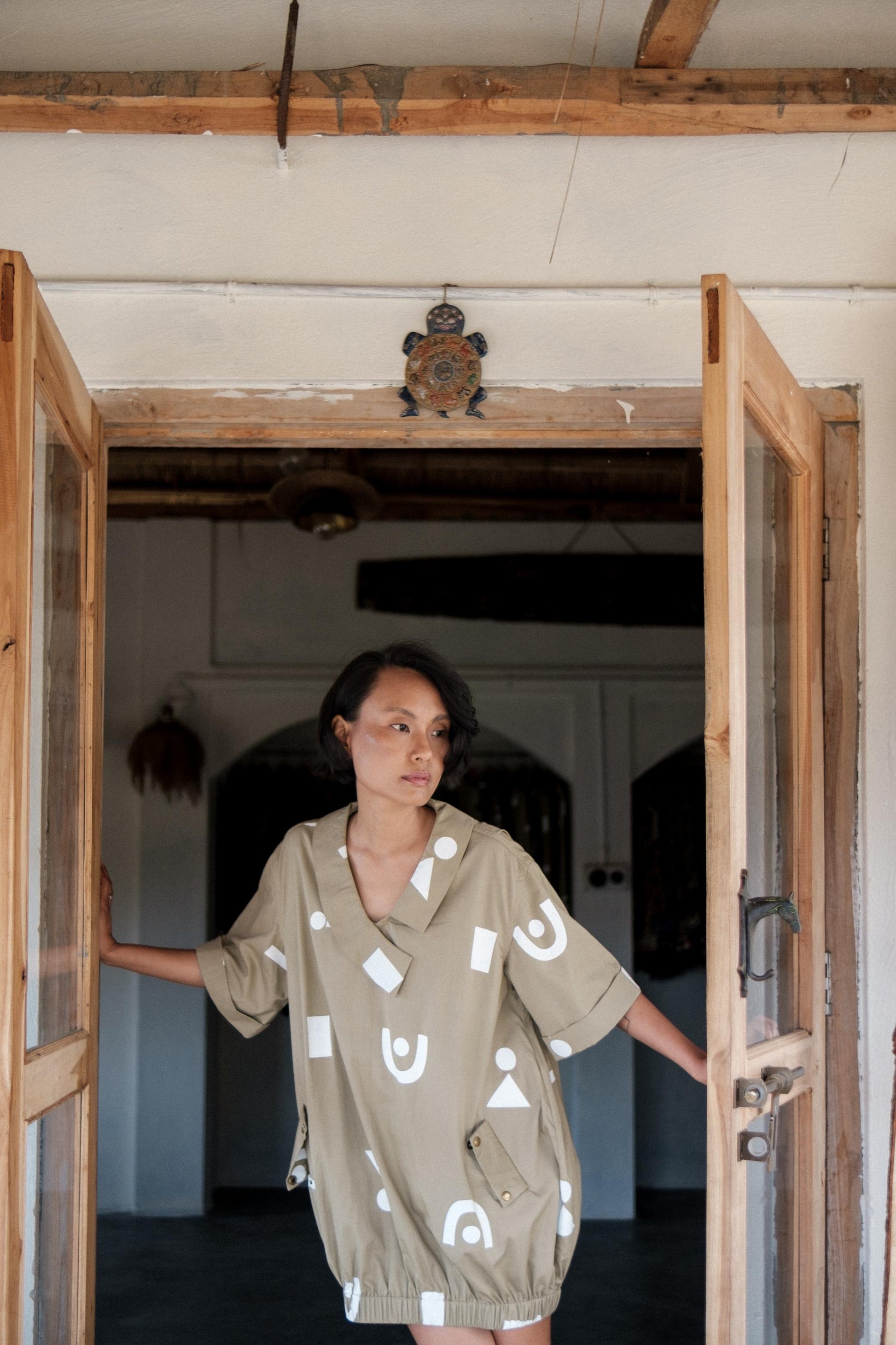 An oversized shift dress with elasticated hem detail , pockets and asymmetrical collar is the perfect defination of casual chic.
