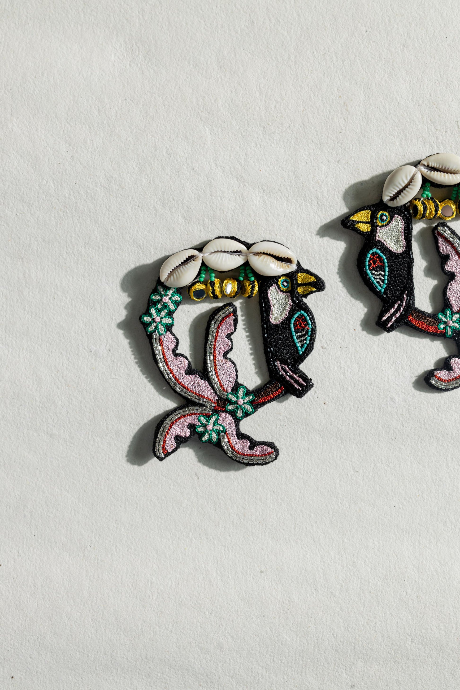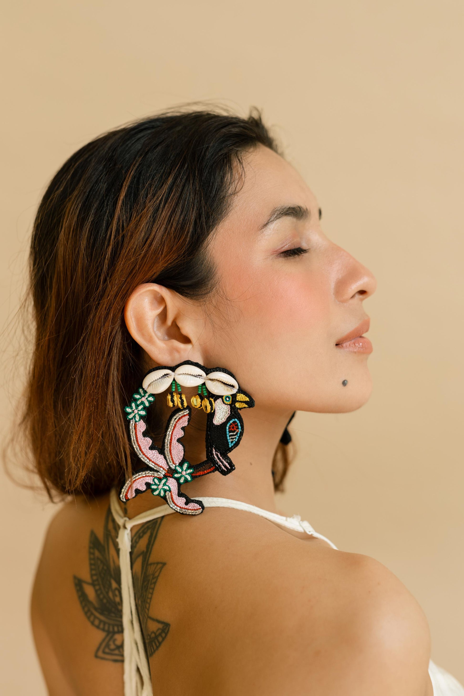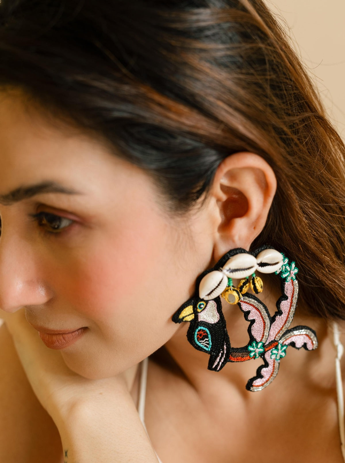 Bringing to you a unique tropical earring this summer which will be a perfect vibe for your beach vacay or pool party. With our lovely toucan birdie and kowrie shell details. Light weight and easy to carry, provided with a stud at back.