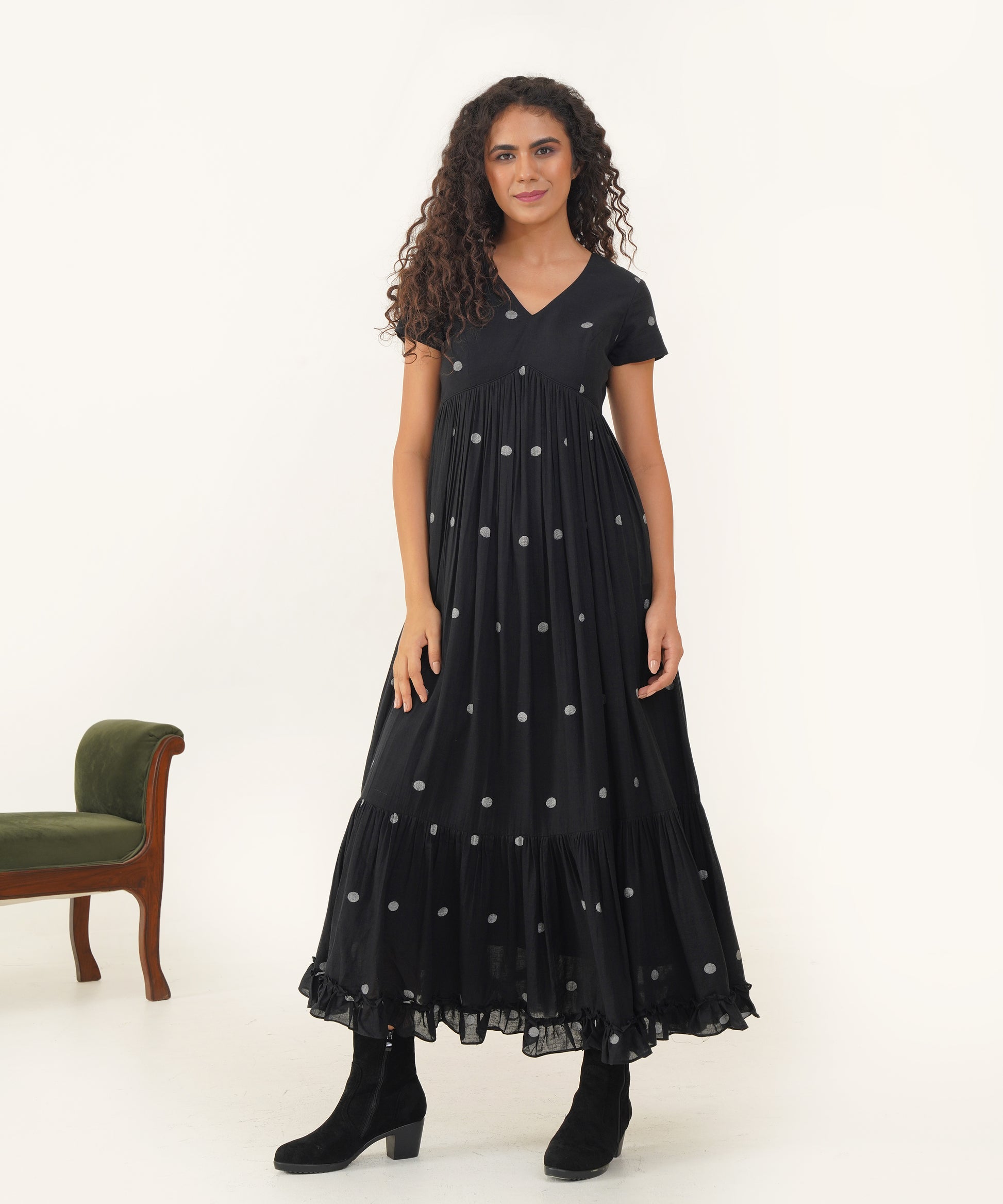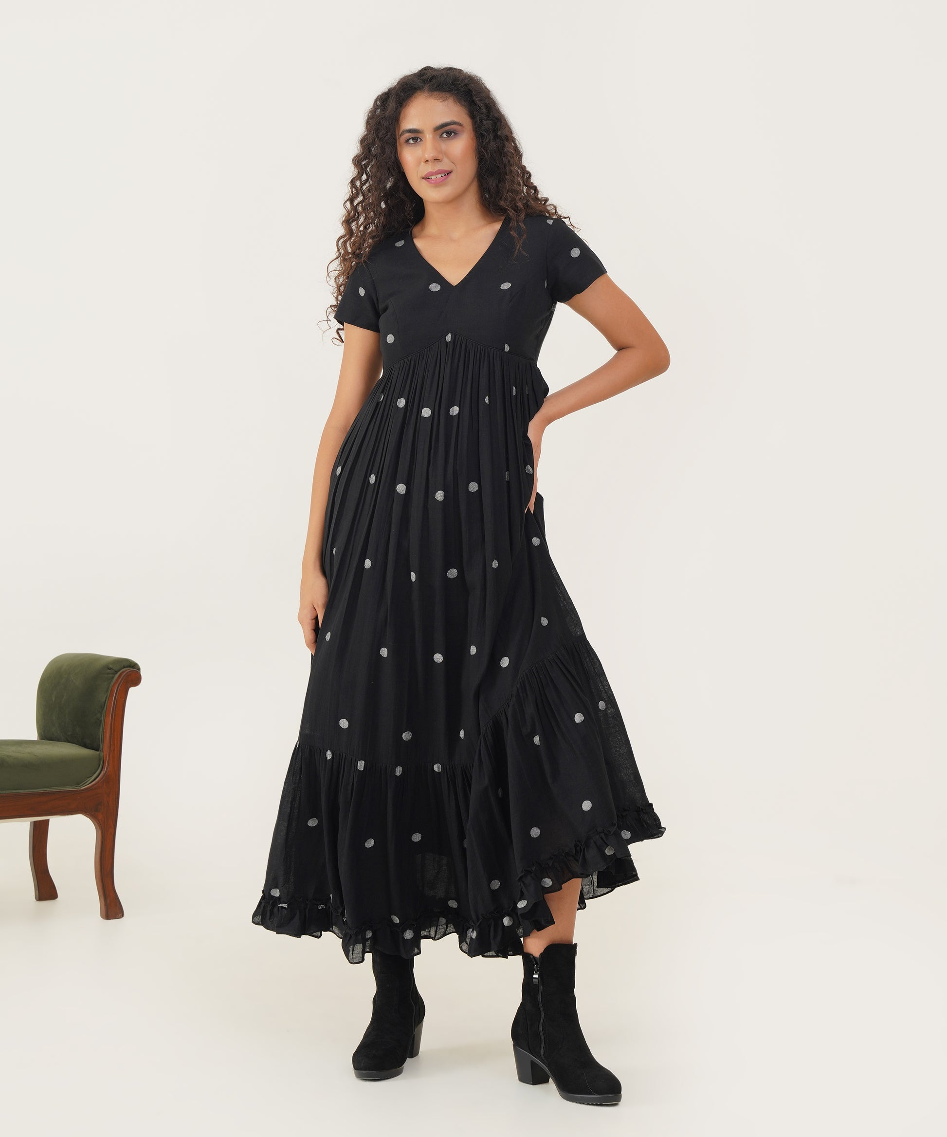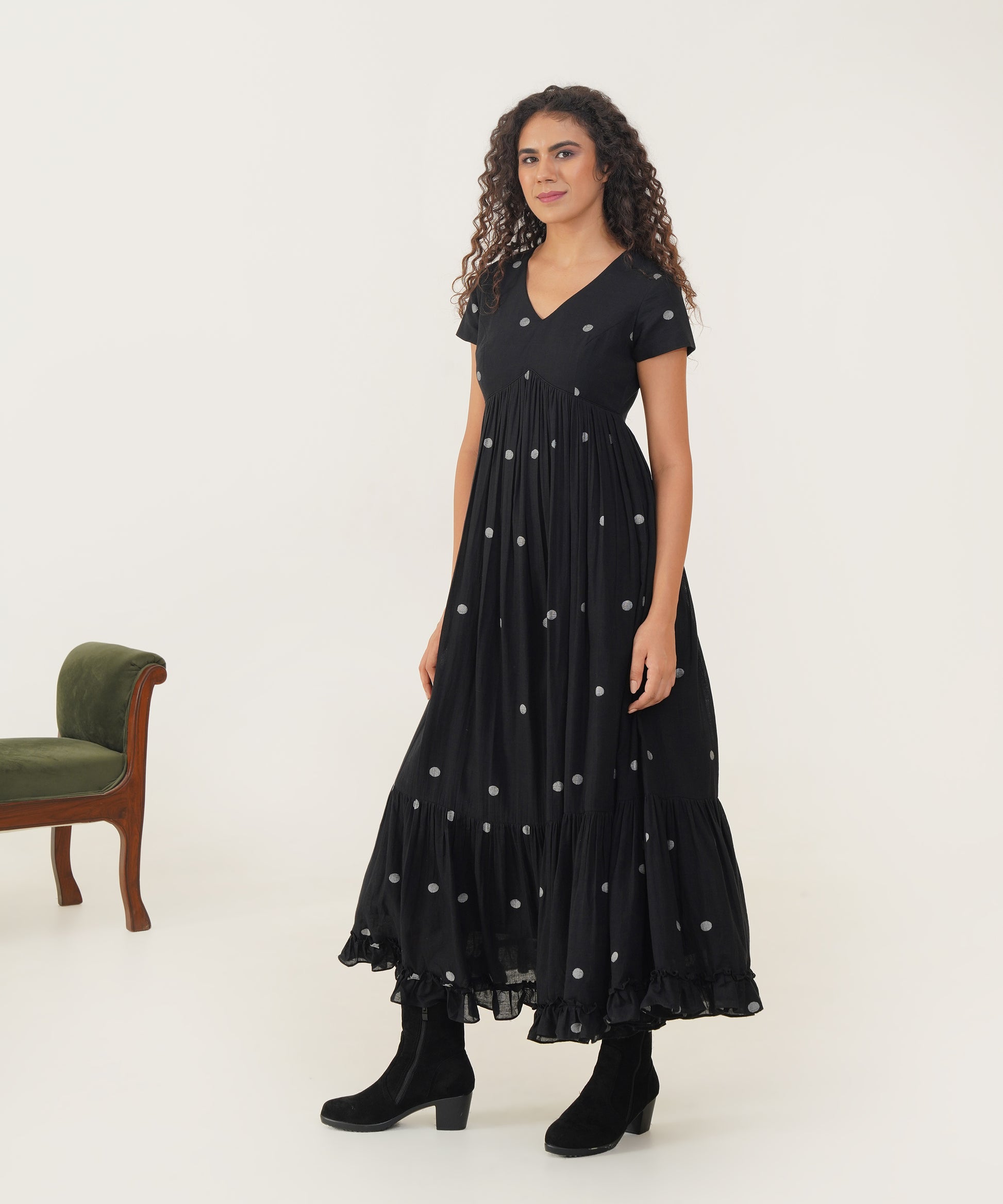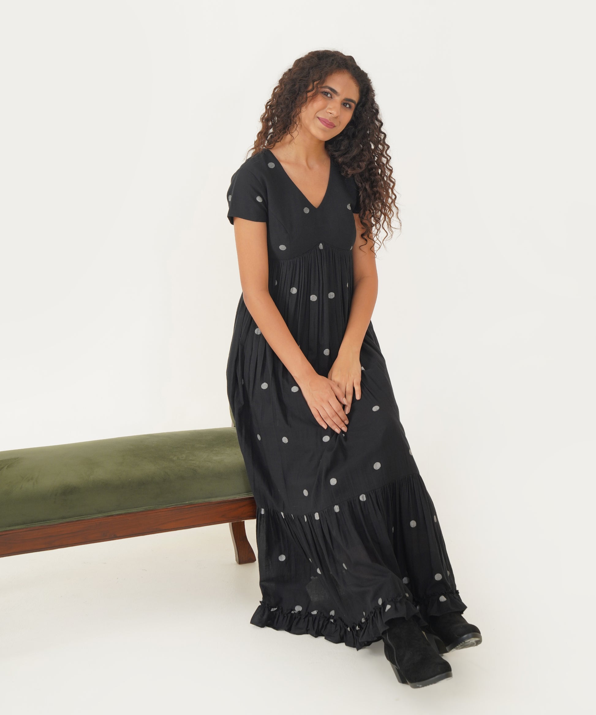 Embrace timeless elegance with our exquisite Jamdani dress. This masterpiece boasts a refined V-neckline and delicate cap sleeves, offering a classic and graceful silhouette. The gentle gathers enhance its flowy design, while the charming frill detailing at the hem adds a touch of playful sophistication. With a convenient back zipper fastening, this dress ensures a flawless fit and effortless style, perfect for making a memorable impression at any event.
