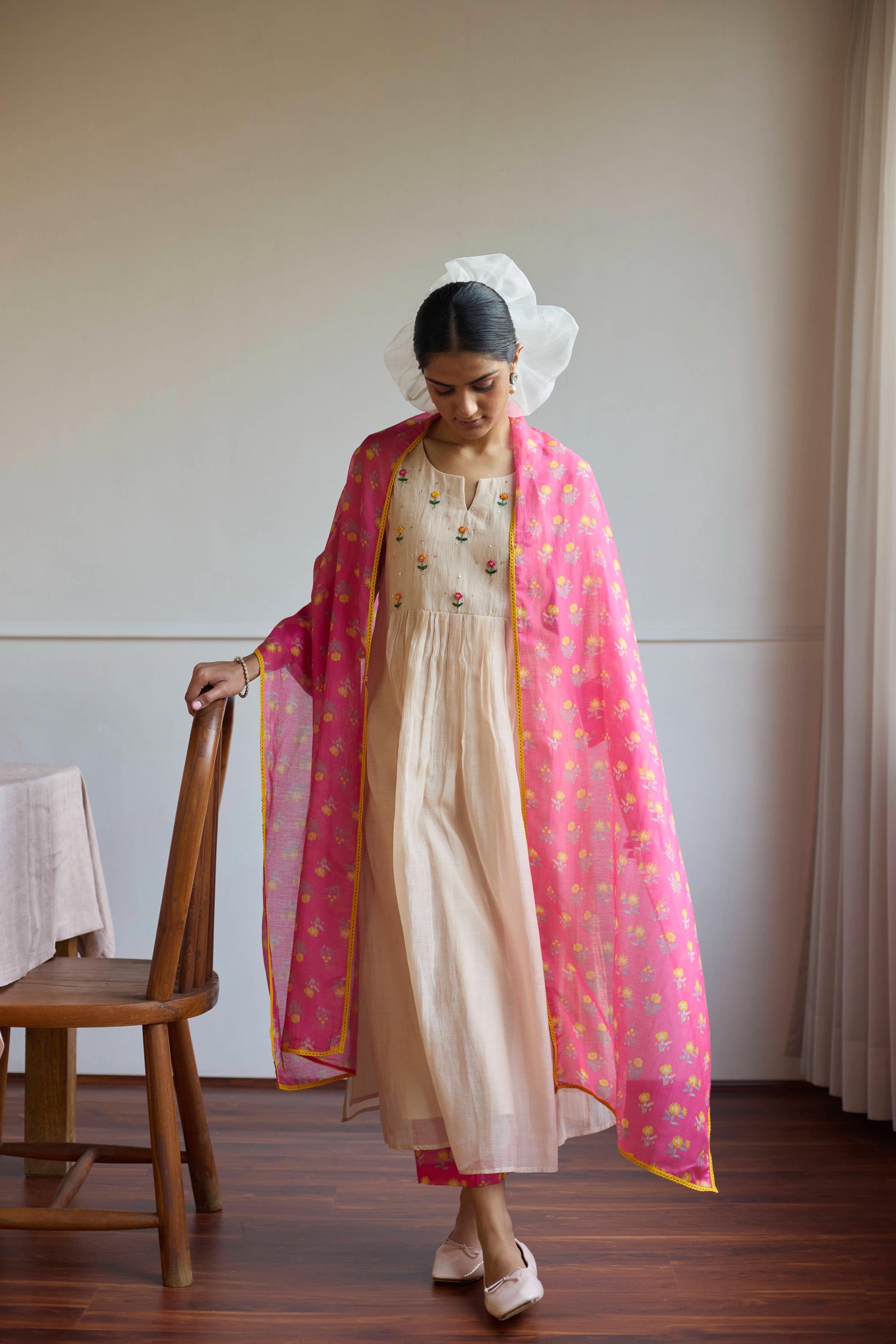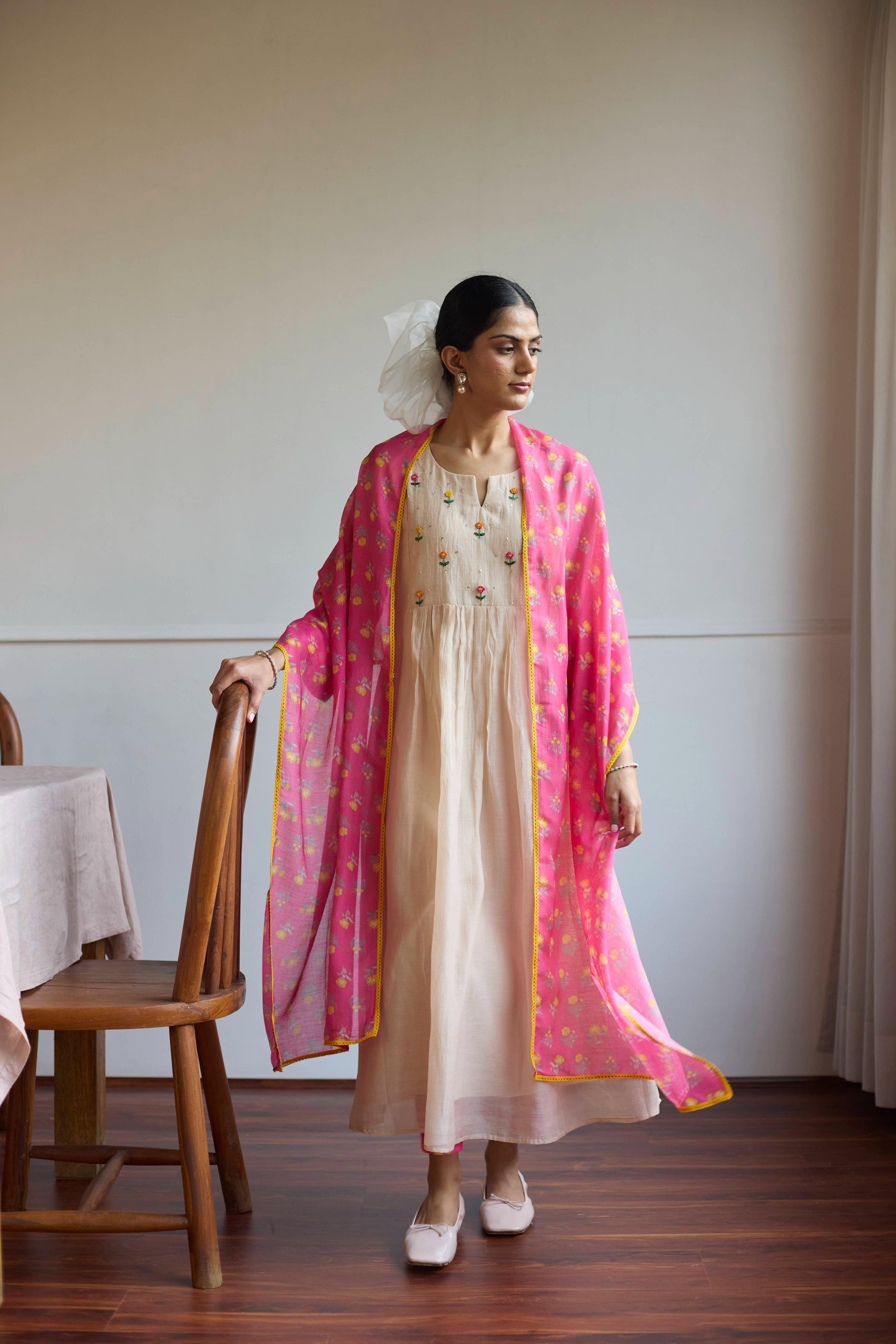 Presenting a vision of grace and charm—A handwoven Chanderi dupatta in radiant hot pink, Adorned with delicate floral Resham work, Each thread a whisper, each bloom a wink.