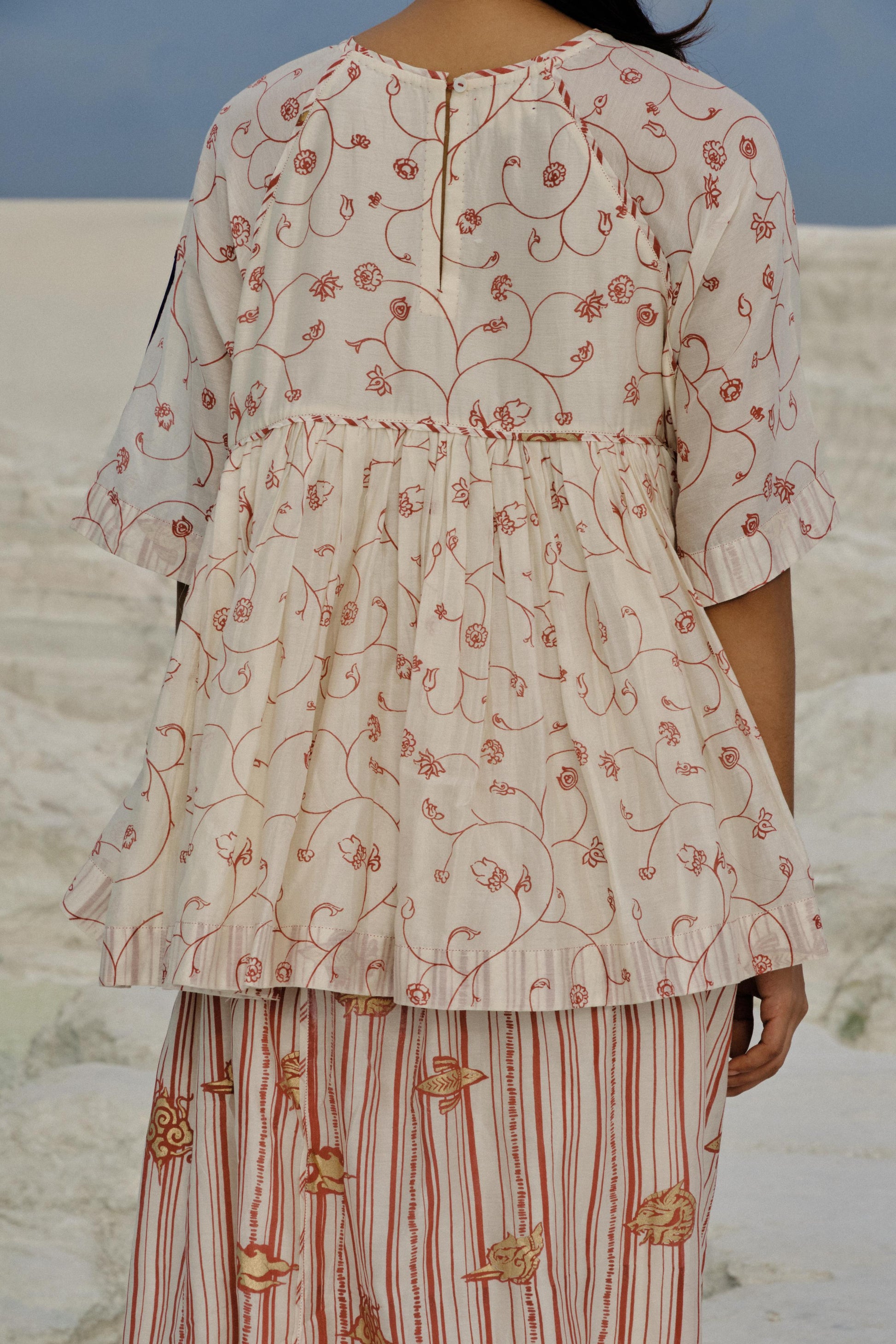 Made in floral hand-screen-printed cotton silk, the Taya Raglan Top drapes gently along the style lines, with soft gathers that create a flowing, airy rhythm. Raglan sleeves lend lightness, while a subtle back opening ensures comfort and ease of movement. Every element—from the delicate binding details at the sleeve to the finished seams—has been carefully executed over hours of skilled labour, making this top a refined celebration of timeless elegance and quiet artistry.