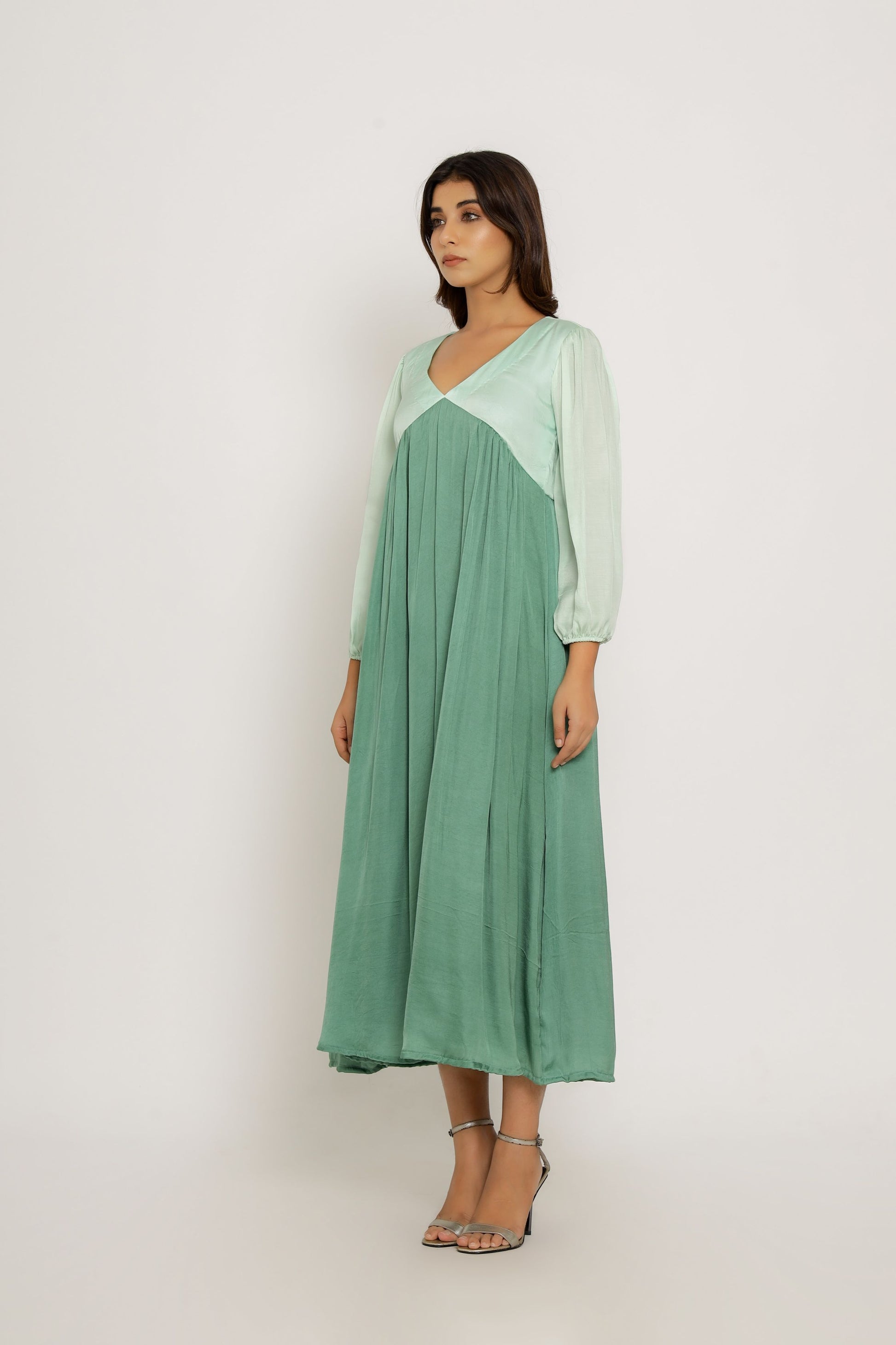 Teal-Tea Green Full Length Dress with Bishop Sleeves and Gathers