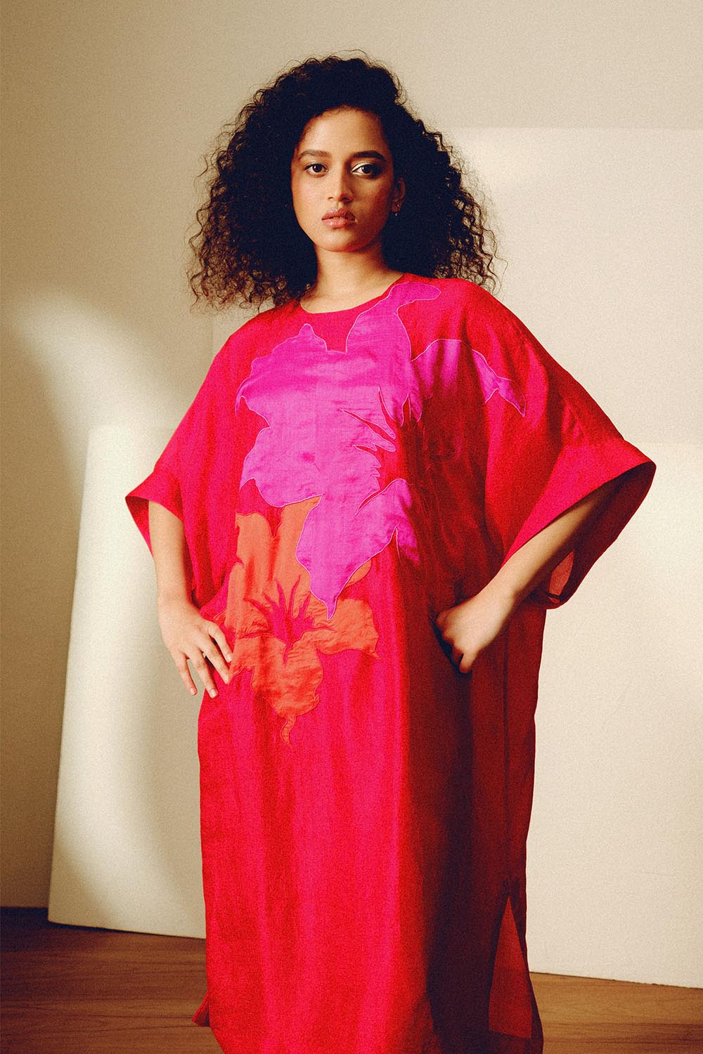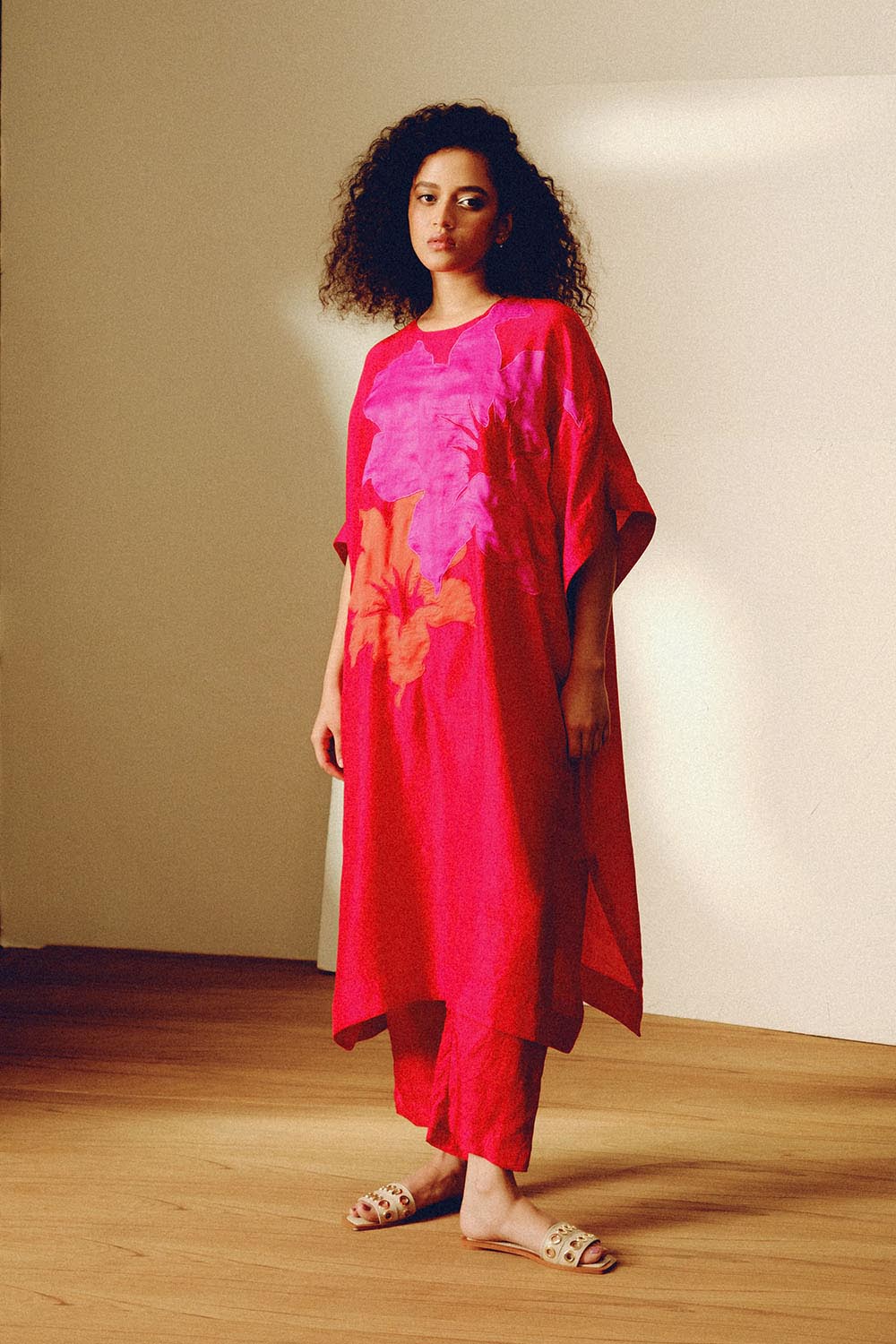 Handwoven mulberry silk free sized tunic with contrast floral applique and matching narrow pants. Tunic length- 44" Pant Length-37”