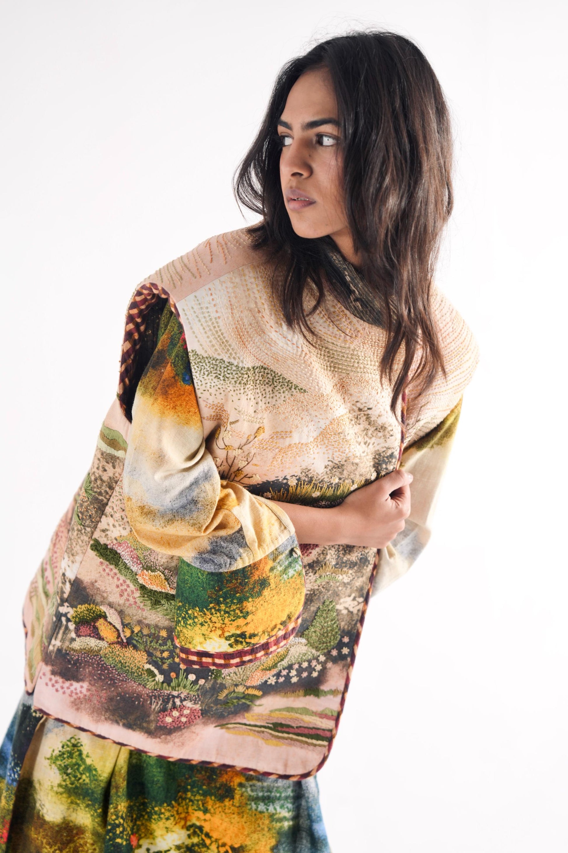 This embroidered jacket is made in soft cotton featuring hand painted, digitally printed surreal landscape and embellished with all threadwork embroidery creating a mesmerising textures.