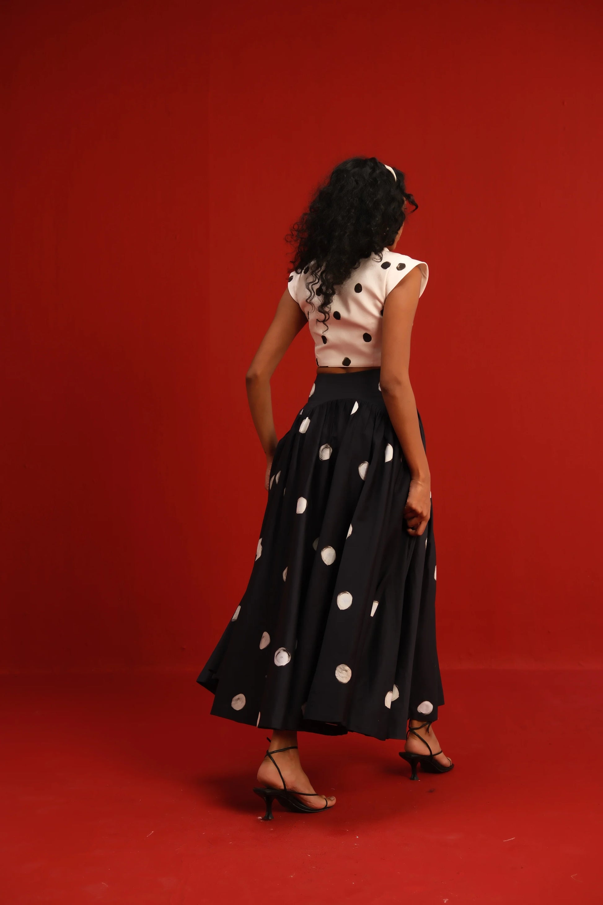 Featuring a crisp ivory cropped top with bold black polka dots and a twist-front neckline, this look is perfectly balanced by a voluminous black skirt adorned with oversized ivory dots. The playful contrast in color and dot size creates a bold, graphic statement—perfect for the fashion enthusiast who loves to blend classic with contemporary.