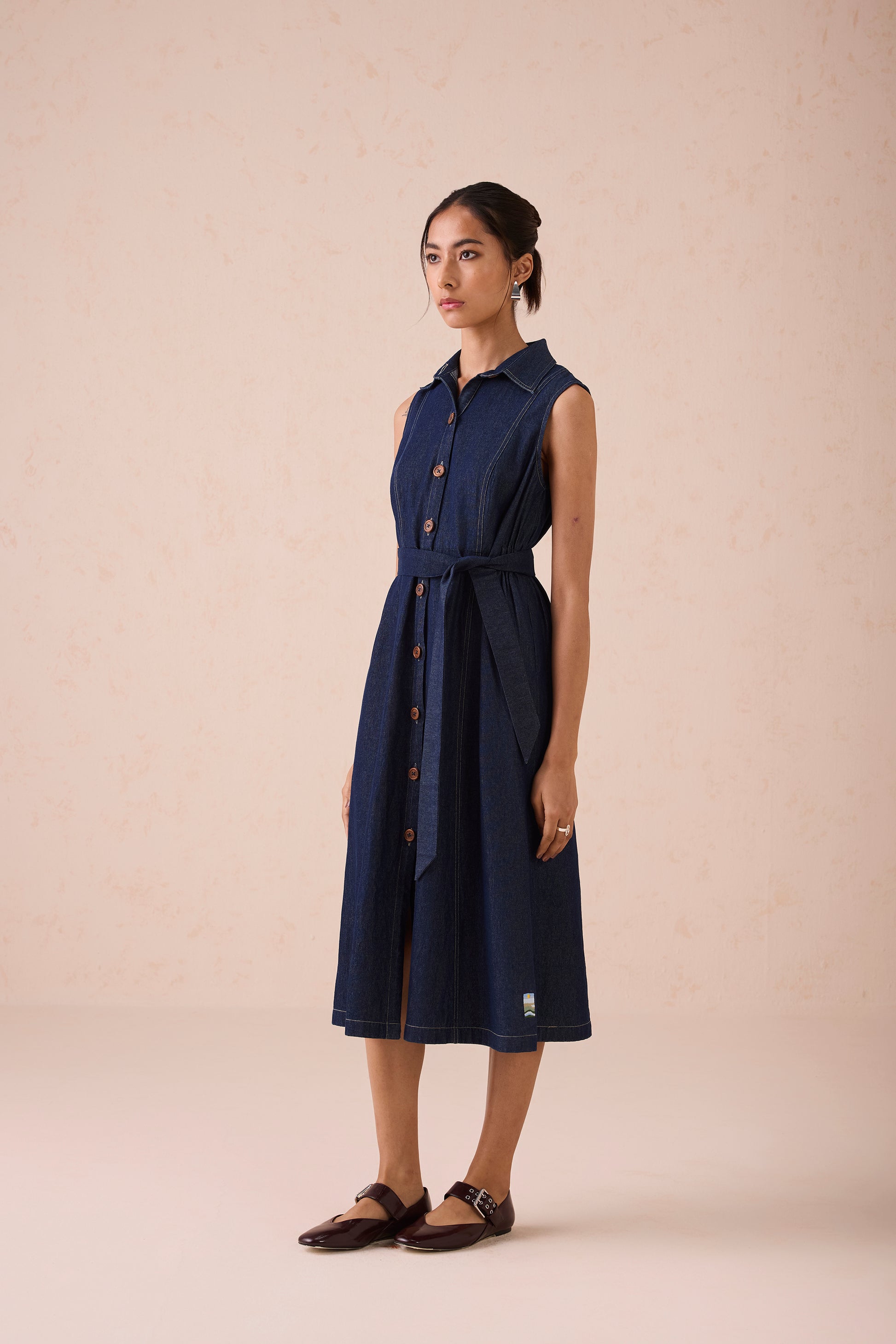 Fitted, collared, sleeveless midi dress that buttons at the front and is fitted at the waist, crafted in cotton denim fabric created with a blend of cotton and recycled cotton fibres, machine embroidered with a sunset motif.