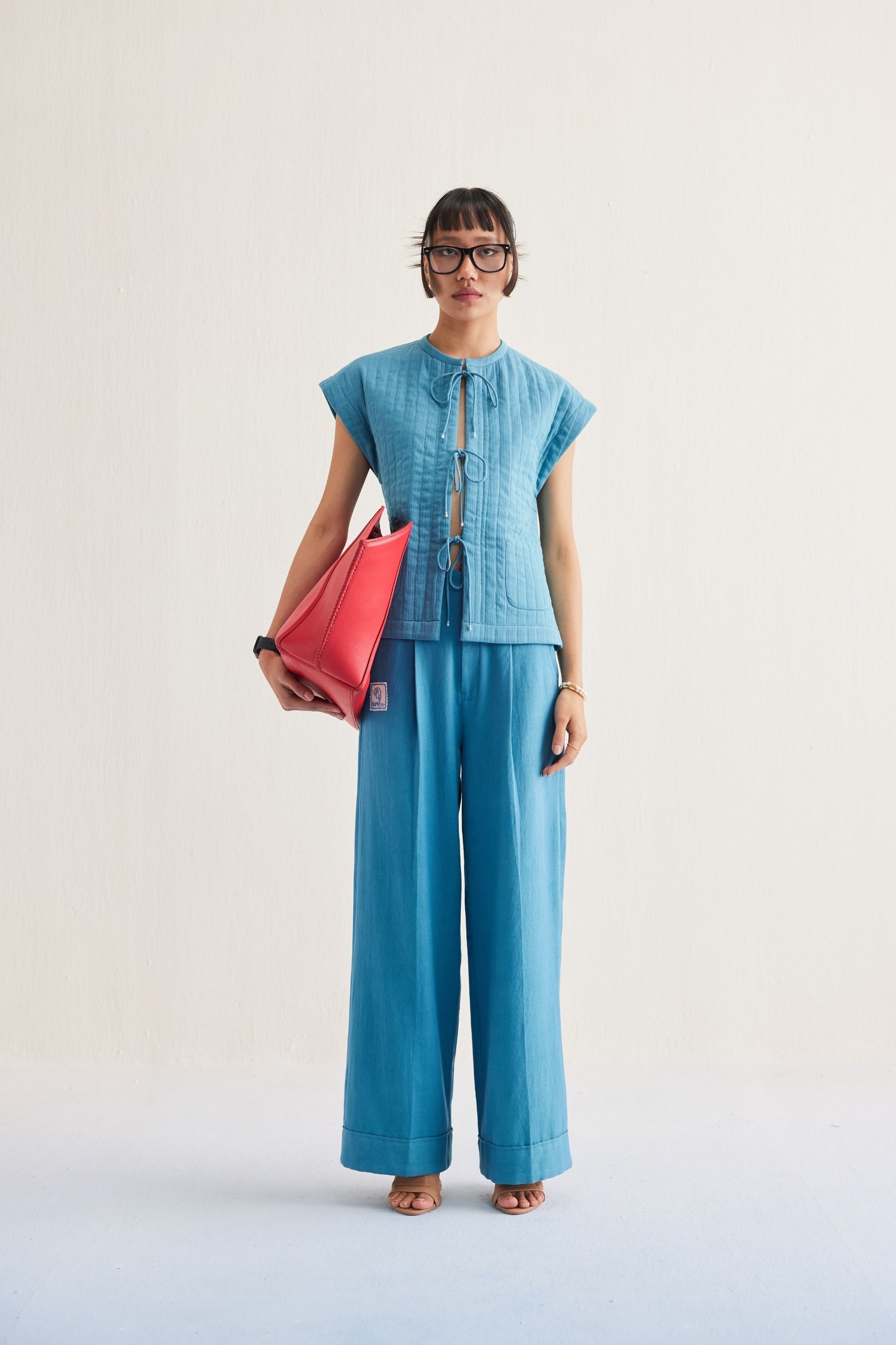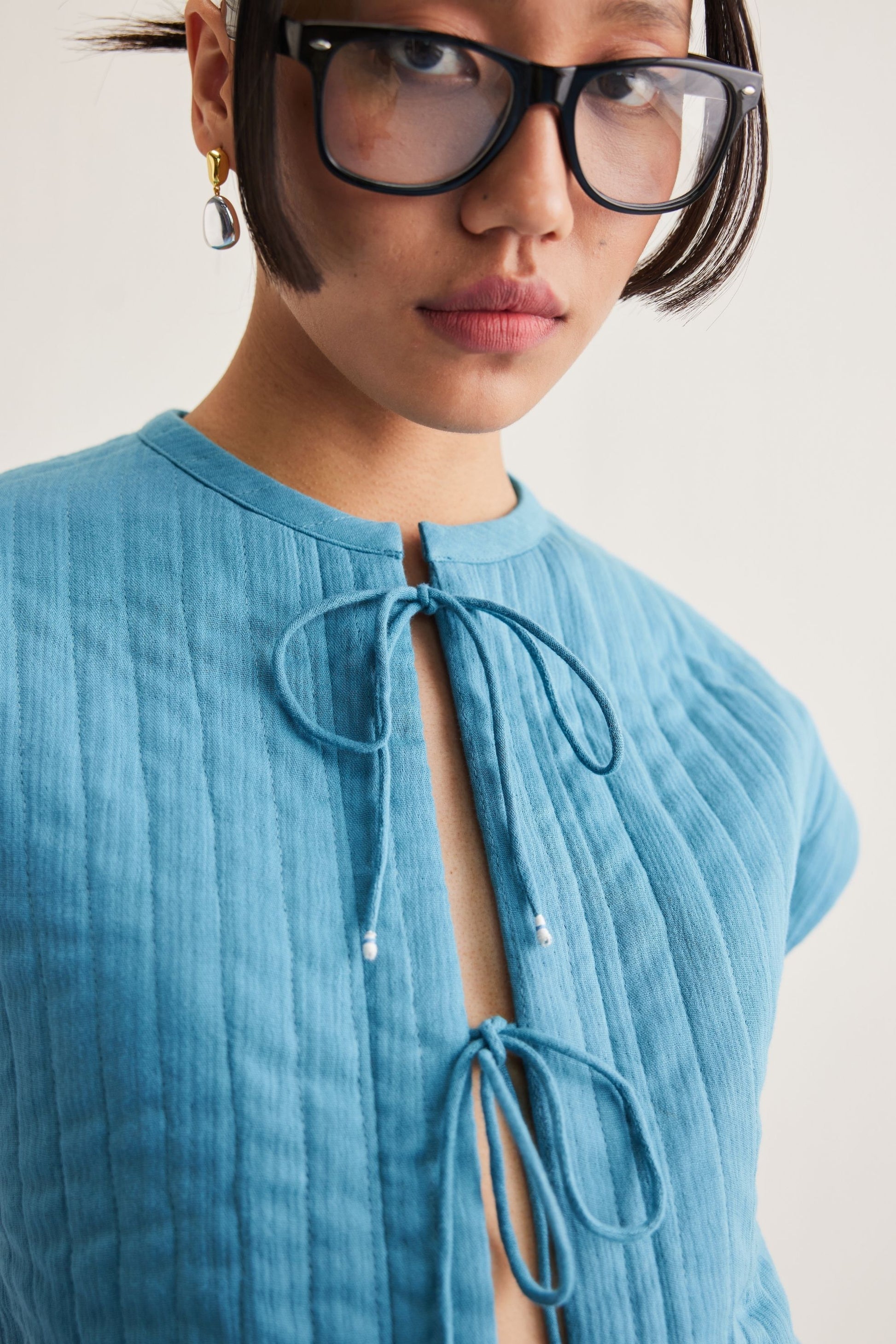 Regular fit, short sleeve, reversible vest top with pockets that fastens at the front with drawstrings, crafted in two fabrics - one is a blue azo-free dyed double gauze organic cotton, the other is a handspun and handwoven Kala cotton fabric that's hand block printed with our signature ocean life inspired motif using azo-free dyes.