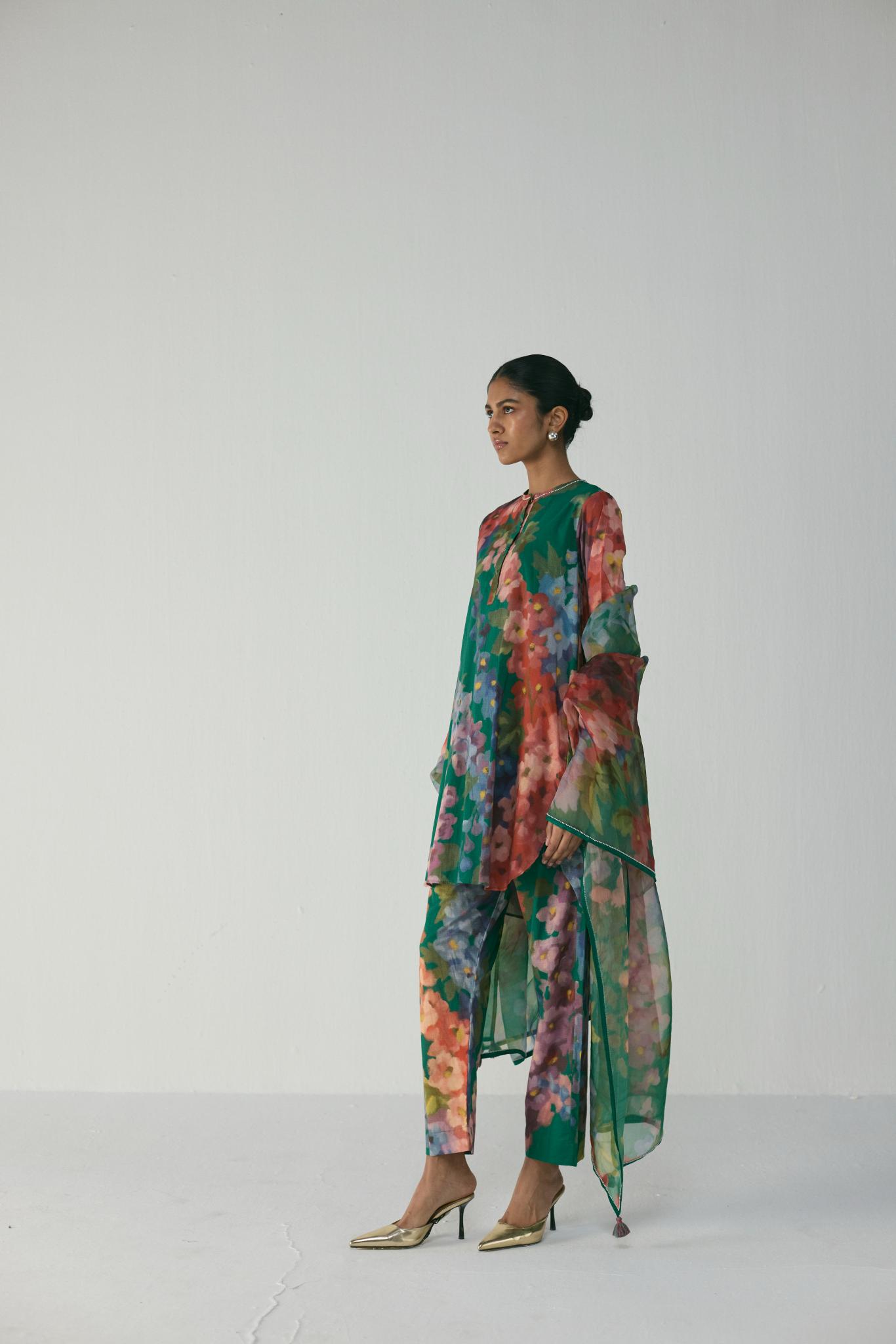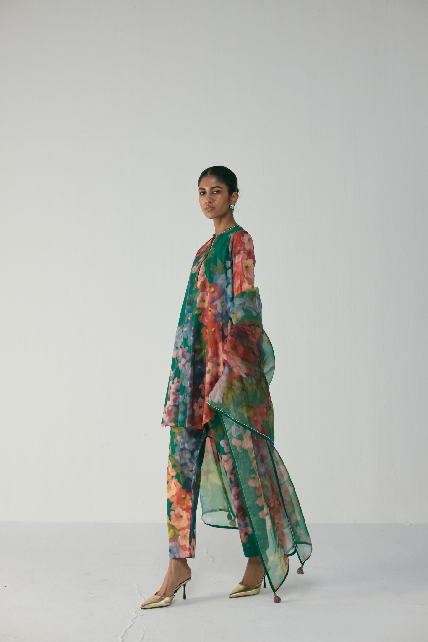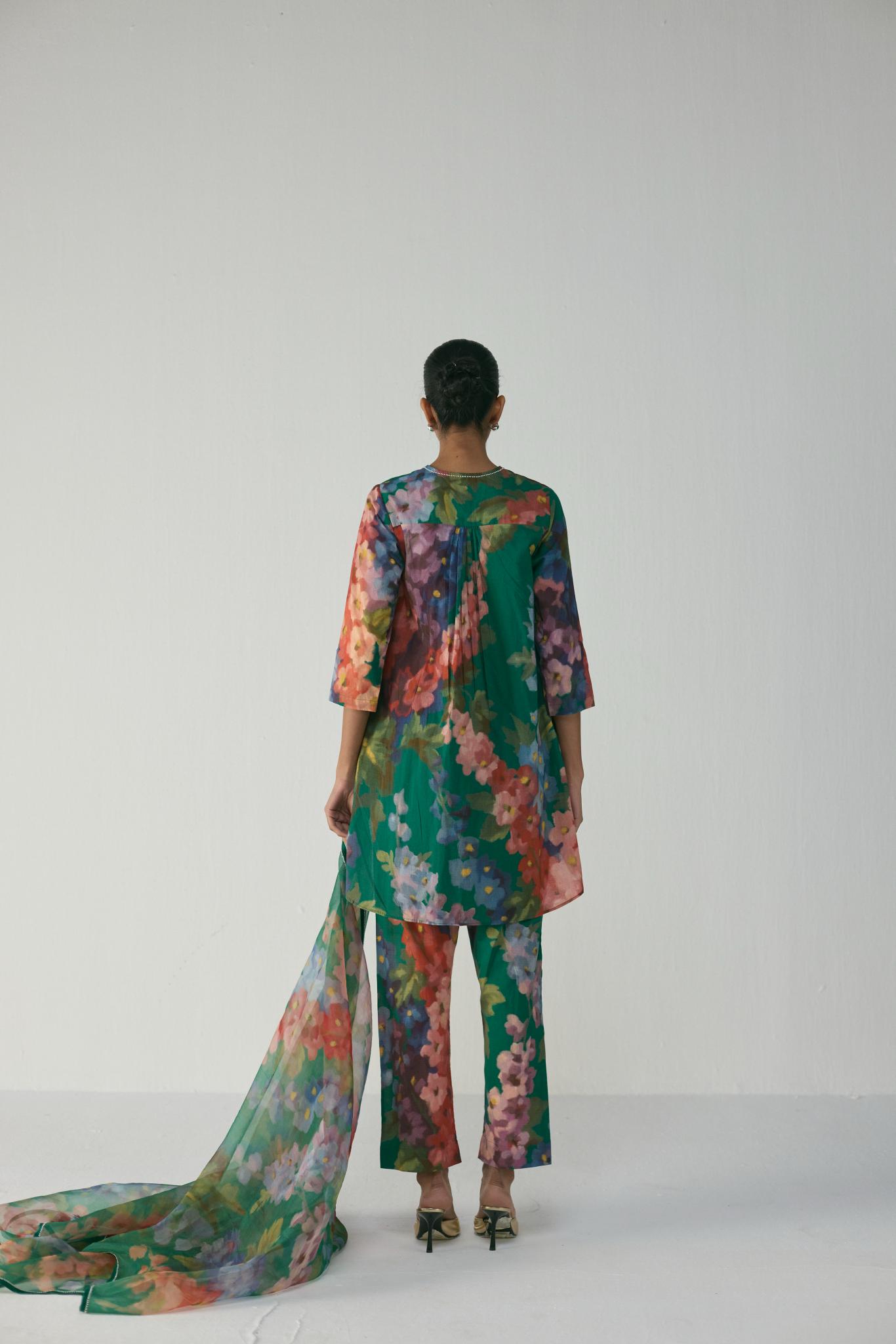 The coordinated trousers mirror the floral pattern, creating a harmonious, contemporary look that balances comfort with artistry.