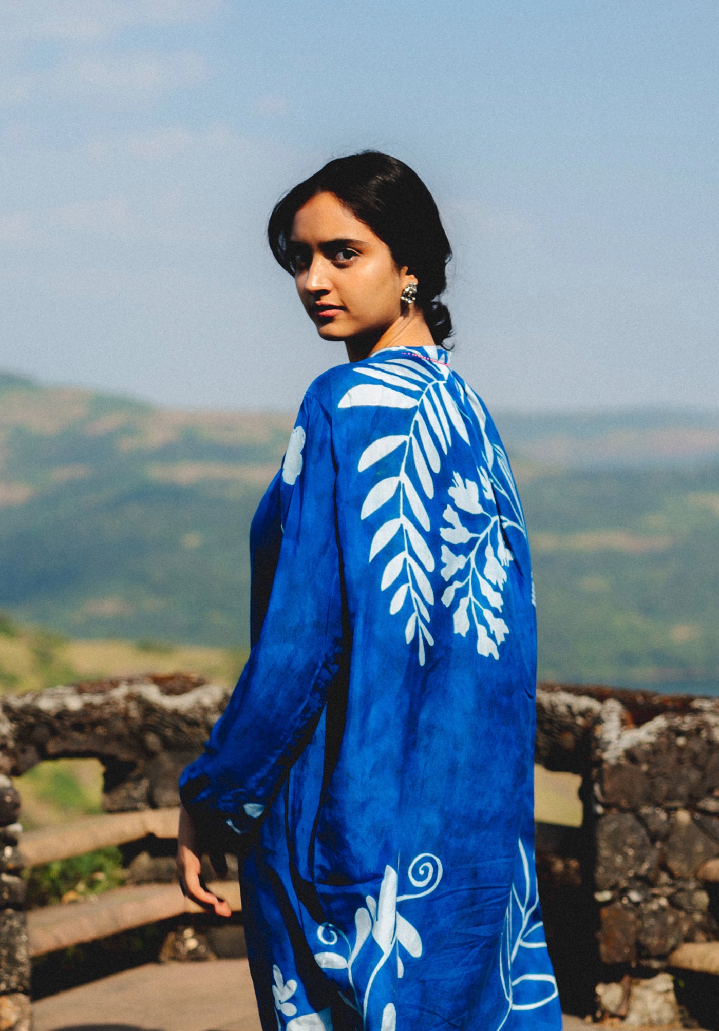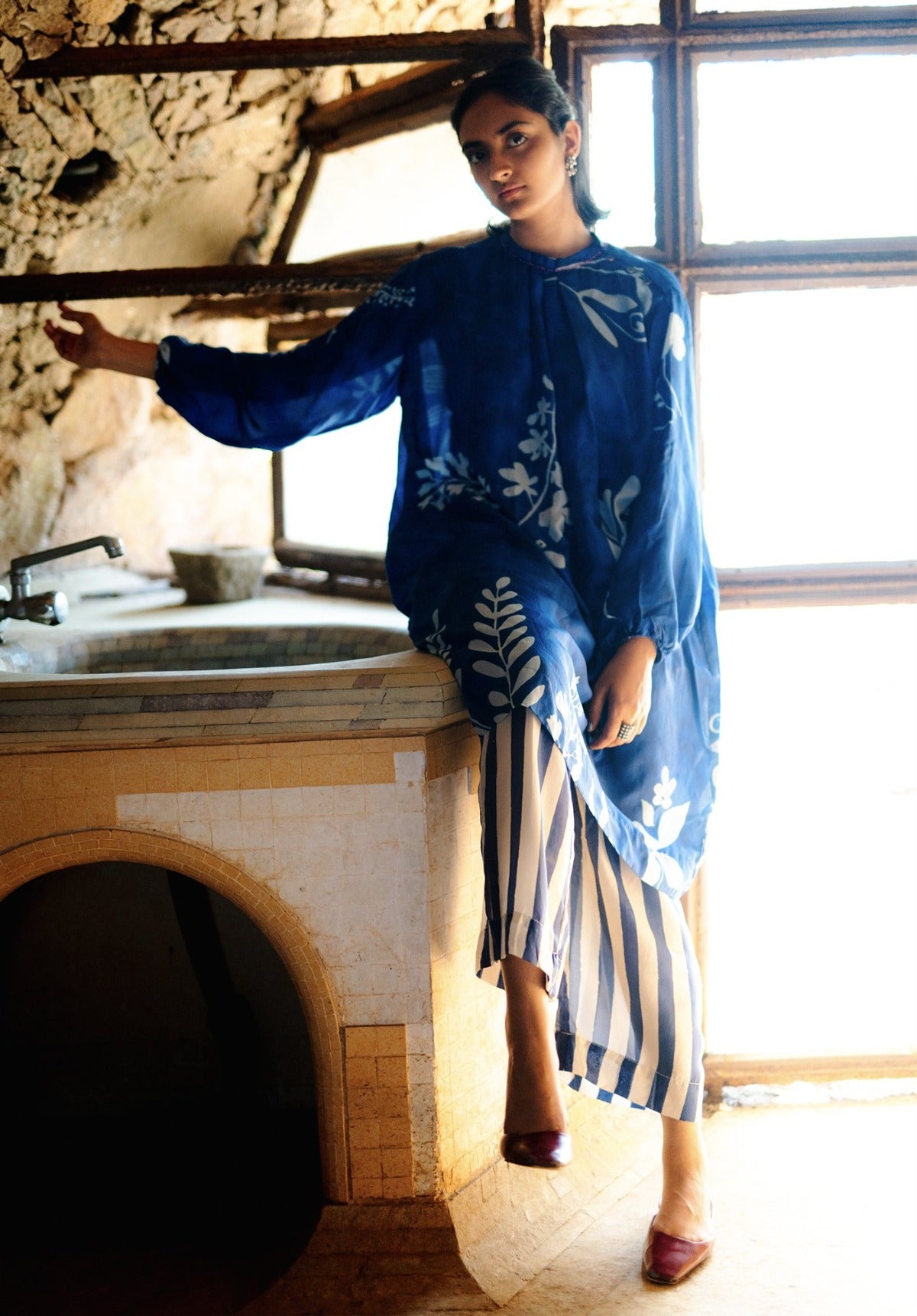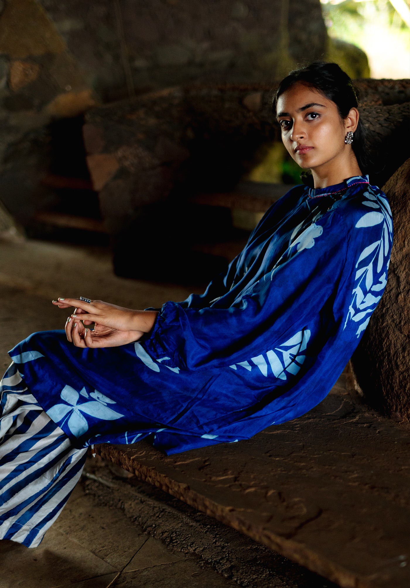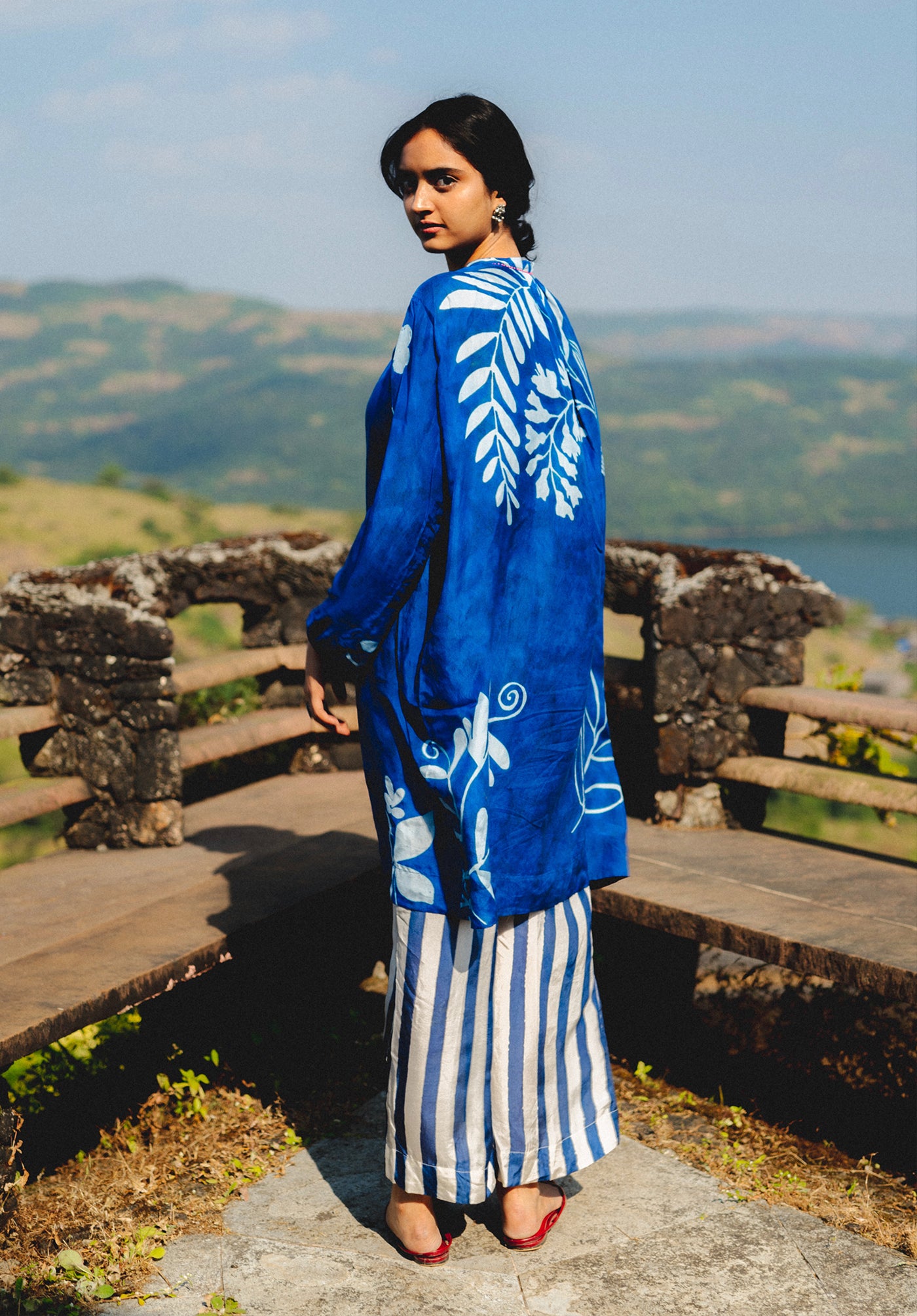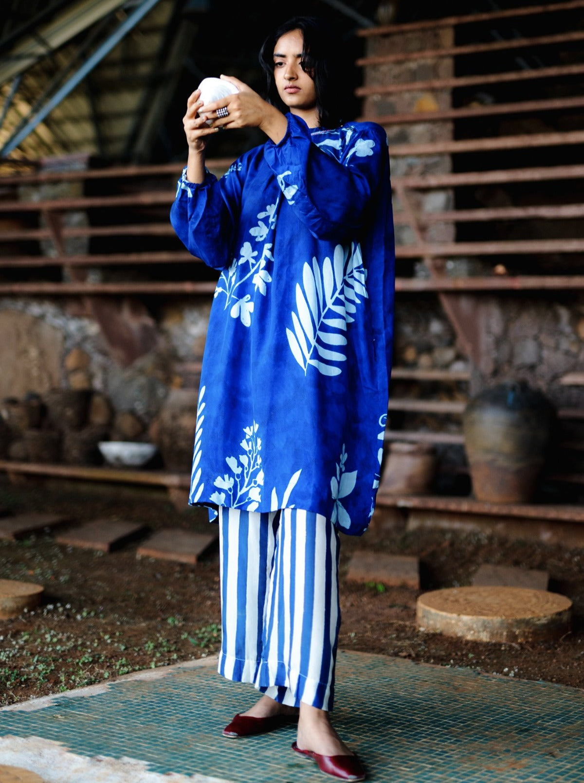 The set in a striking royal blue color features massive handpainted leaves of distinct shapes and designs. The pants are handblock printed in pure silk on a blue base with white stripes.