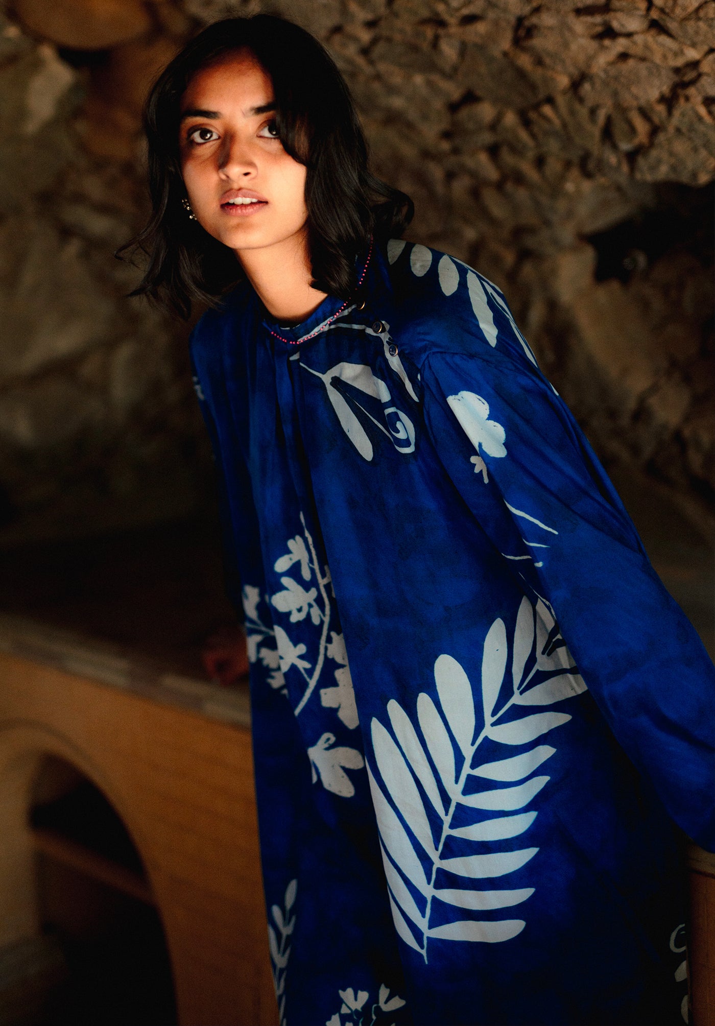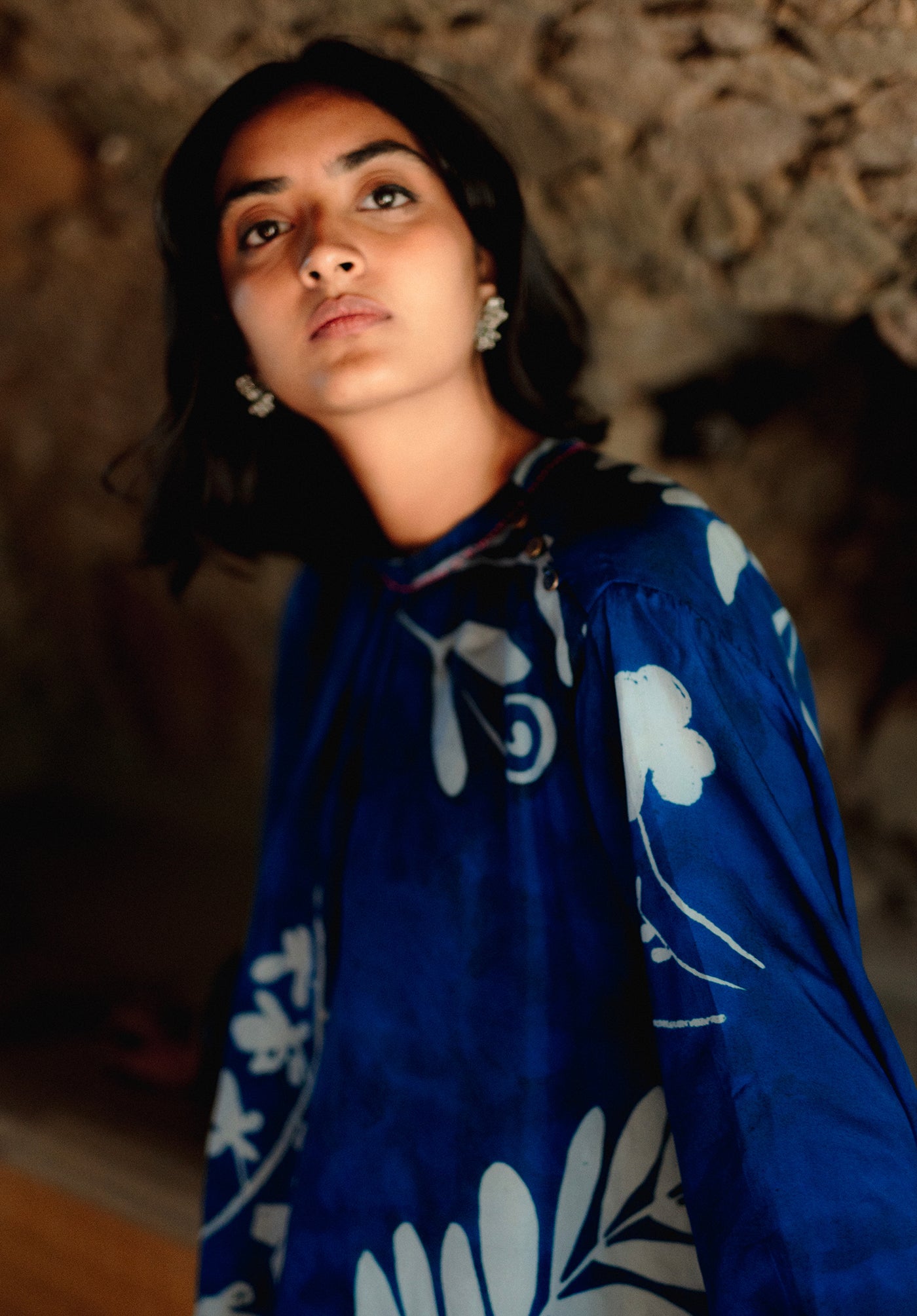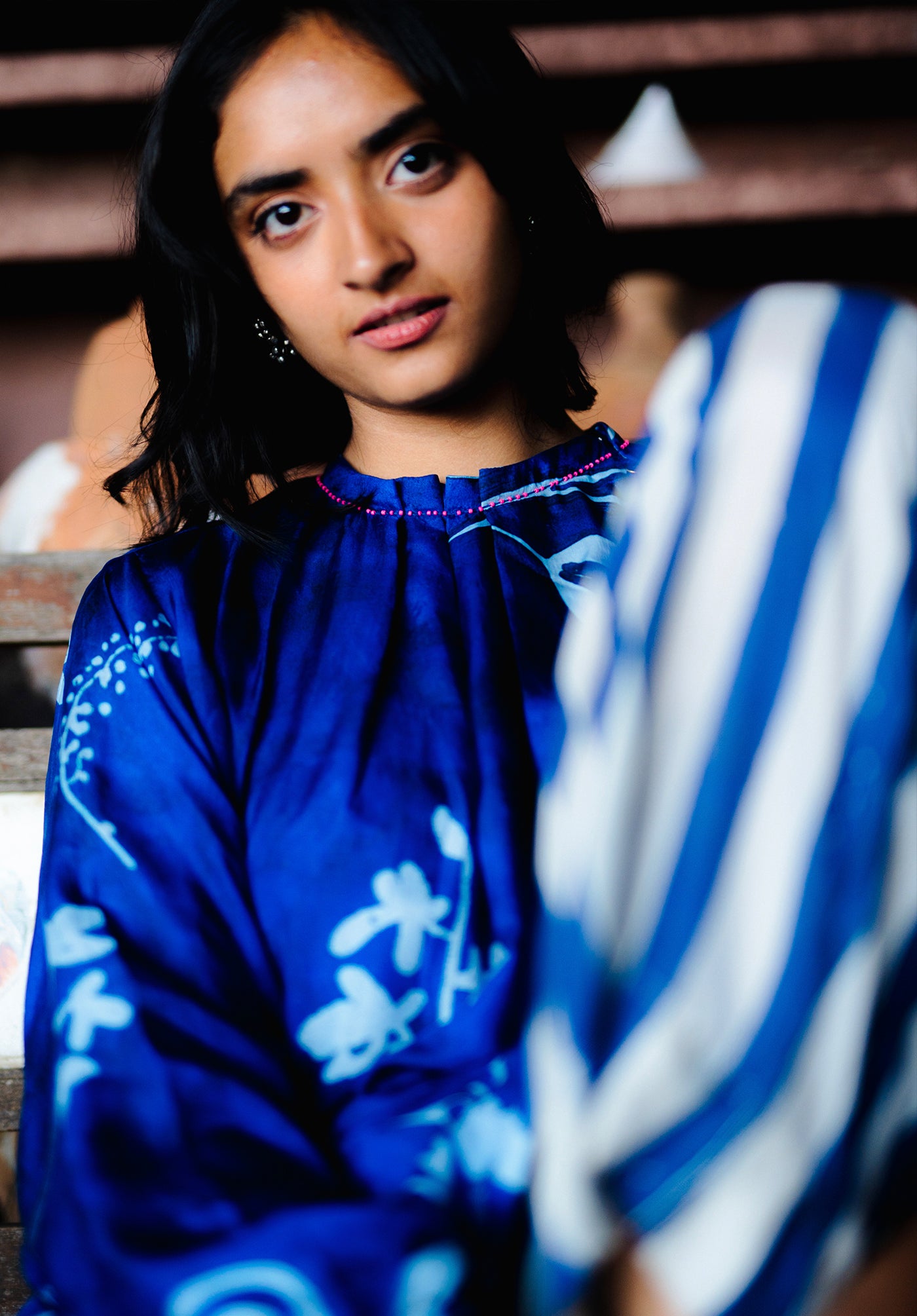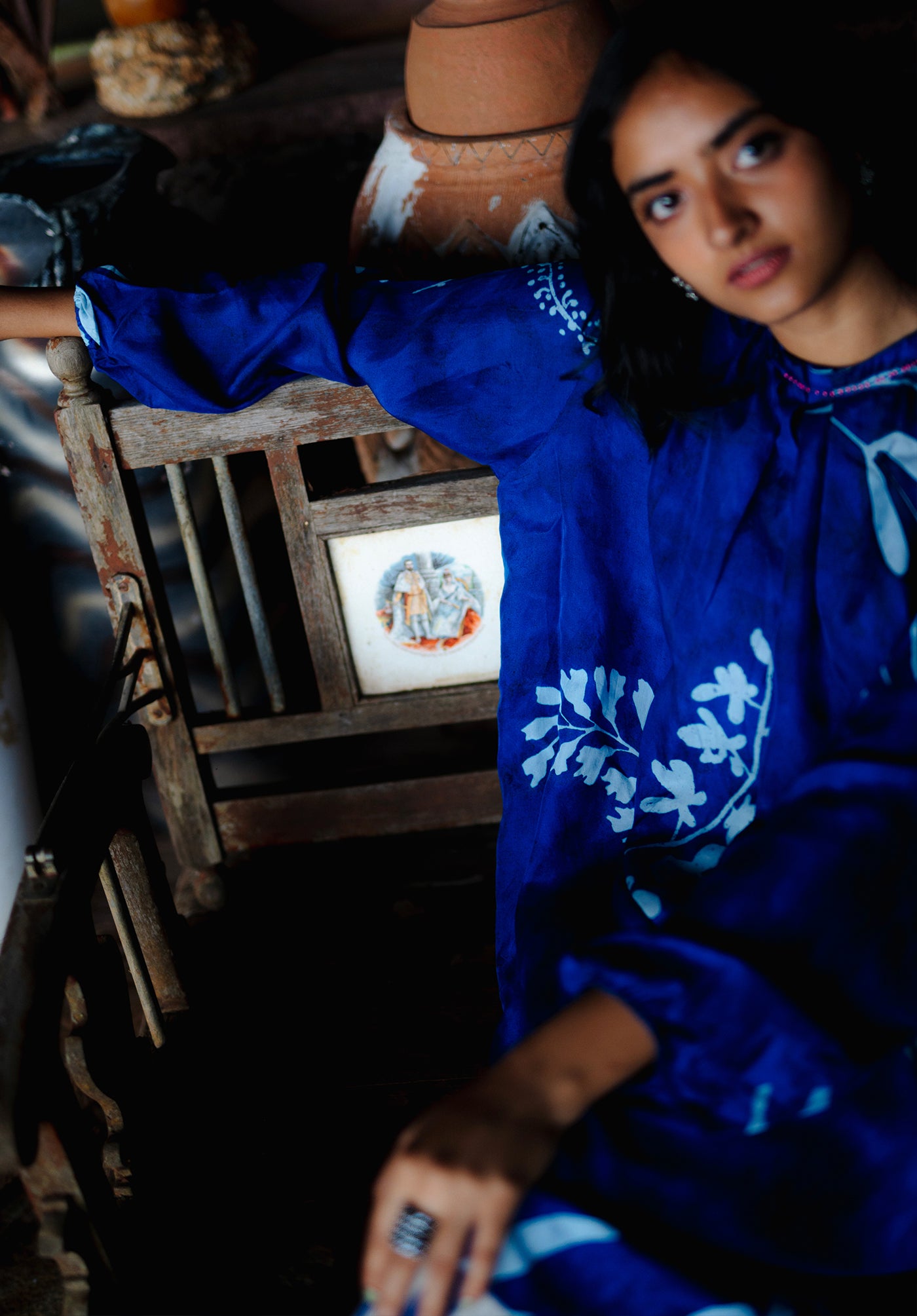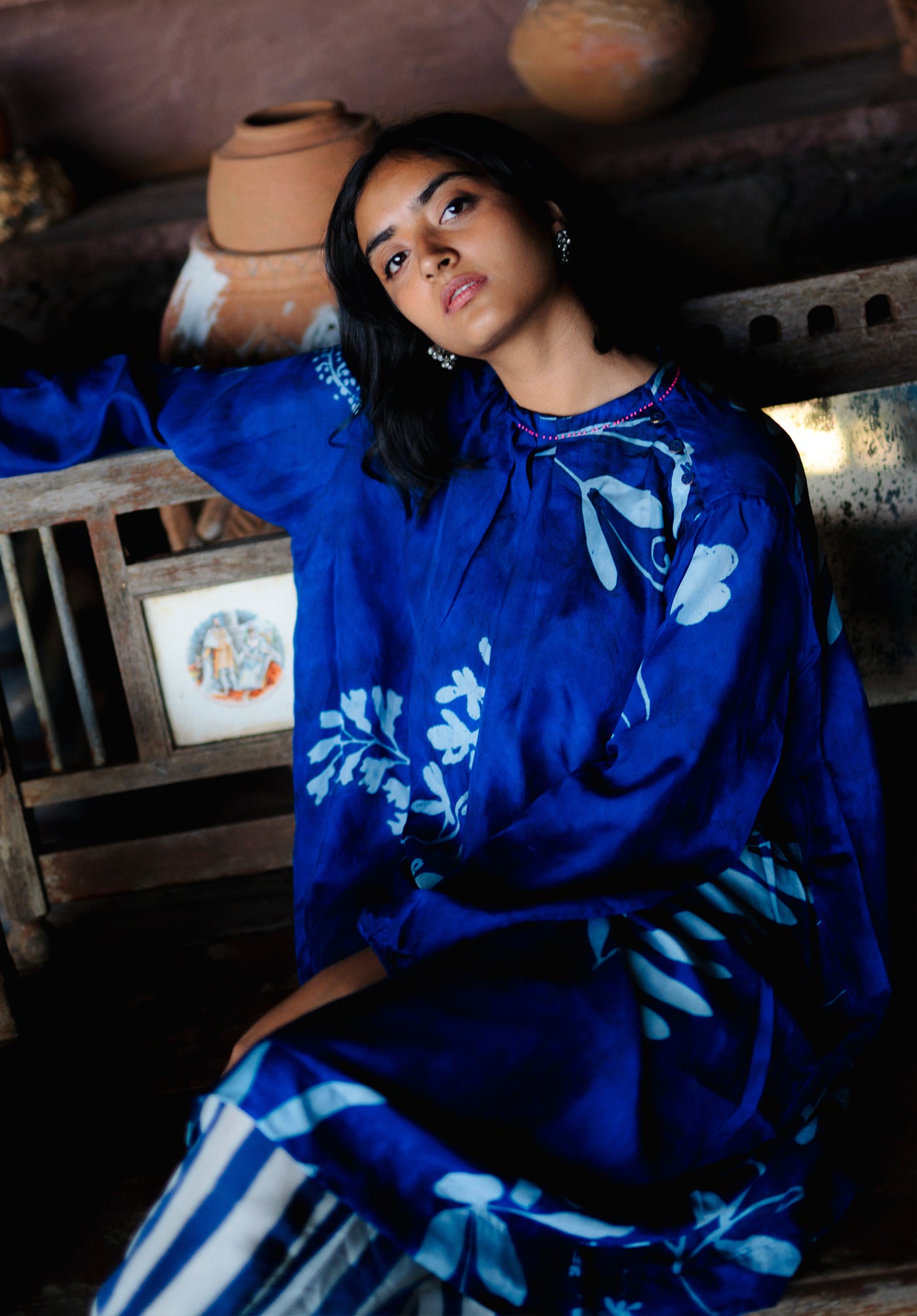 The set in a striking royal blue color features massive handpainted leaves of distinct shapes and designs. The pants are handblock printed in pure silk on a blue base with white stripes.