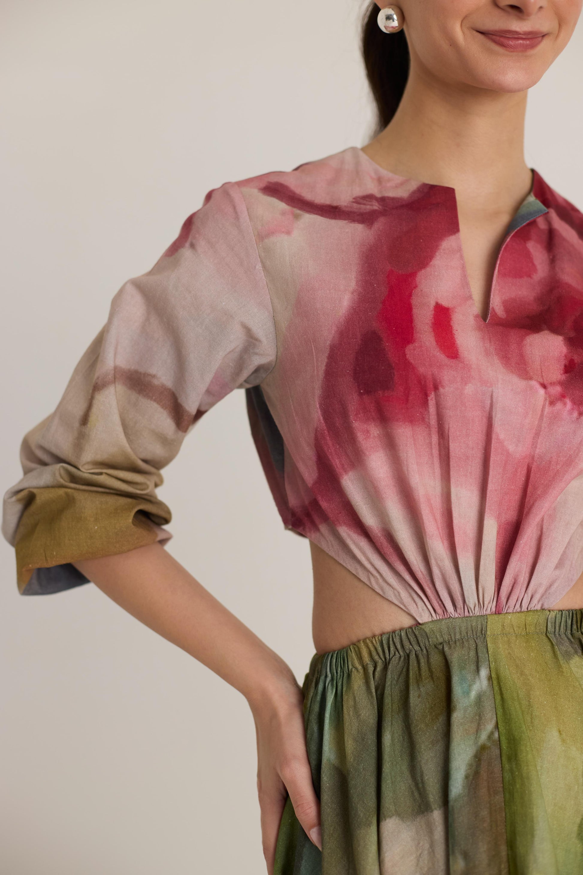 This captivating maxi dress features an artistic abstract floral print, resembling hand-painted brushstrokes in lush greens, deep reds, and muted neutrals. The dress is designed with a flowy silhouette and an elegant side cutout, adding a modern, playful touch while enhancing the waistline. Crafted from a lightweight, breathable fabric, it ensures effortless movement and comfort.
