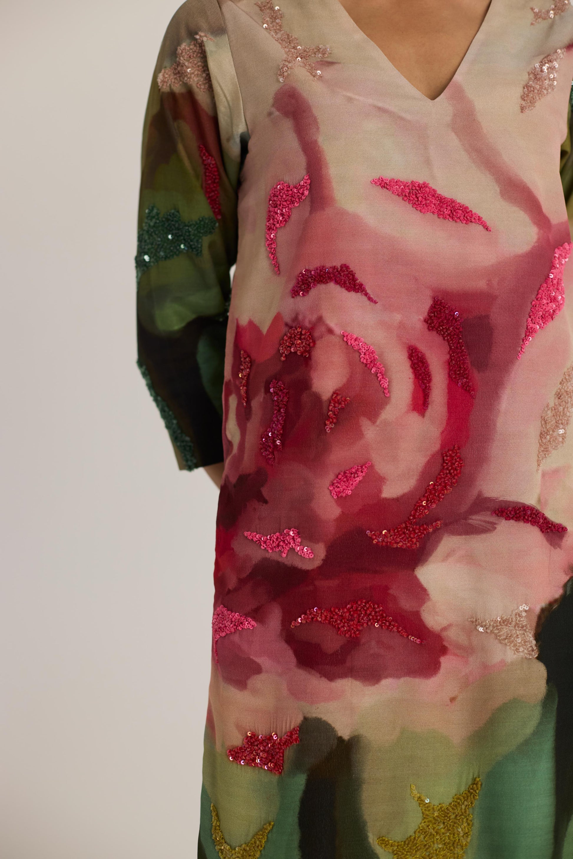 A sophisticated and artistic ensemble, this V-neck kaftan features an ethereal hand-painted floral print with oversized blooming roses in rich hues of deep red, blush pink, and earthy green. The abstract watercolor-like design gives it a dreamy and elegant appeal.