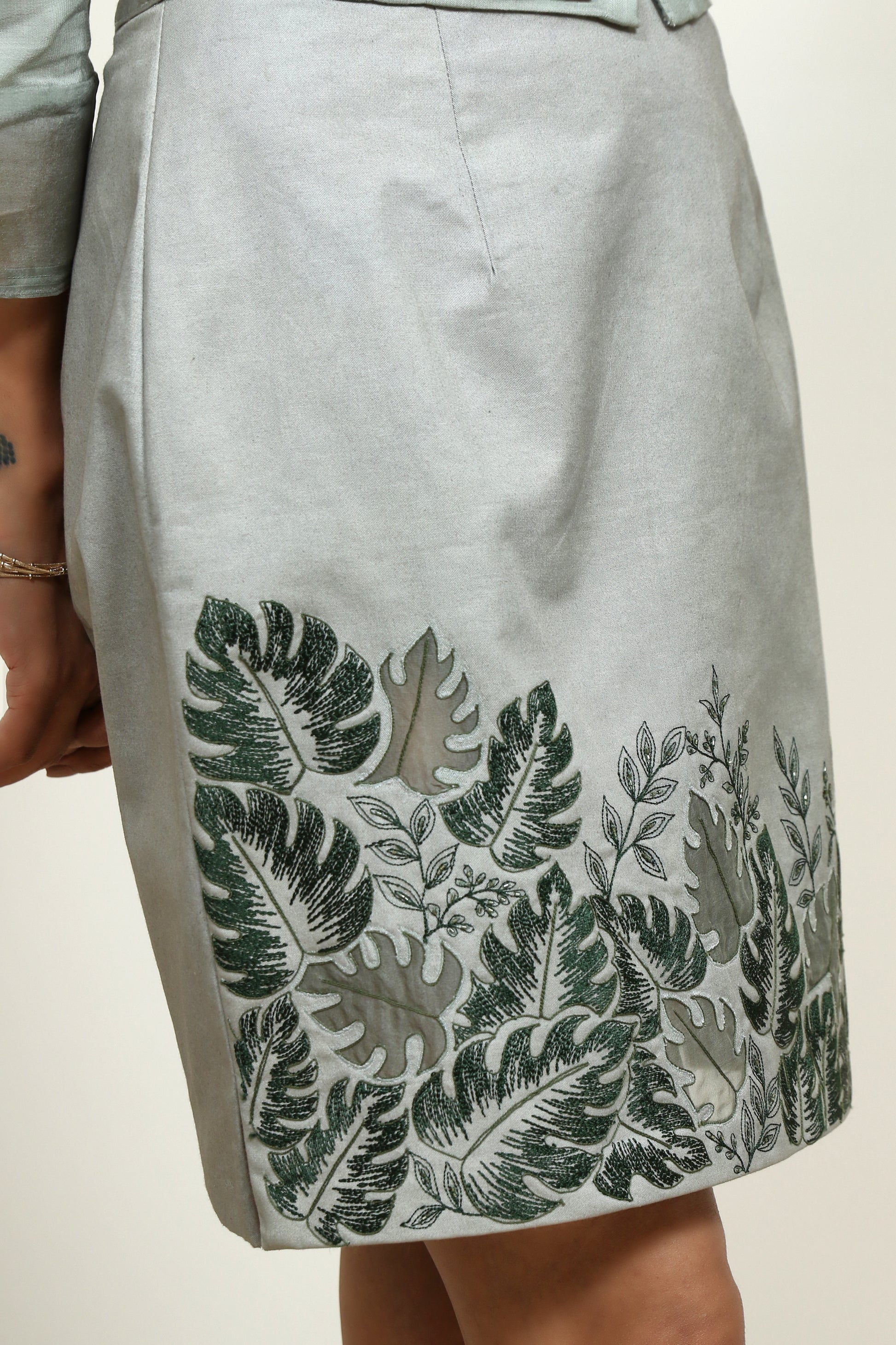 Sage green skirt featuring tonal foliage embroidery with organza insert details
