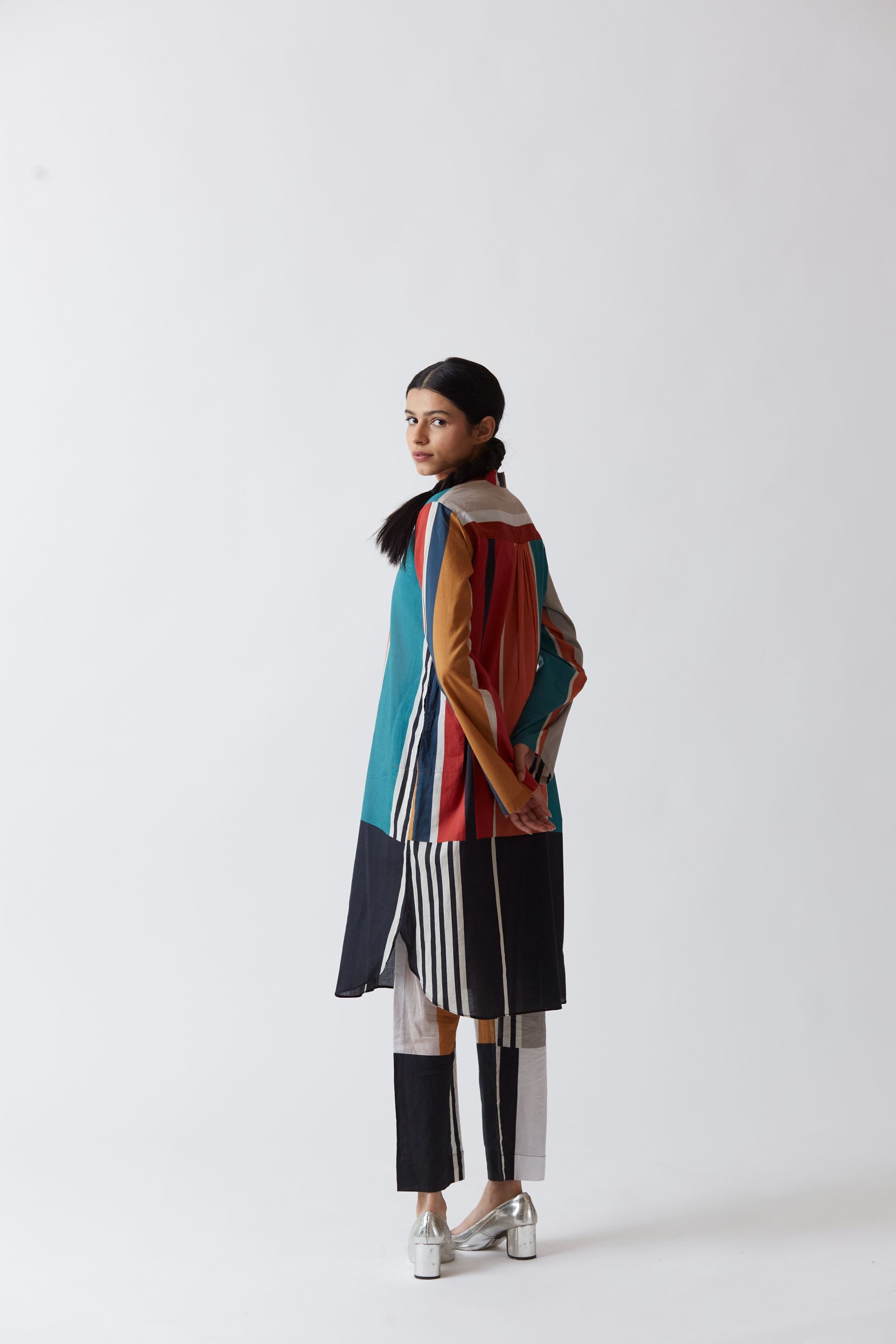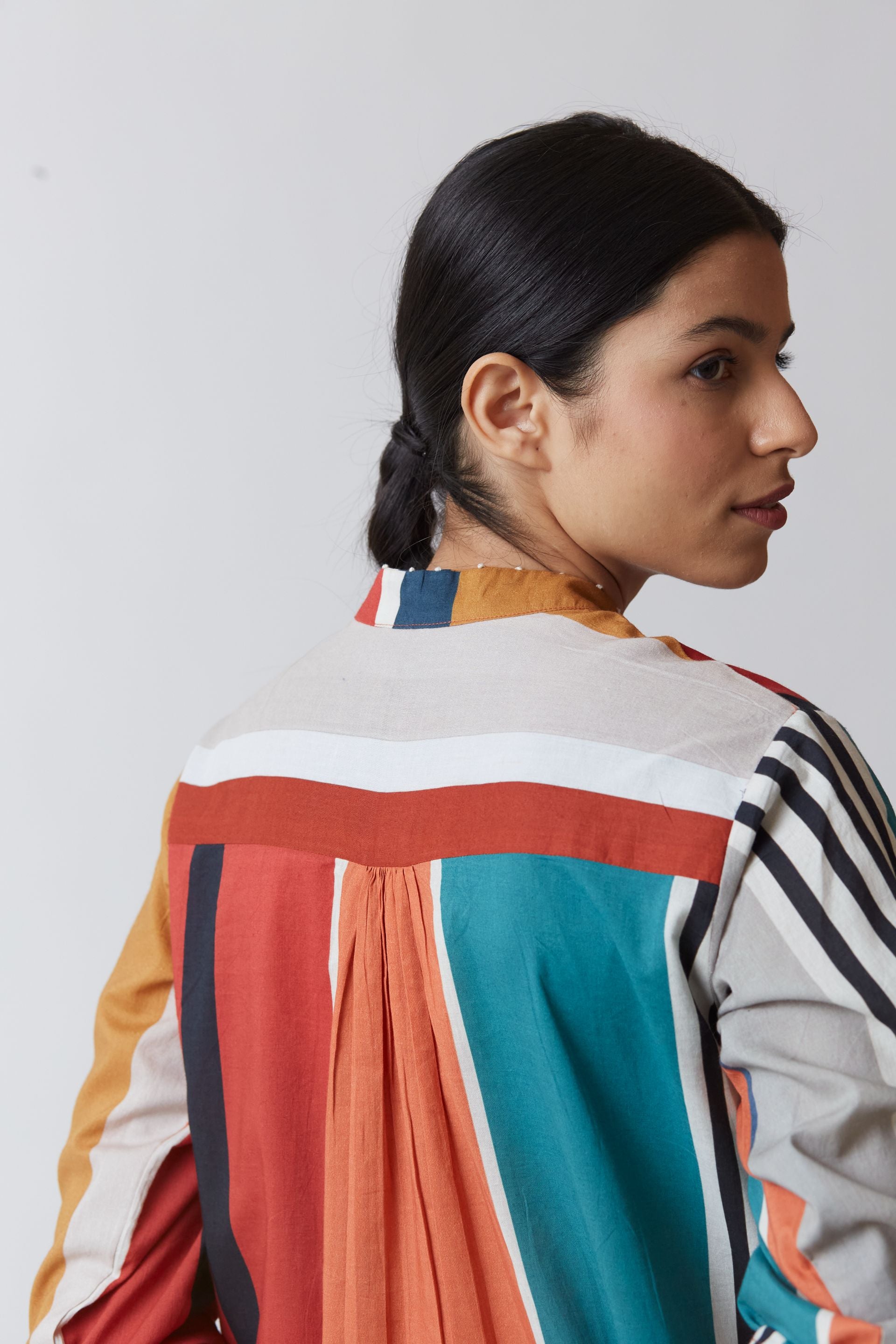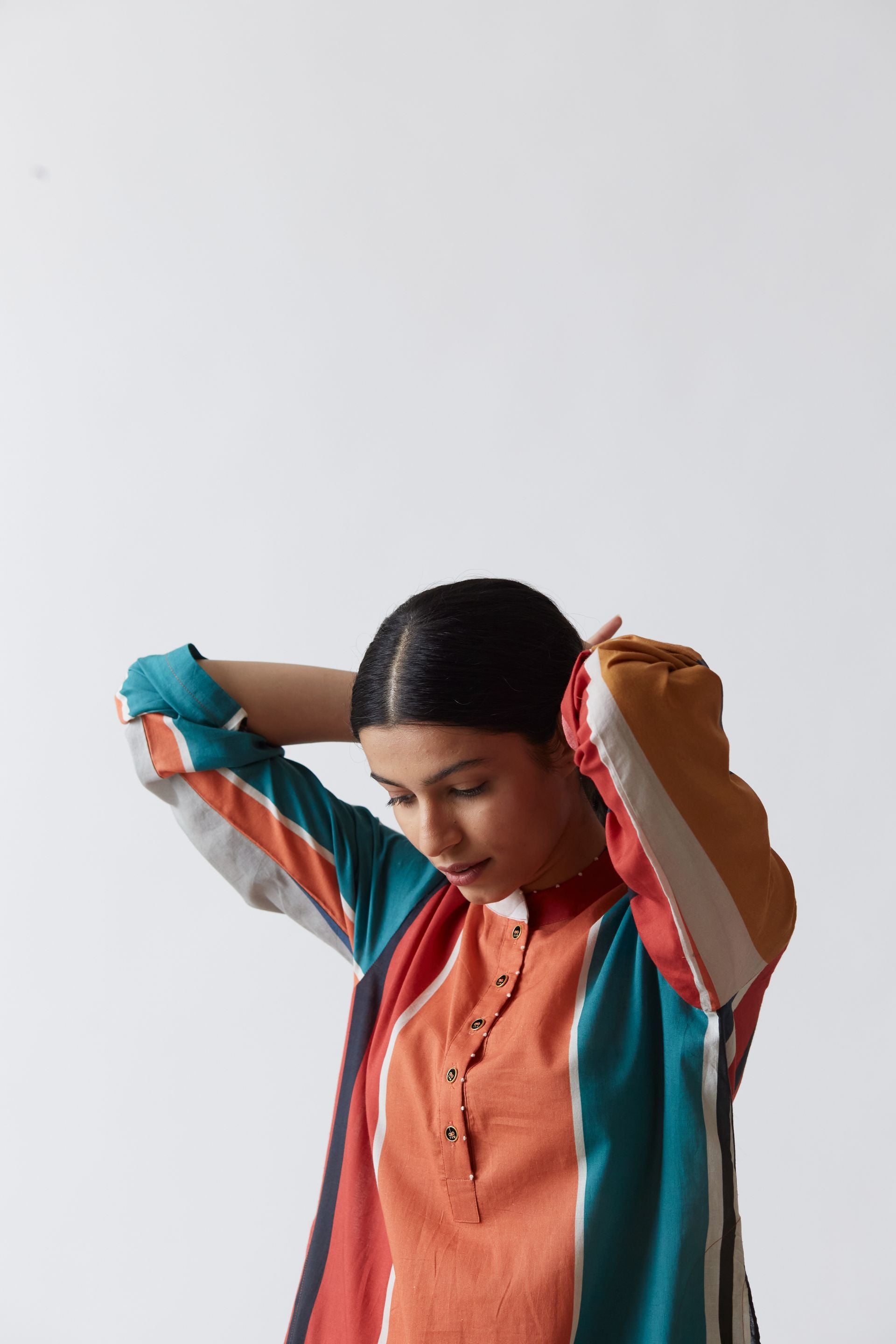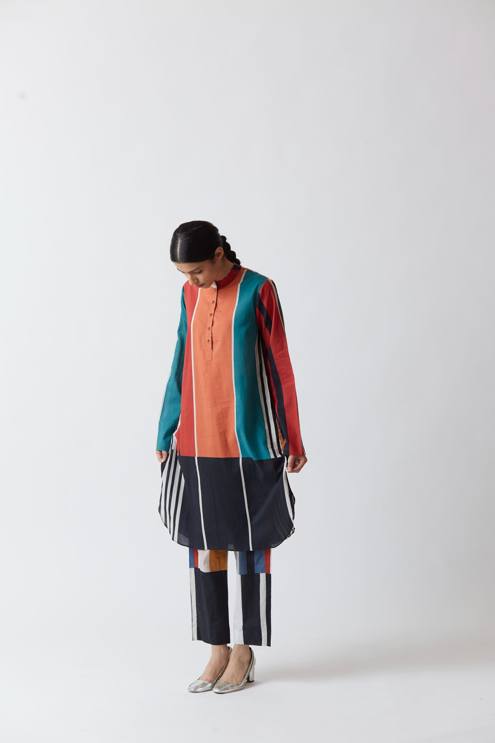 Cotton printed kurta in bold stripes with straight full sleeves. It is