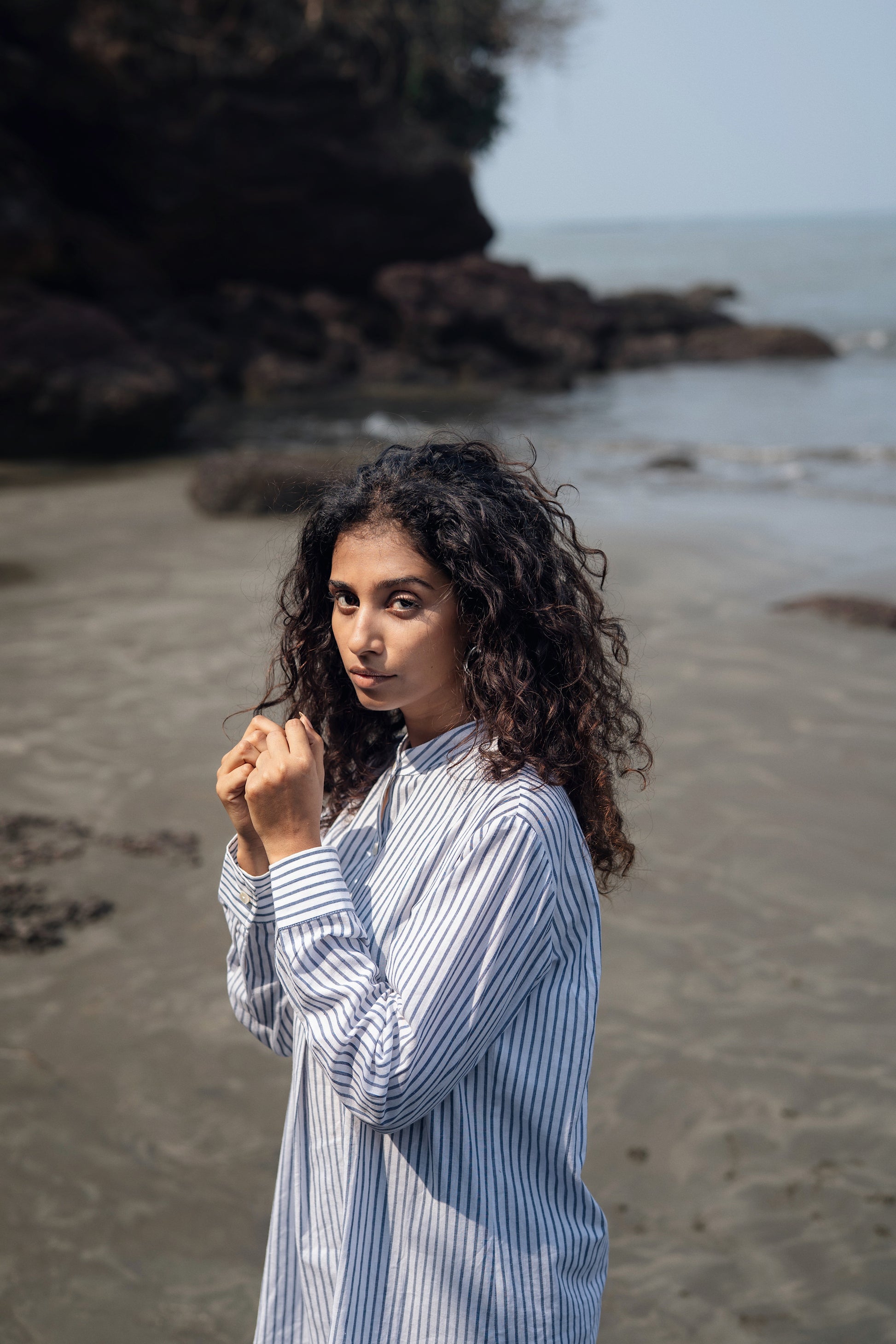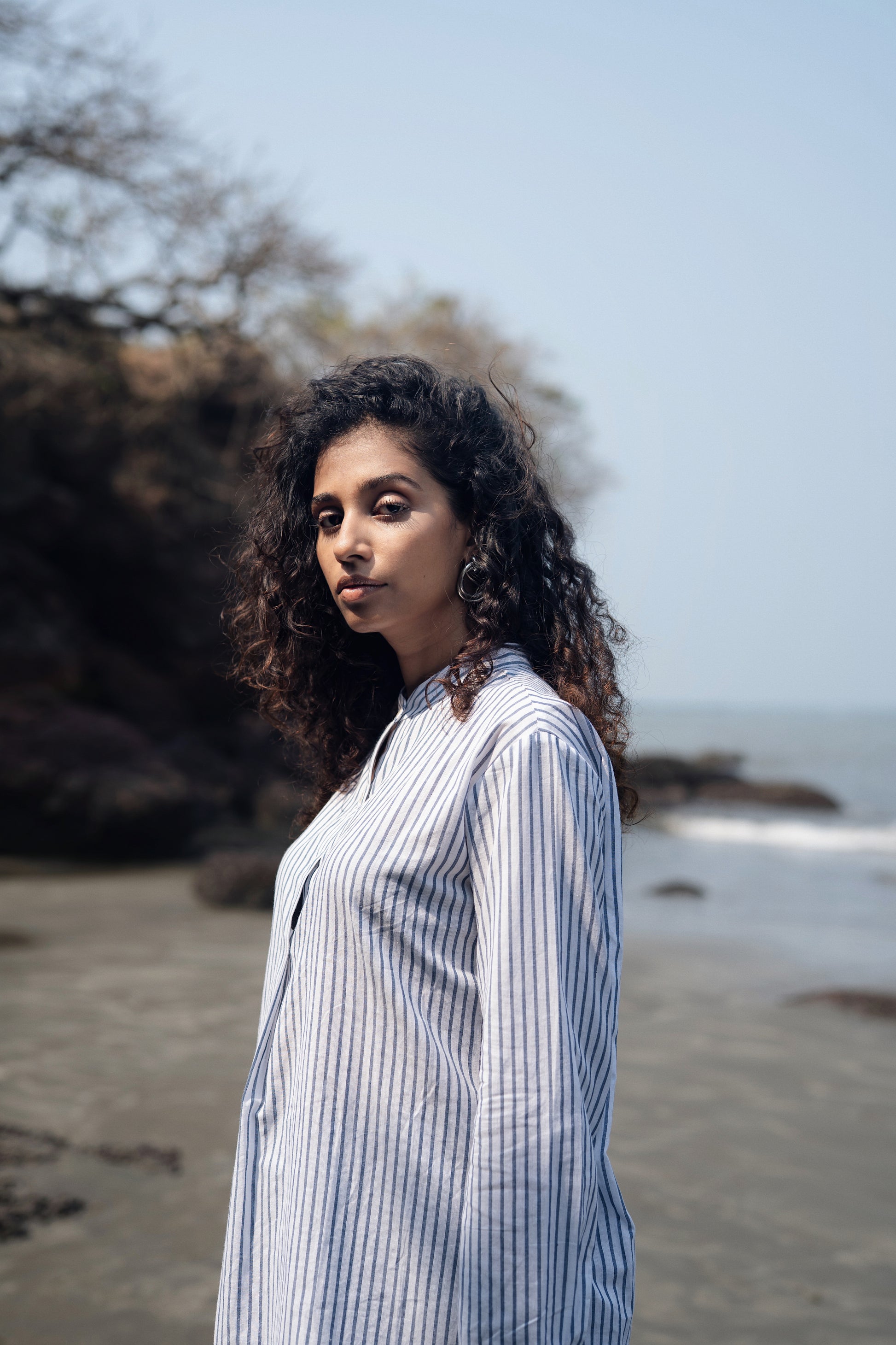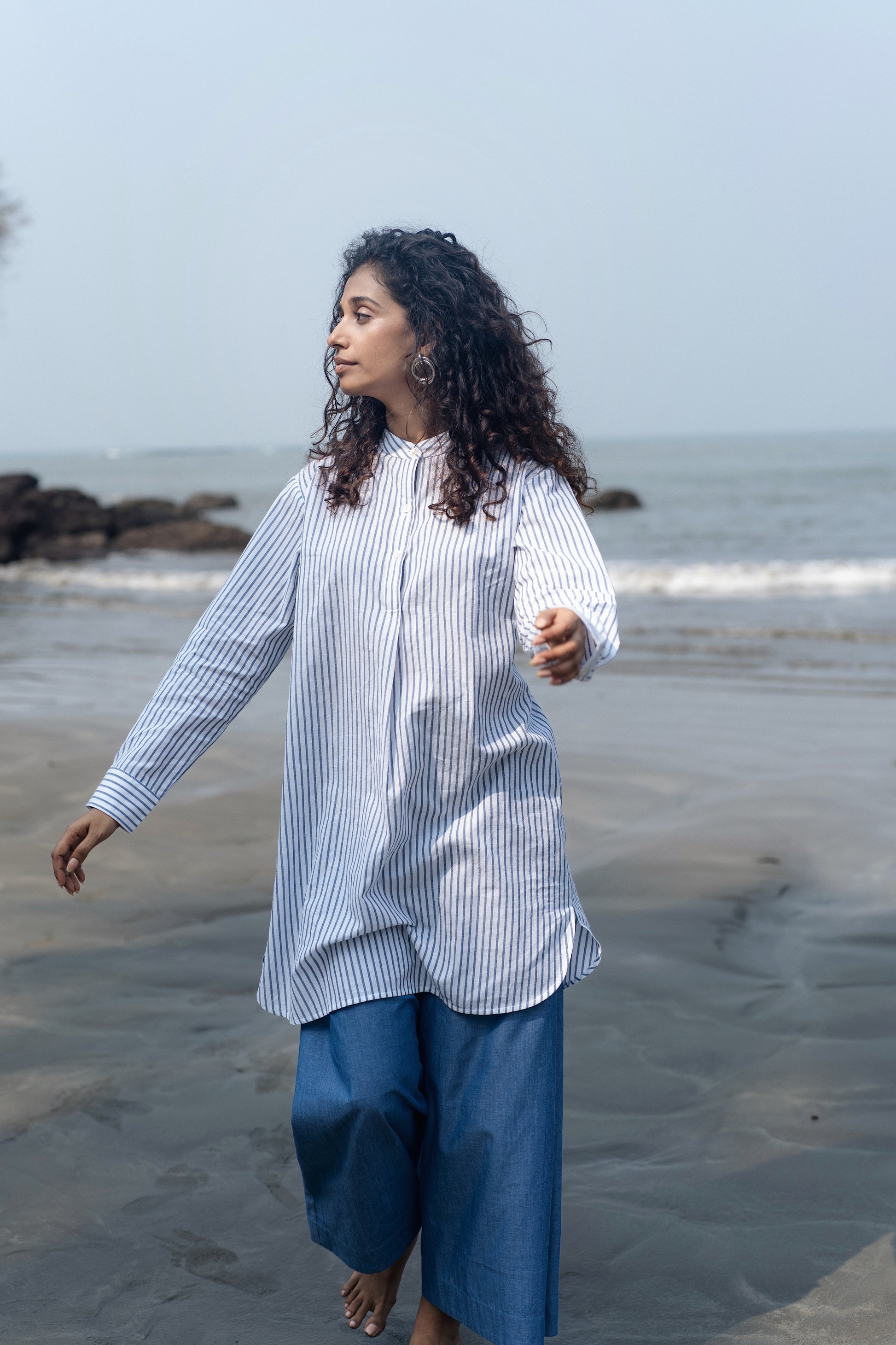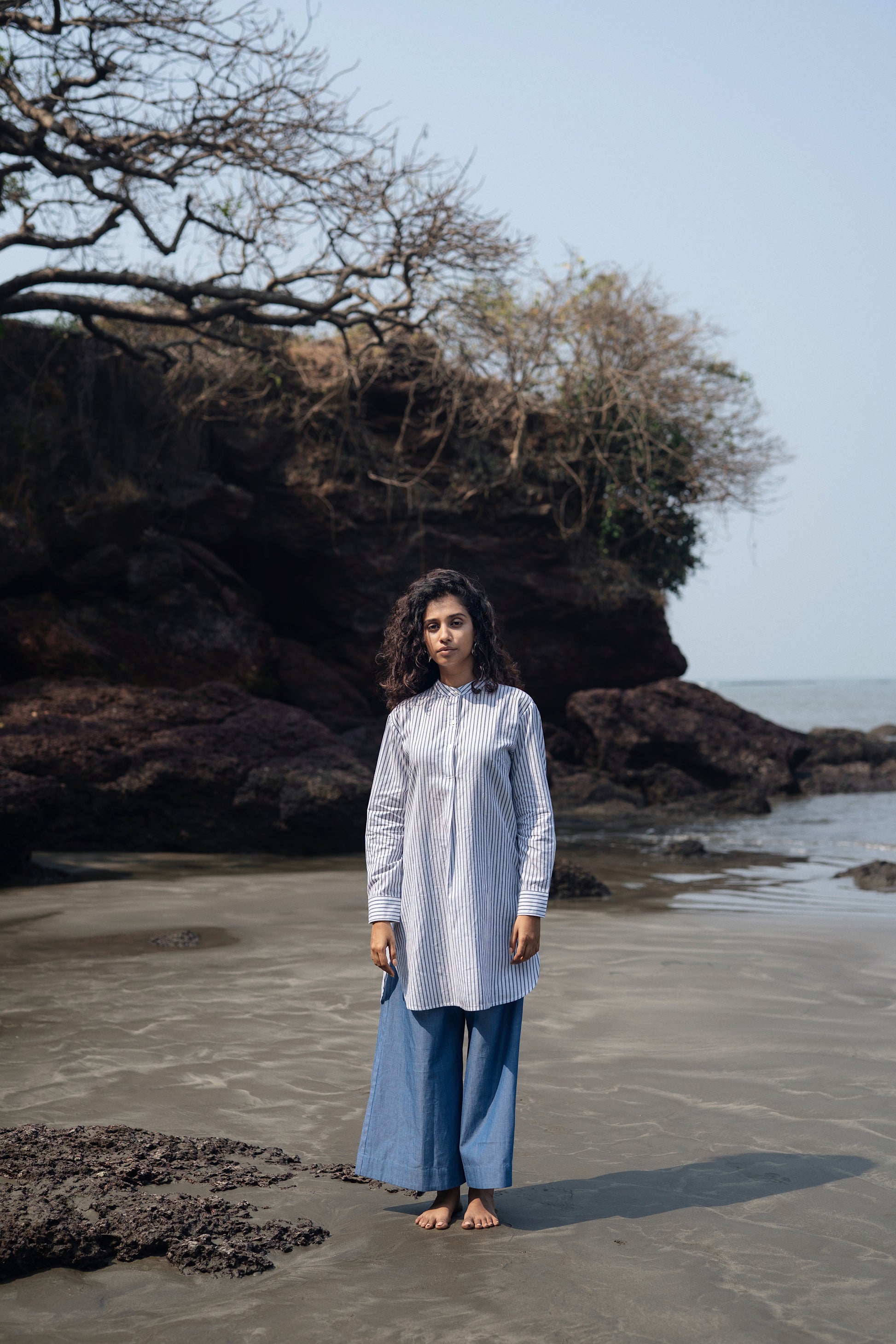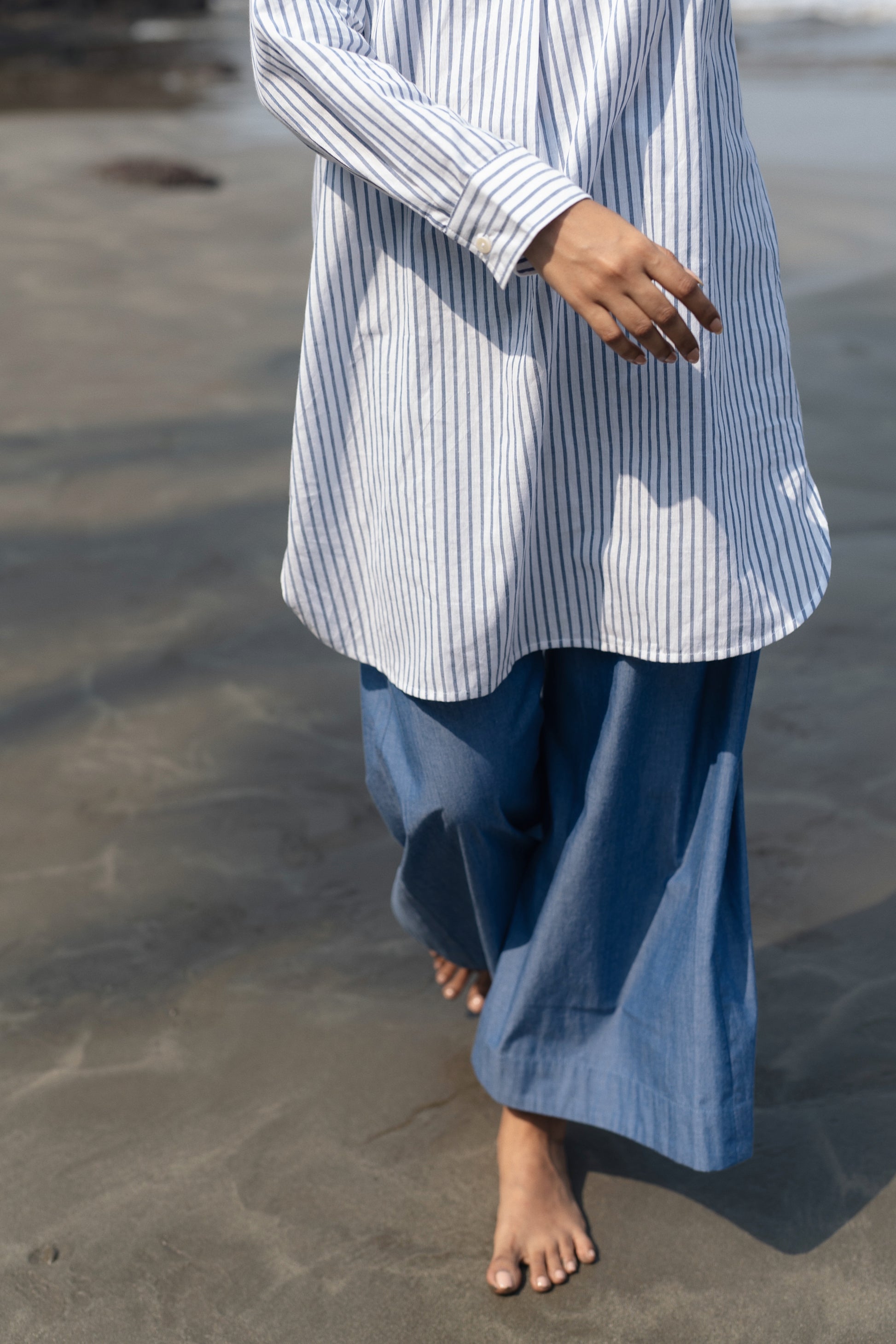 Tori Coord set is made from our yarn dyed madras striped short kurta with cotton chambray denim shade cullottes.