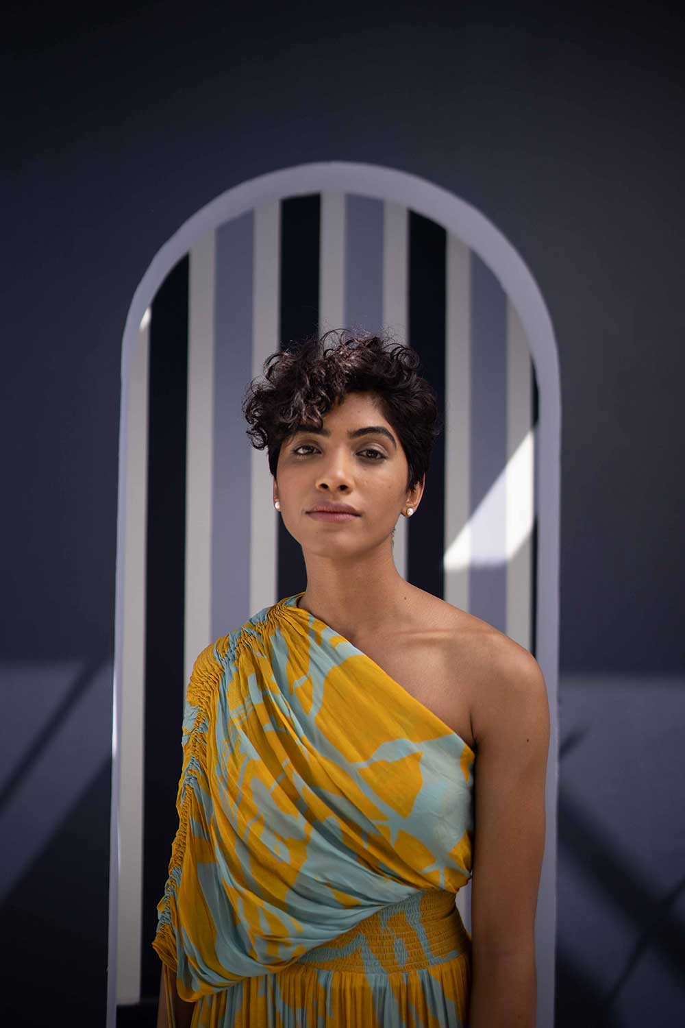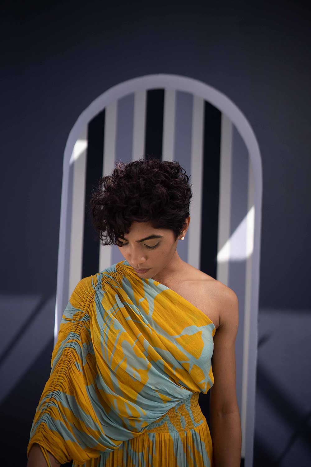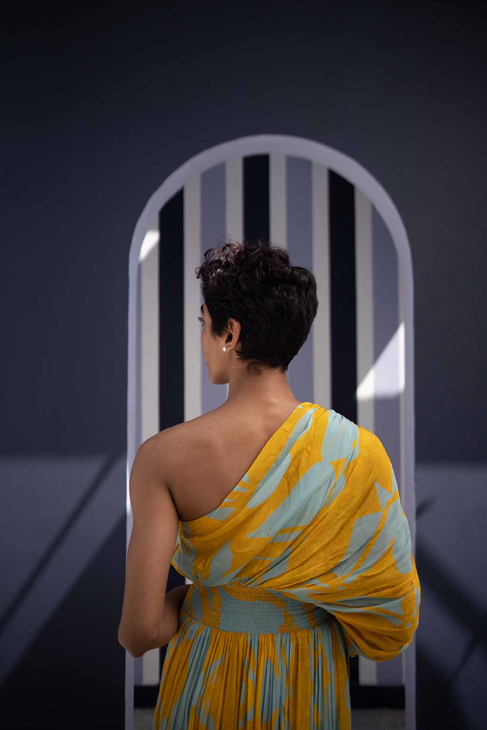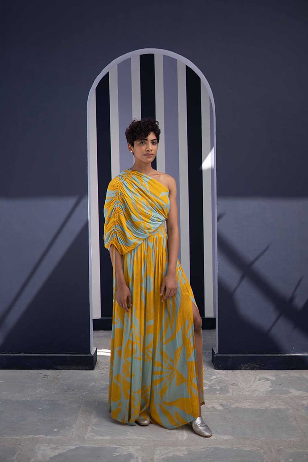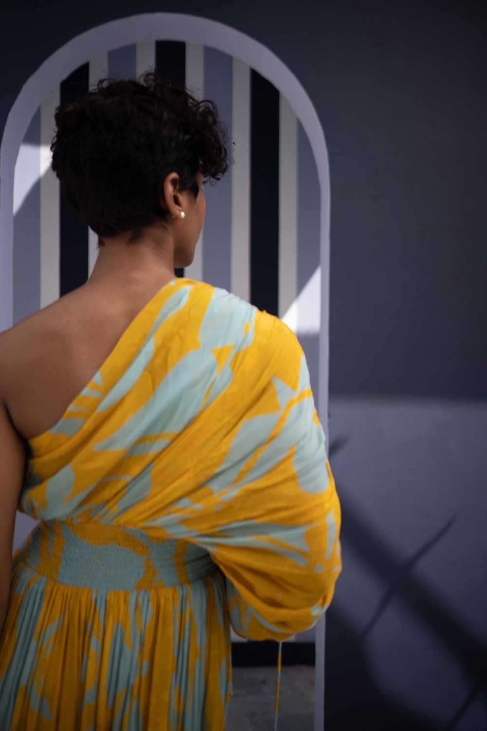 The dress has an adjustable dori on one sleeve and an elasticated band on the waist.