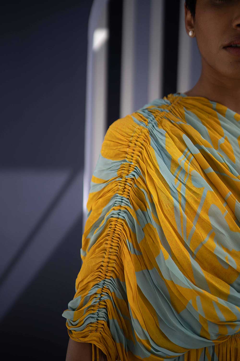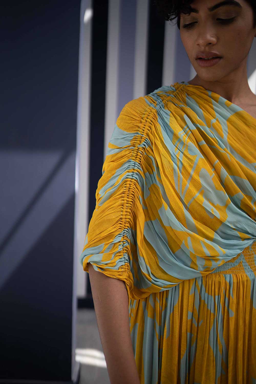 The dress is made in crepe.