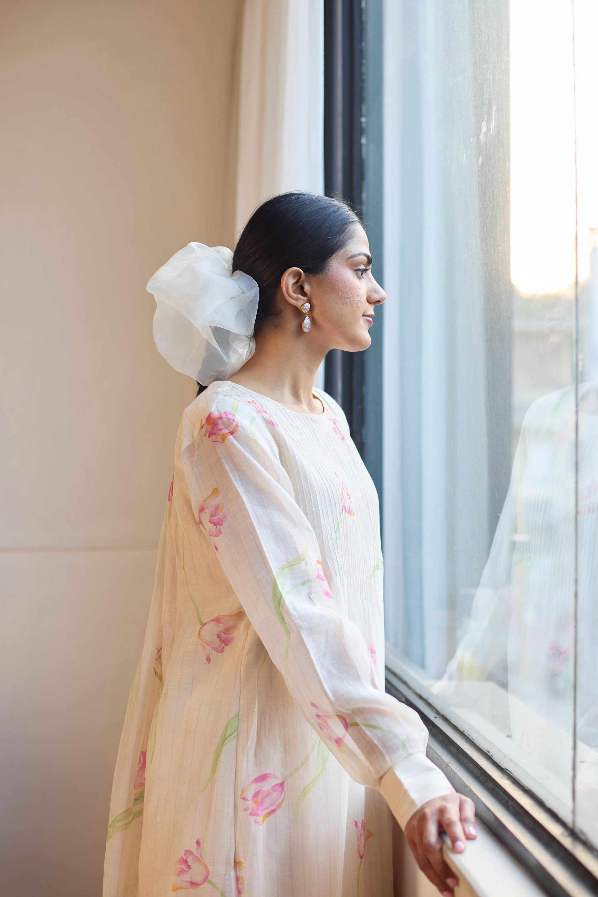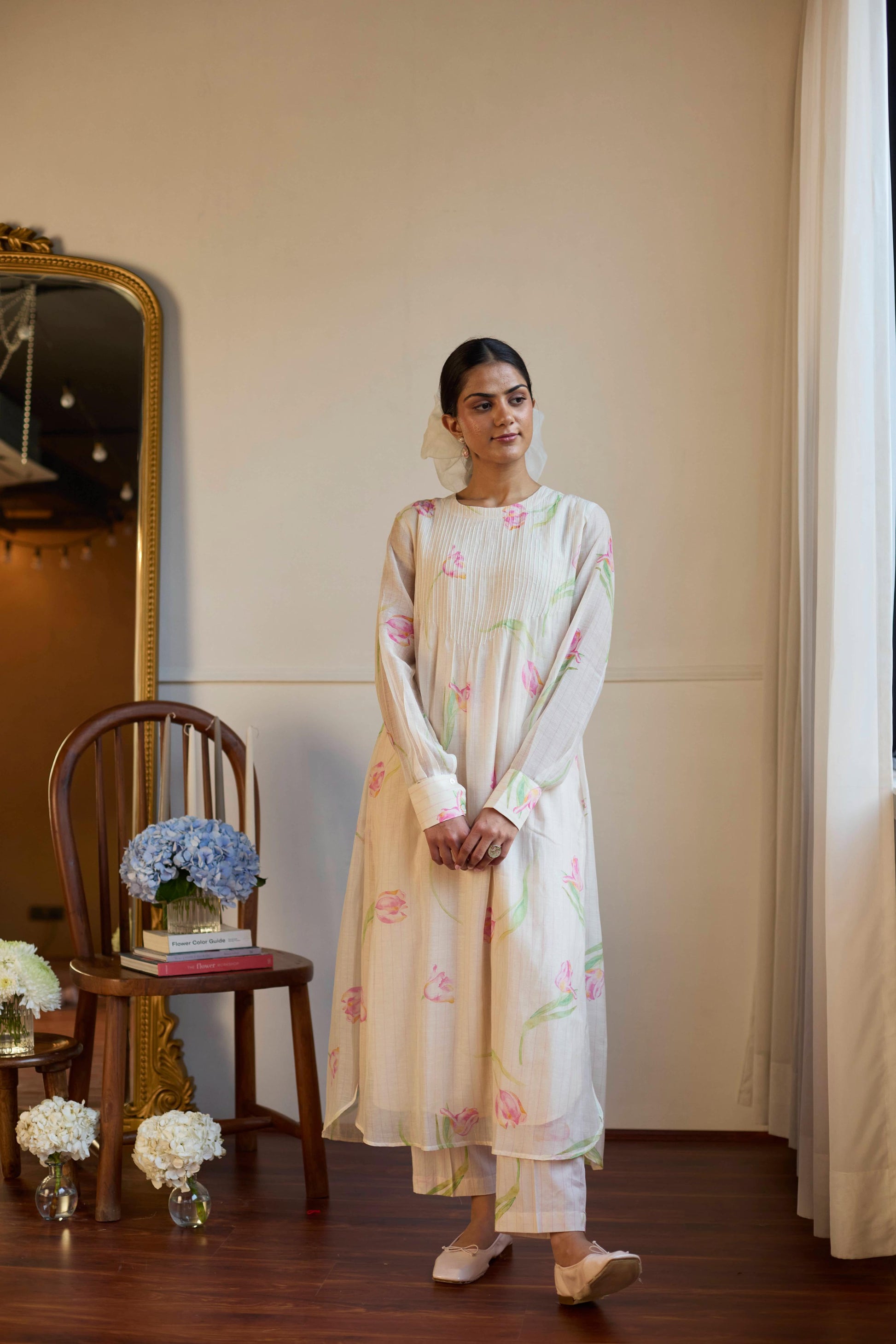 The sleeves kissed with cuffs, neat and refined, Paired with cotton tulip print trousers, bright, Where artful detail meets nature's bloom, A perfect balance of comfort and light.