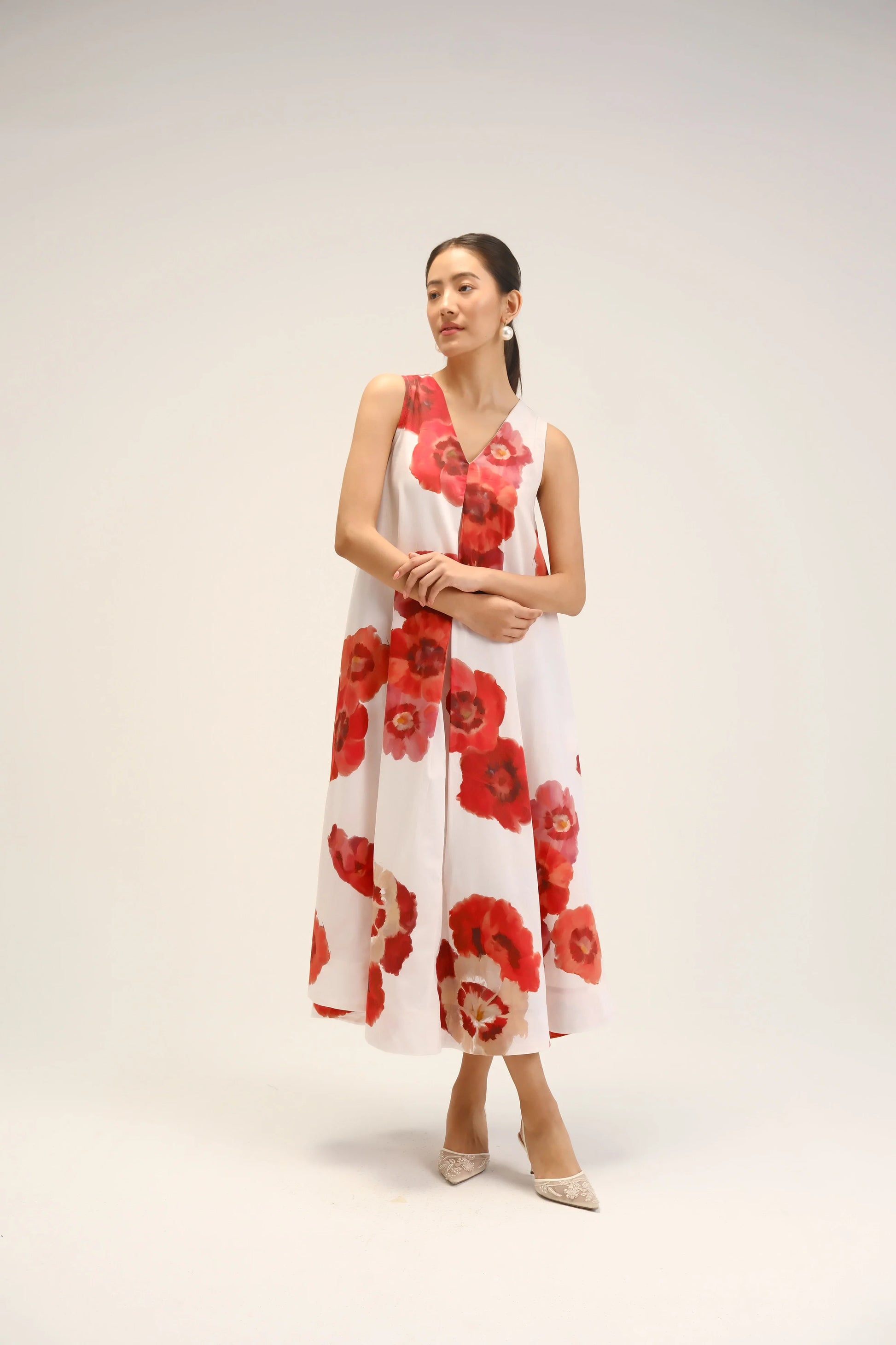This dress features a bold and artistic floral print, designed with large red and crimson blooms splashed across a pristine white backdrop. The poppy-inspired florals bring a fresh, romantic charm, perfect for both daytime events and elegant evenings.