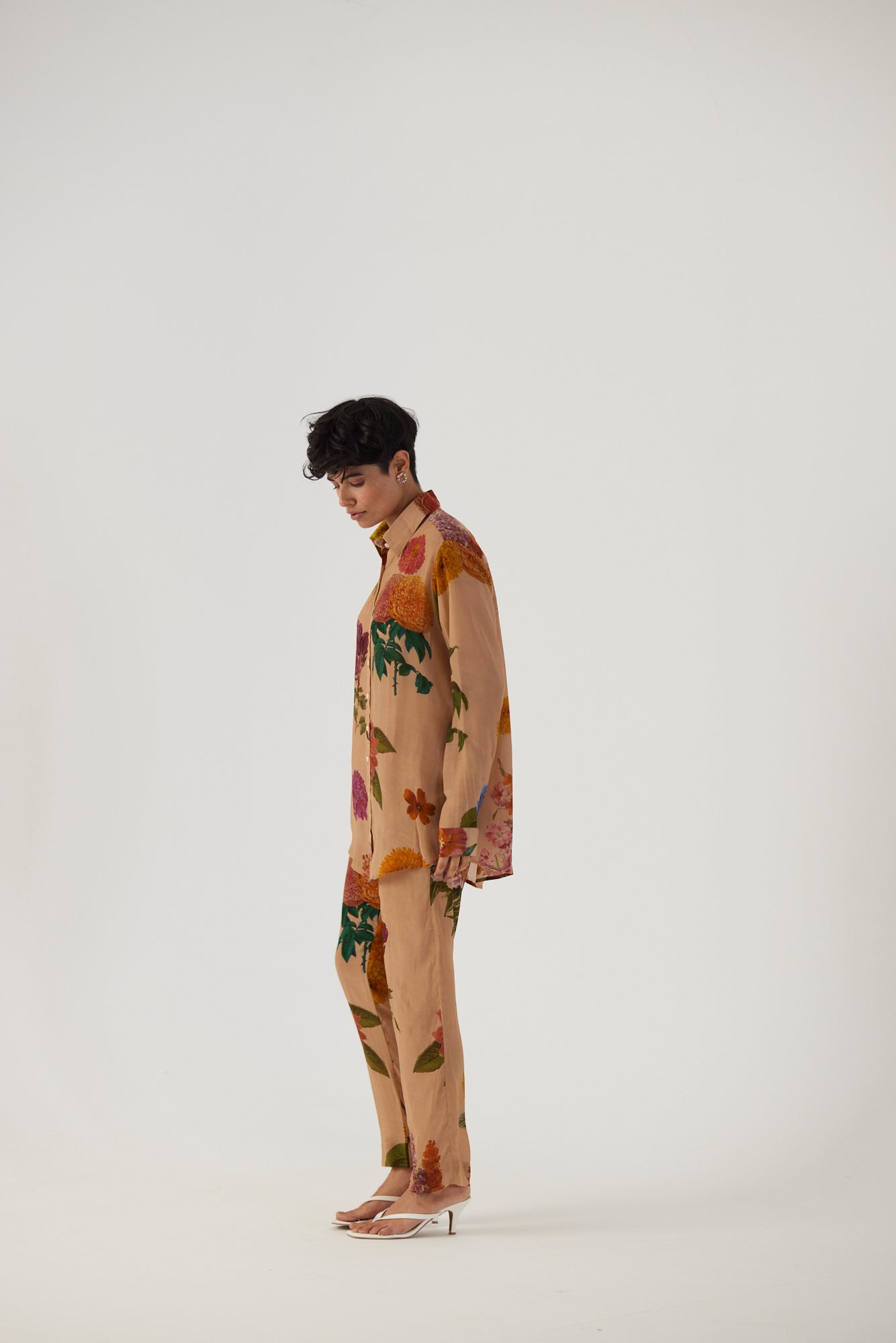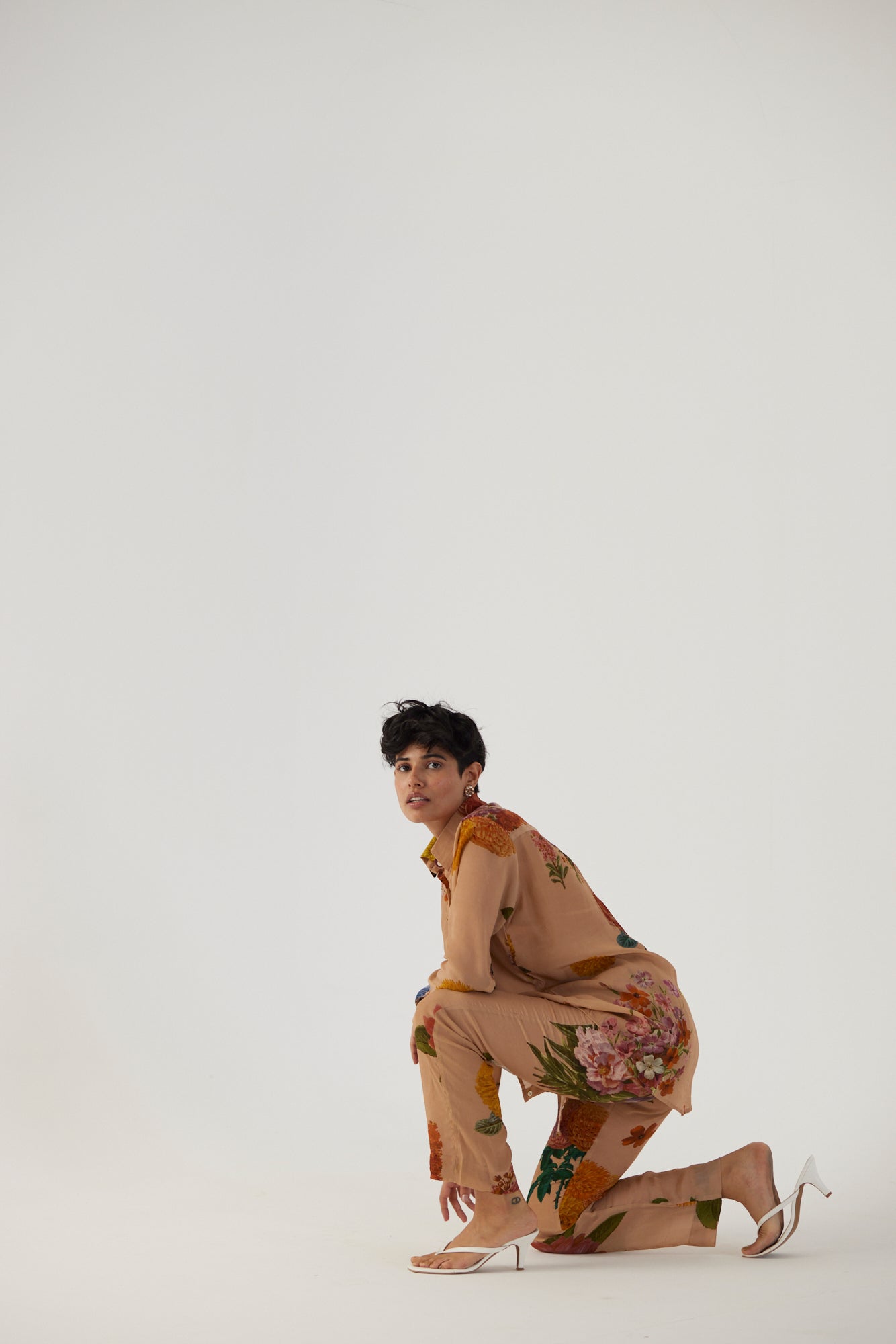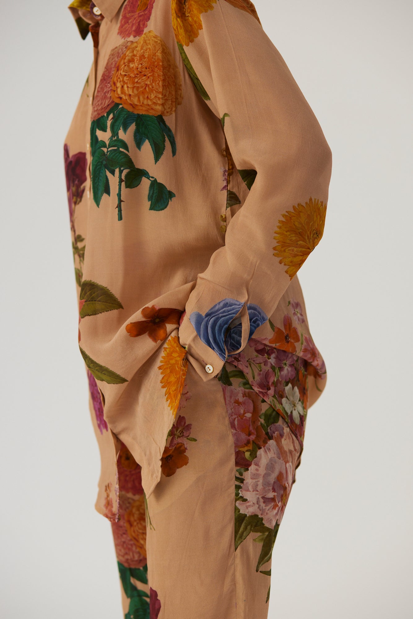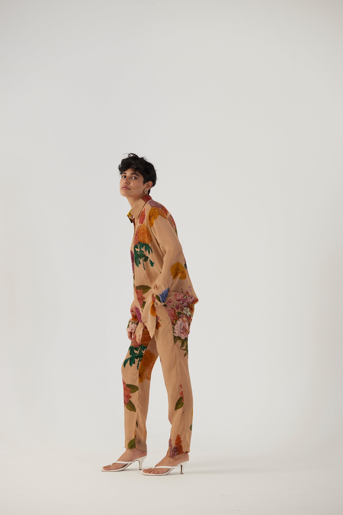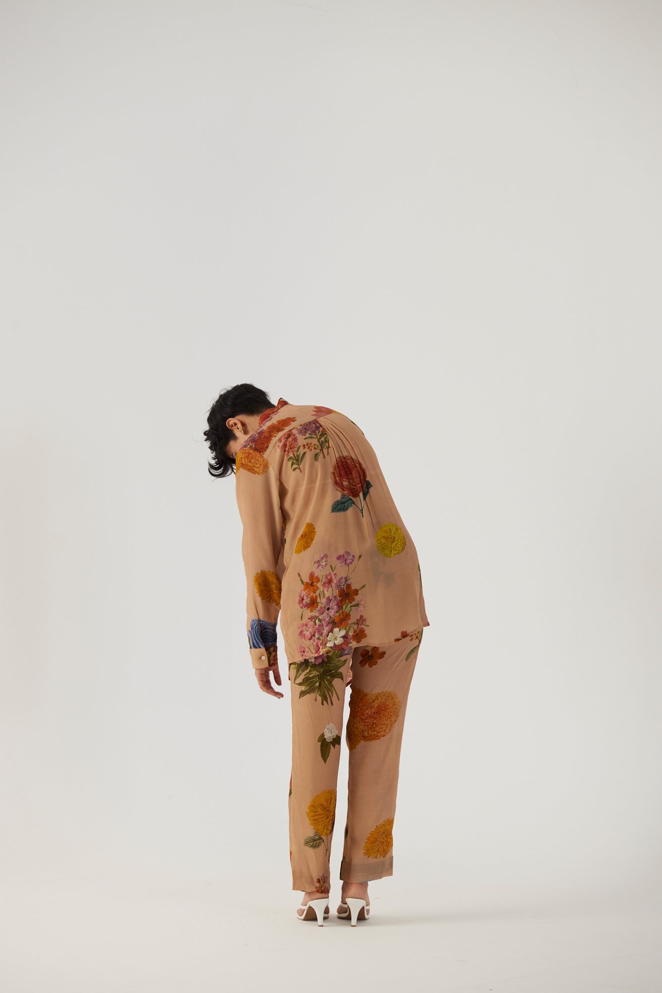 The vintage garden print inspired from an old botanical tapestry is just a breath-taking collection of a botanical garden. Watercolor florals and leaves s are playfully dancing on a beige background. All with the touch of vintage. The set includes a button down shirt with back gathers and straight pants.
