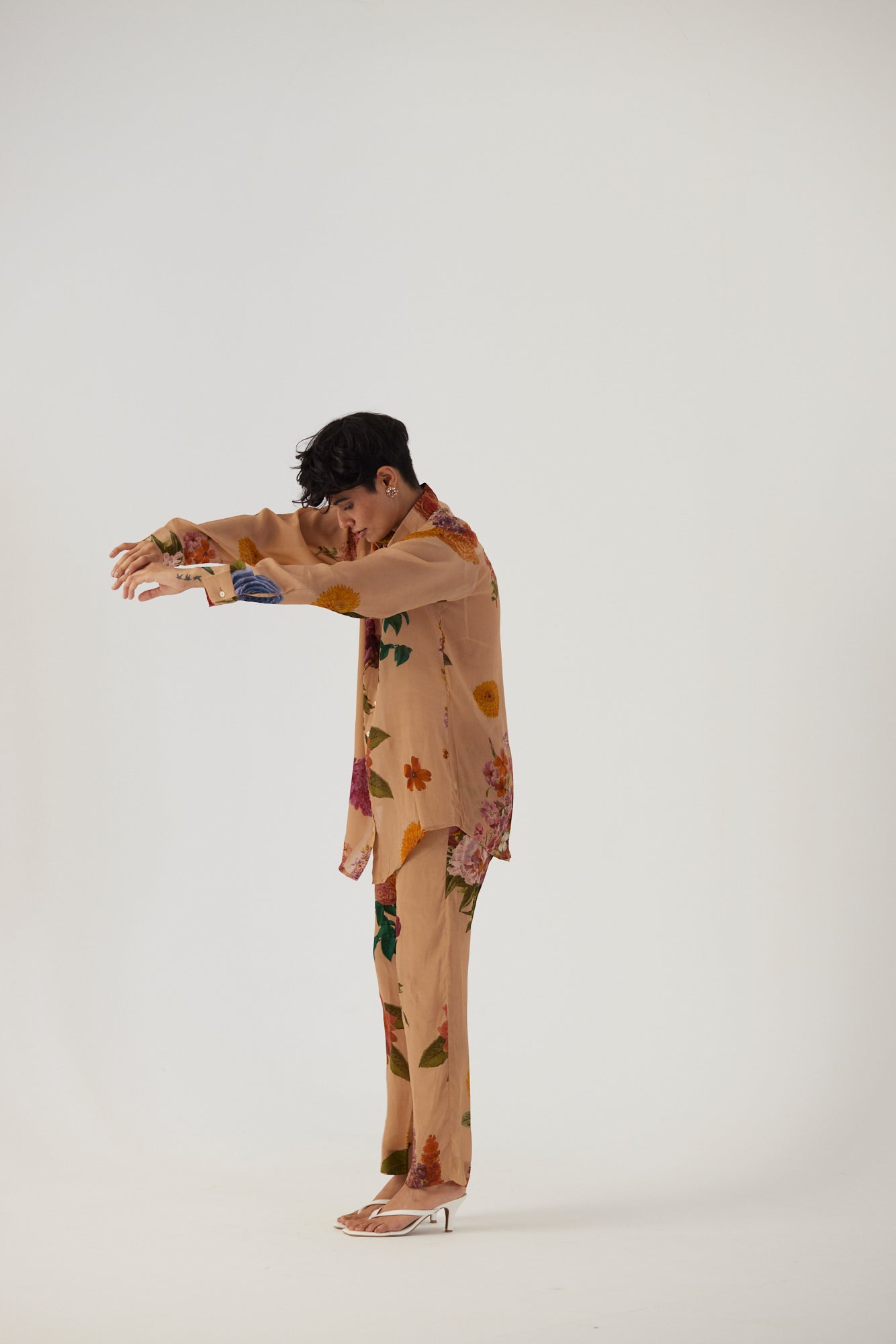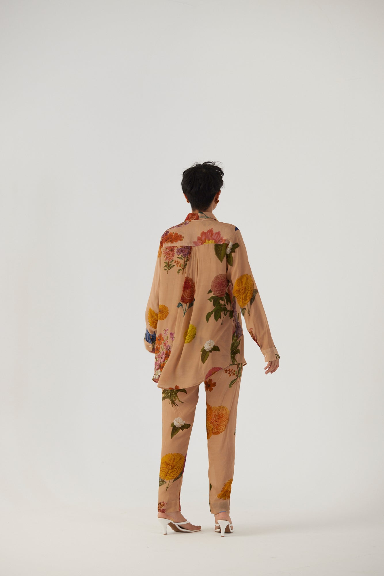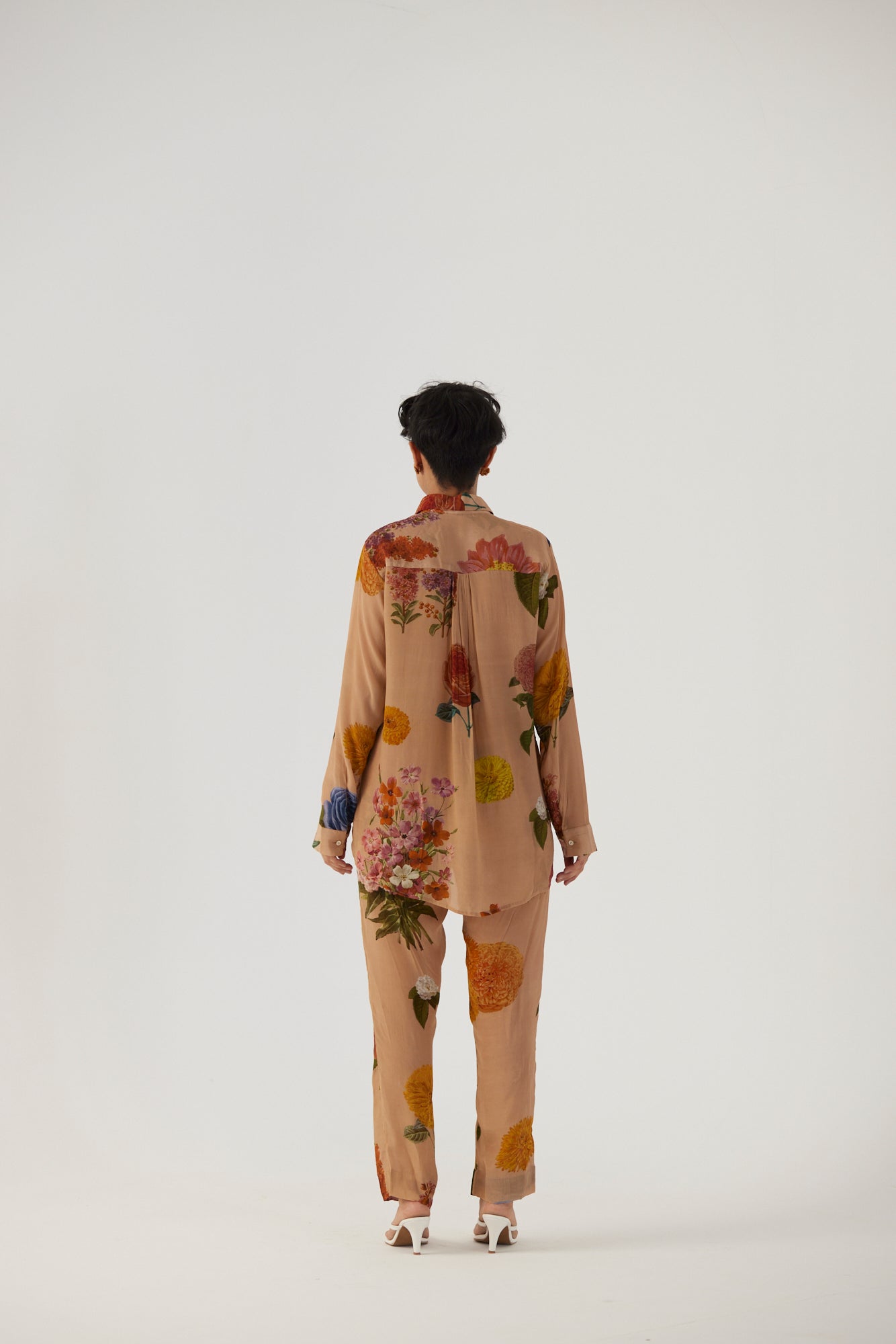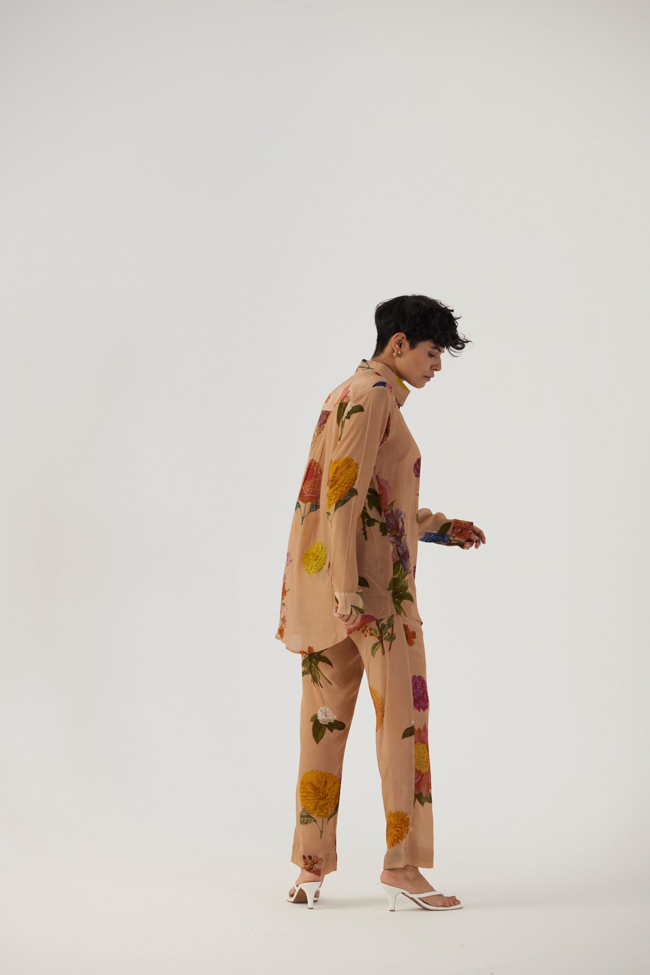 The vintage garden print inspired from an old botanical tapestry is just a breath-taking collection of a botanical garden. Watercolor florals and leaves s are playfully dancing on a beige background. All with the touch of vintage. The set includes a button down shirt with back gathers and straight pants.