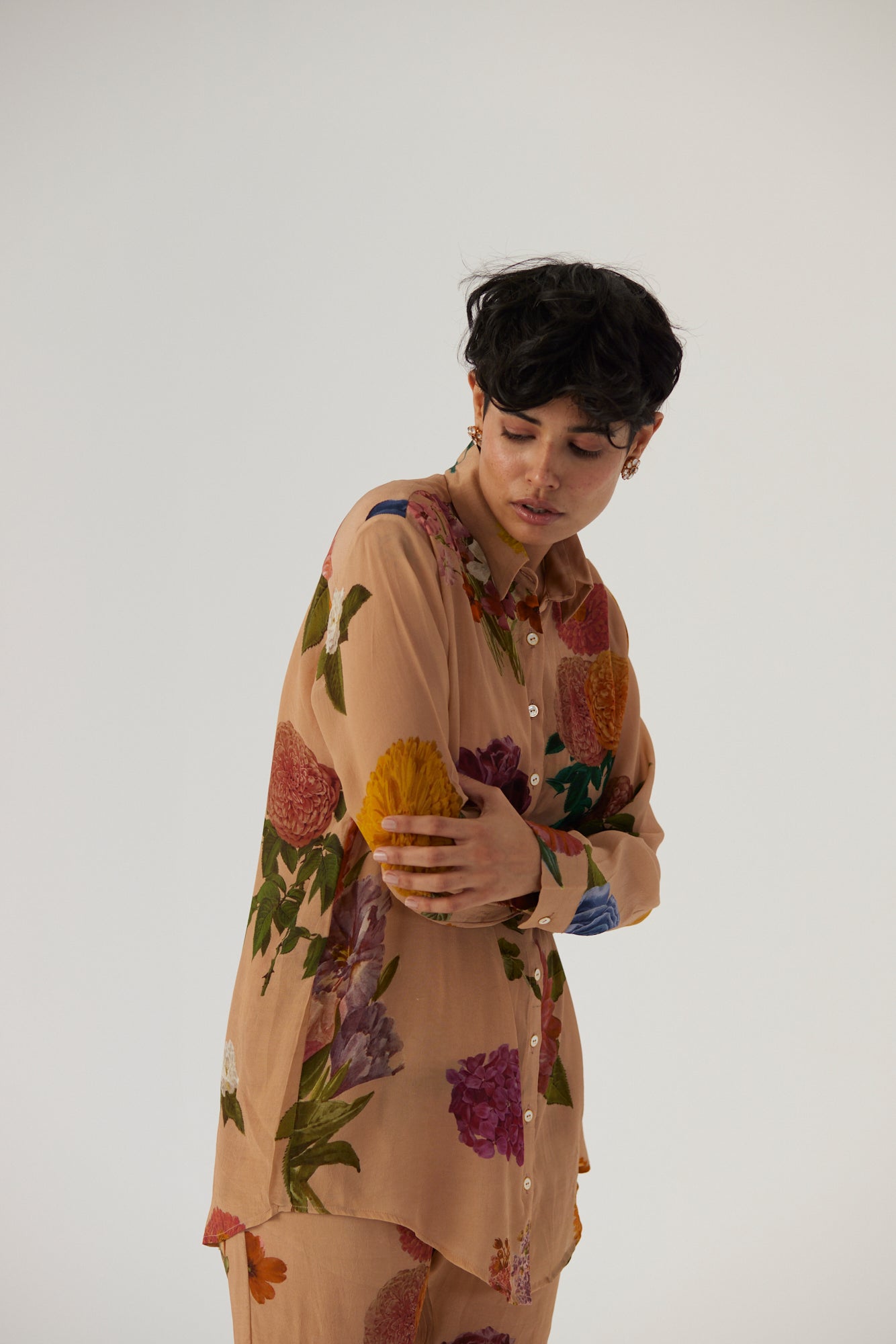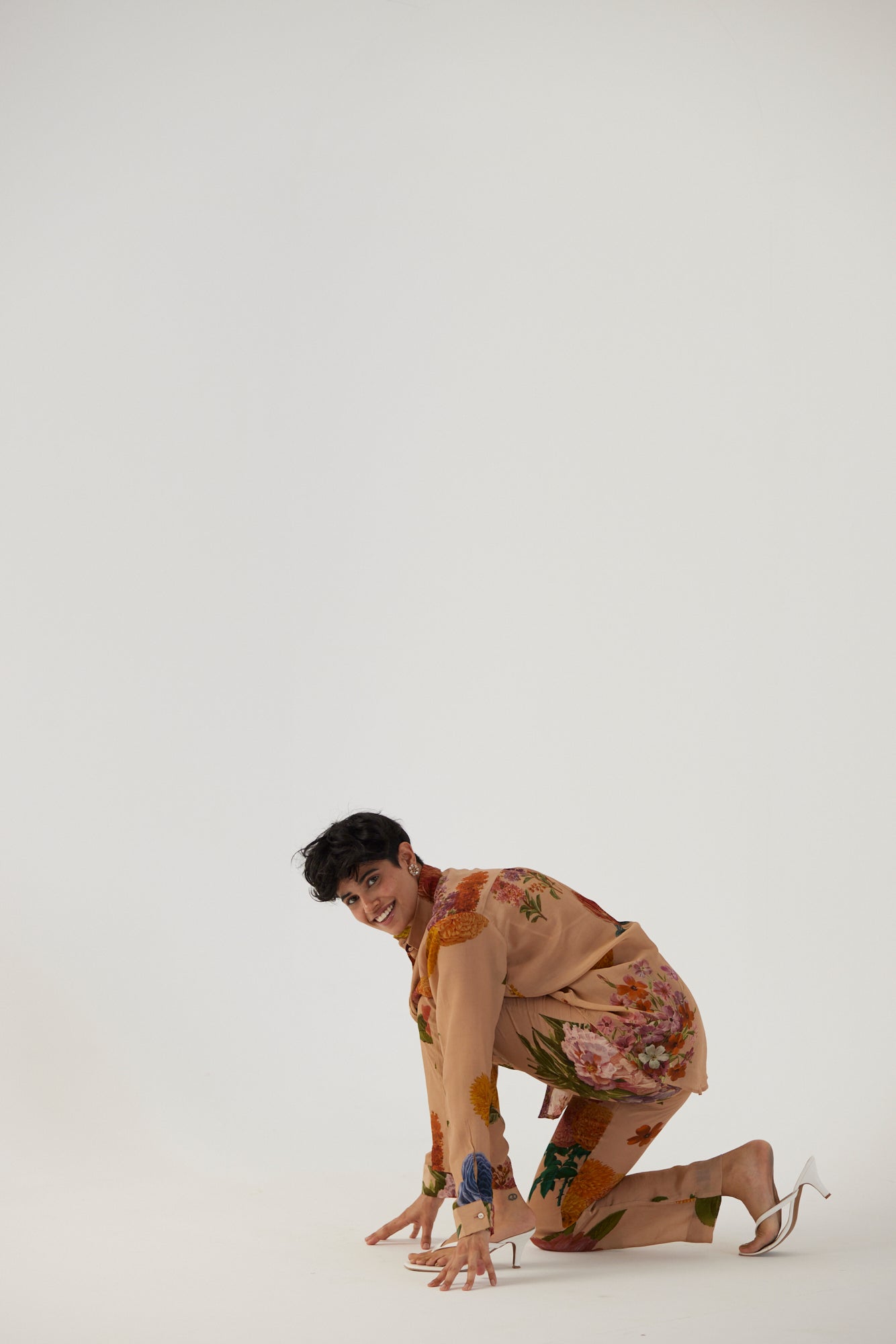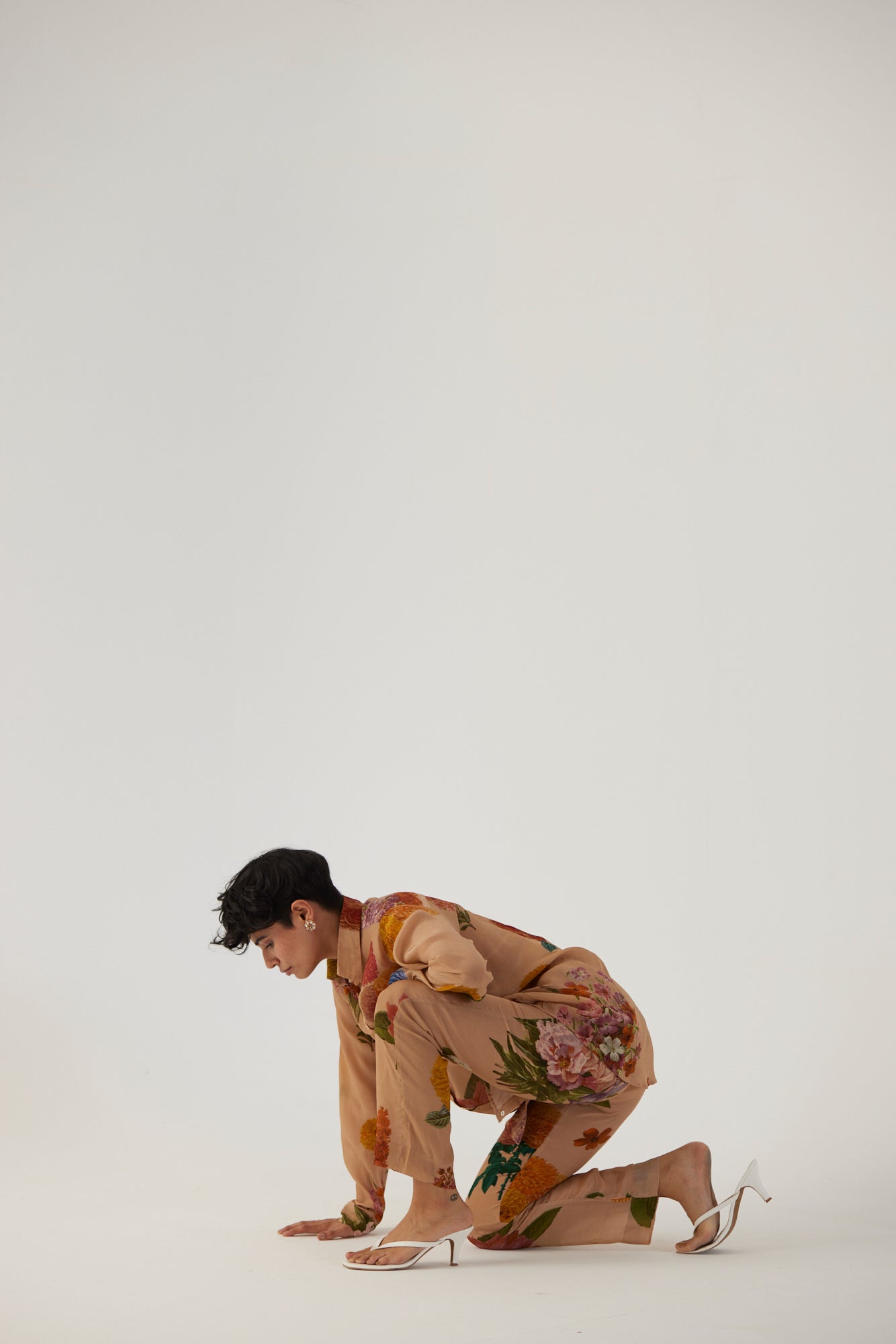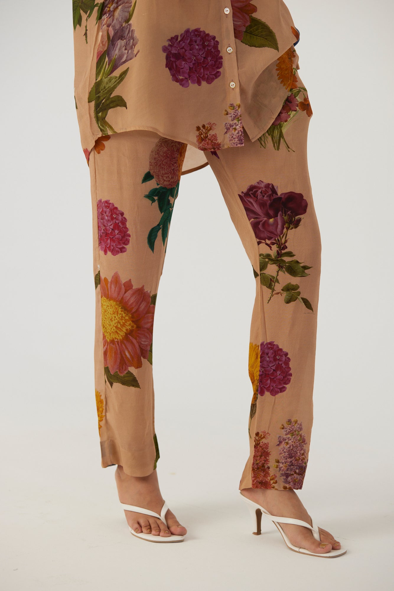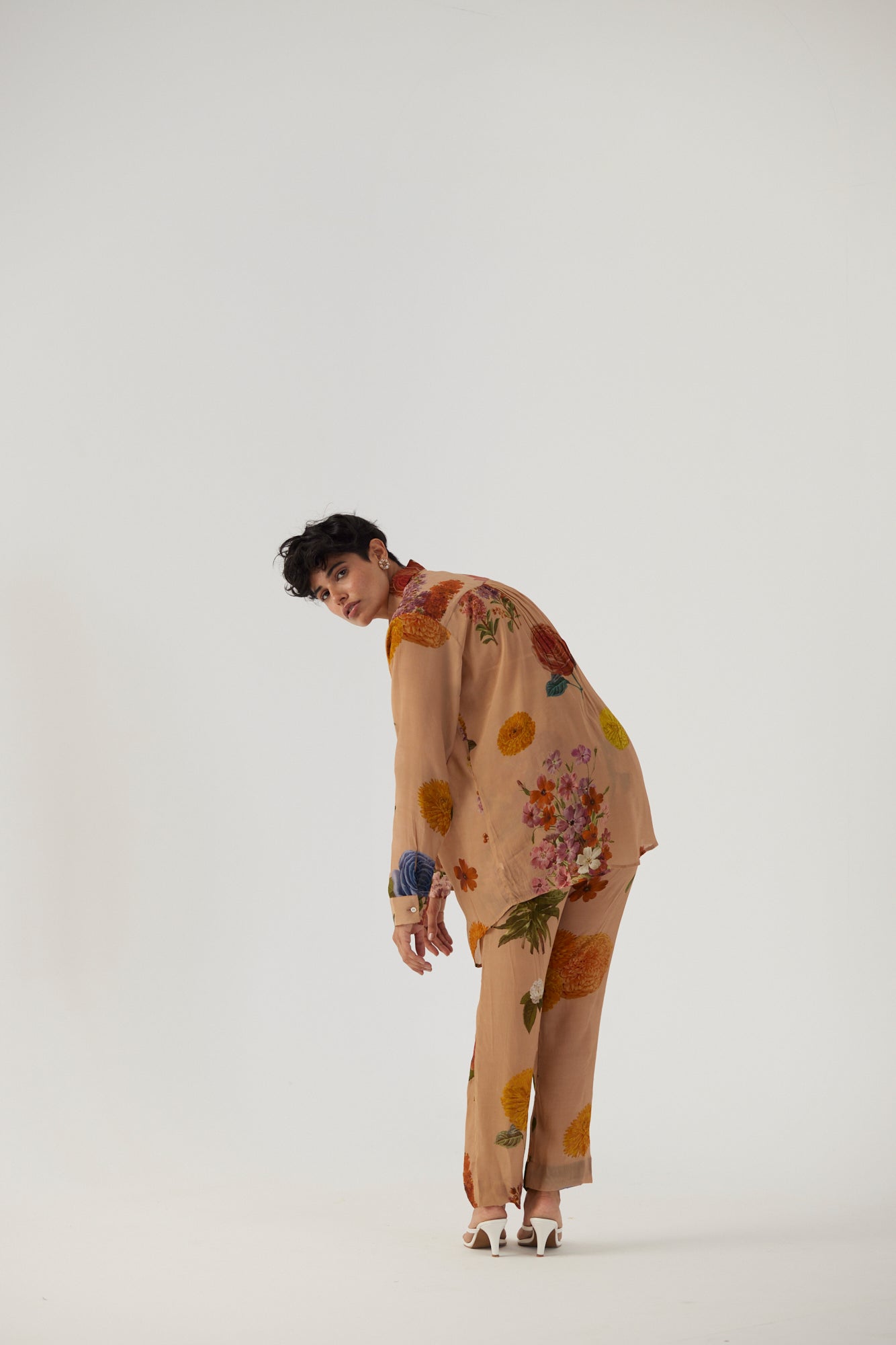 The vintage garden print inspired from an old botanical tapestry is just a breath-taking collection of a botanical garden. Watercolor florals and leaves s are playfully dancing on a beige background. All with the touch of vintage. The set includes a button down shirt with back gathers and straight pants.