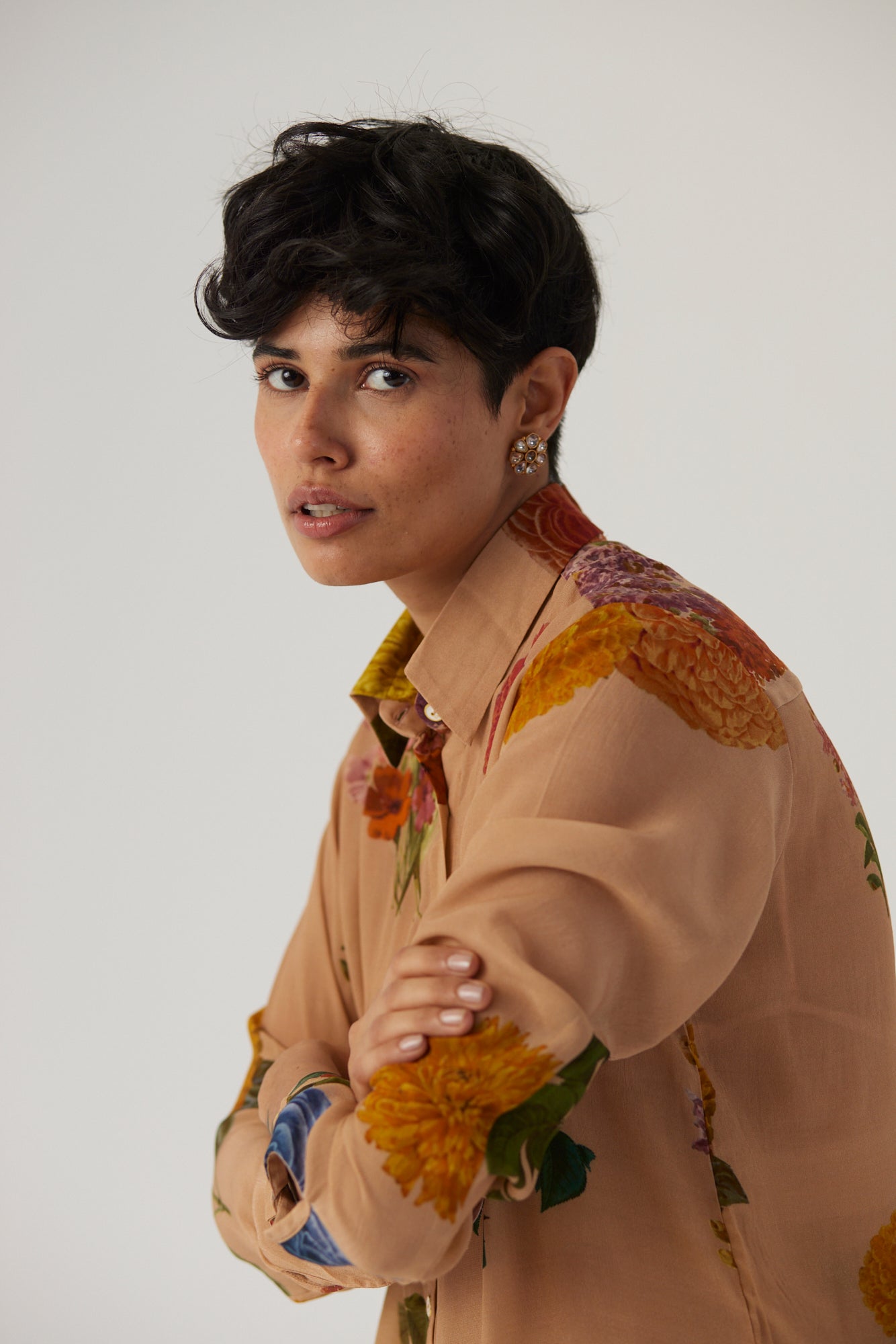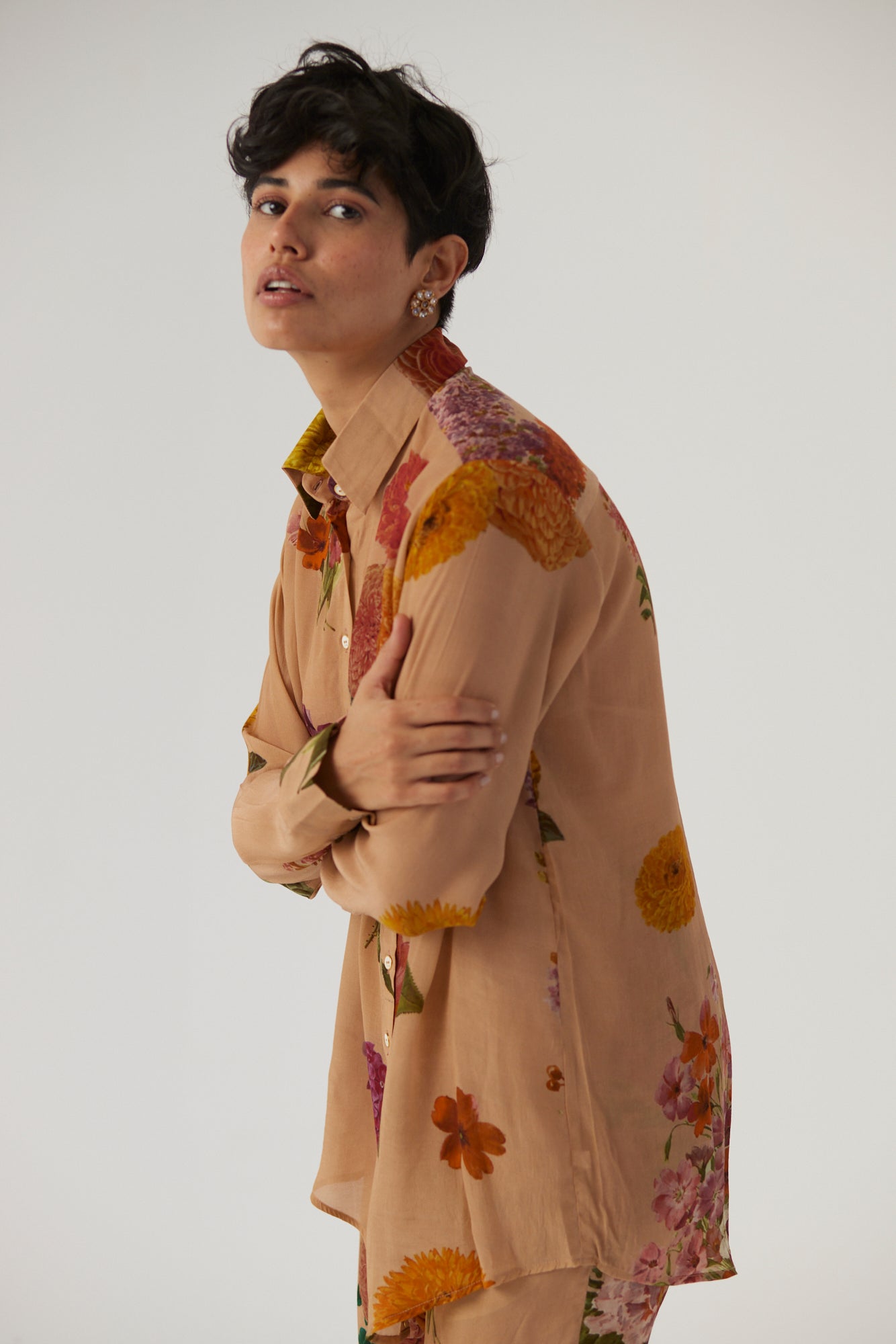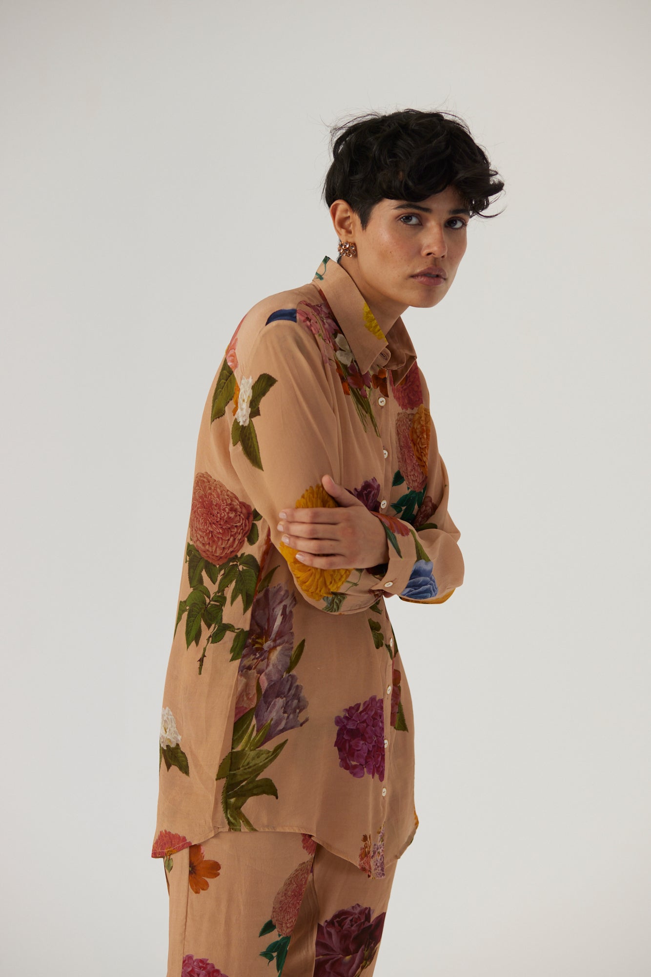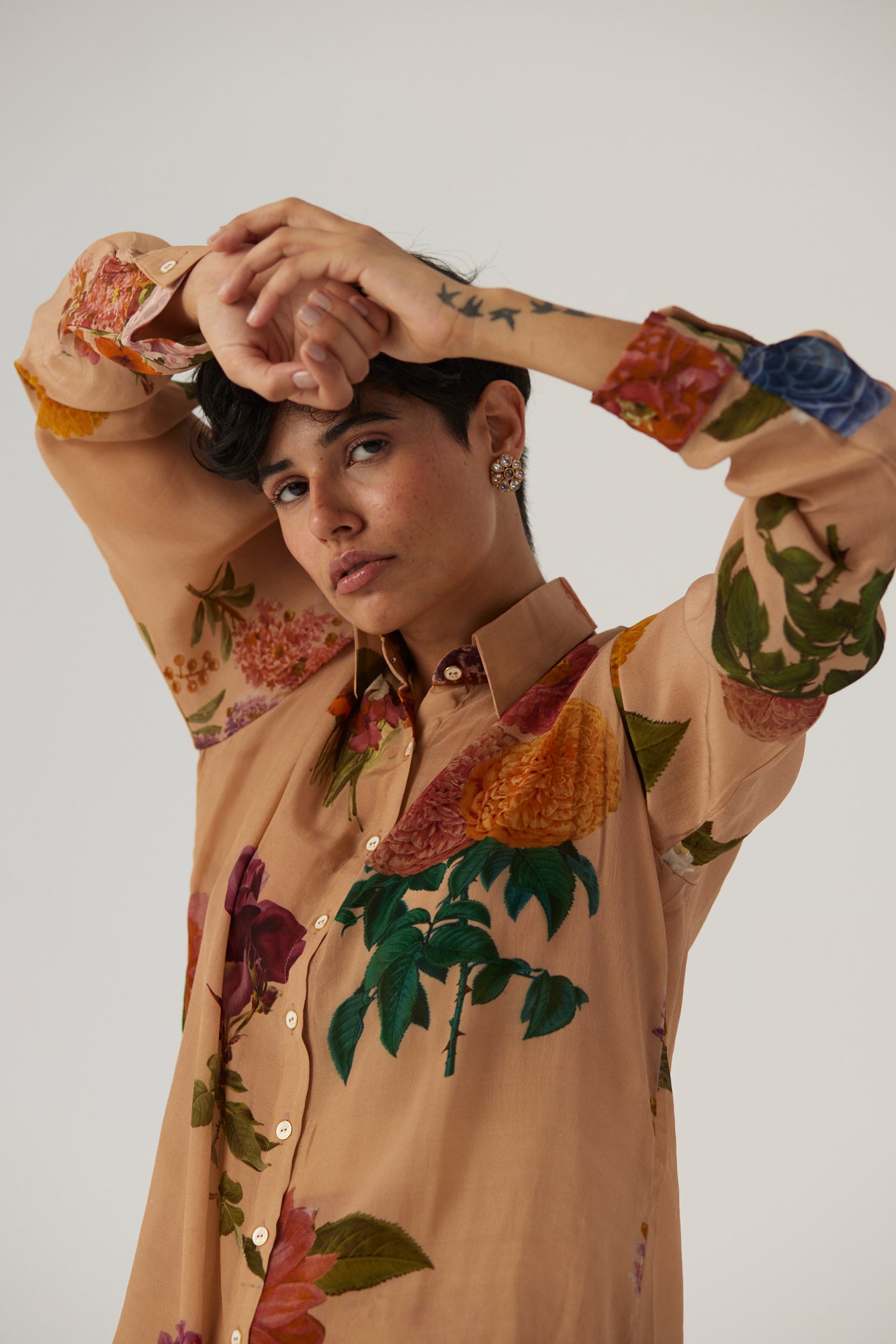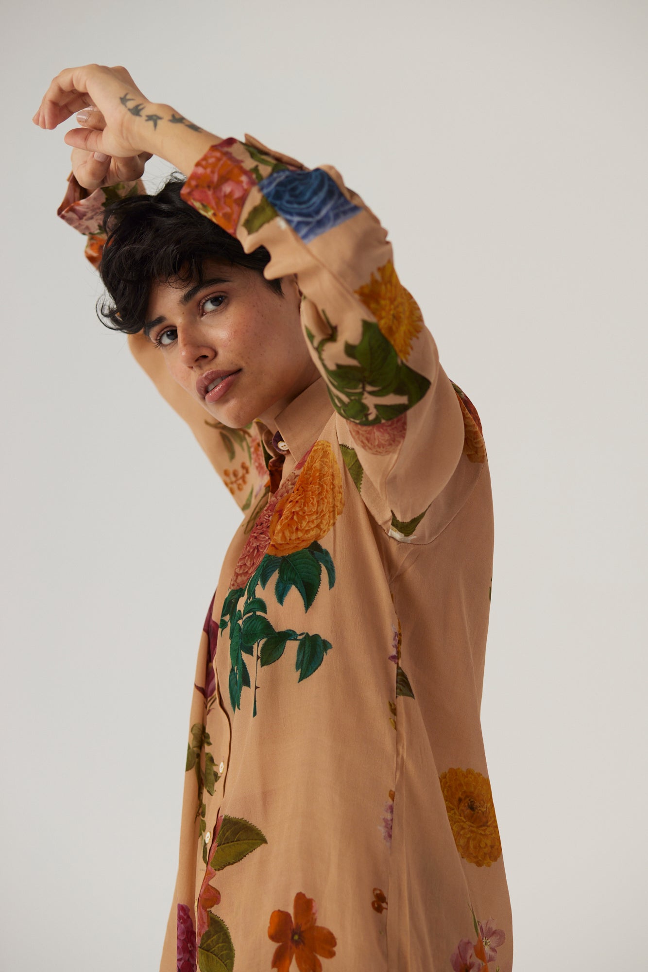 The vintage garden print inspired from an old botanical tapestry is just a breath-taking collection of a botanical garden. Watercolor florals and leaves s are playfully dancing on a beige background. All with the touch of vintage. The set includes a button down shirt with back gathers and straight pants.