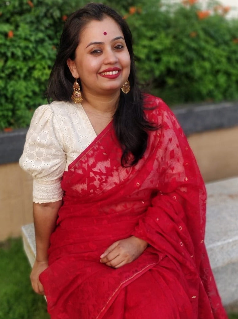 one of the most versatile in our Vintage series is the Ritwika Blouse. It is made of Hakoba fabric with lace details in sleeves and neck.