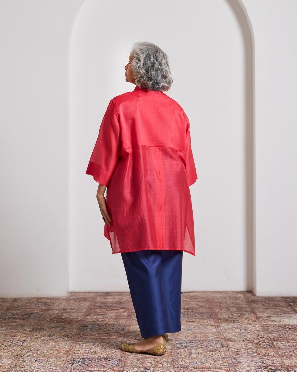 Crafted in luxurious Silk Chanderi, this Watermelon Red anti-fit top effortlessly blends comfort with elegance. The delicate handwork featuring Resham thread and Abla embellishments adds a subtle yet artisanal charm, accentuating the top’s pinstriped pattern. Designed in a relaxed anti-fit silhouette, it drapes gracefully, making it an ideal choice for festive gatherings, casual soirées, or elevated daywear. Pair it with tailored pants for a look that’s effortlessly refined.