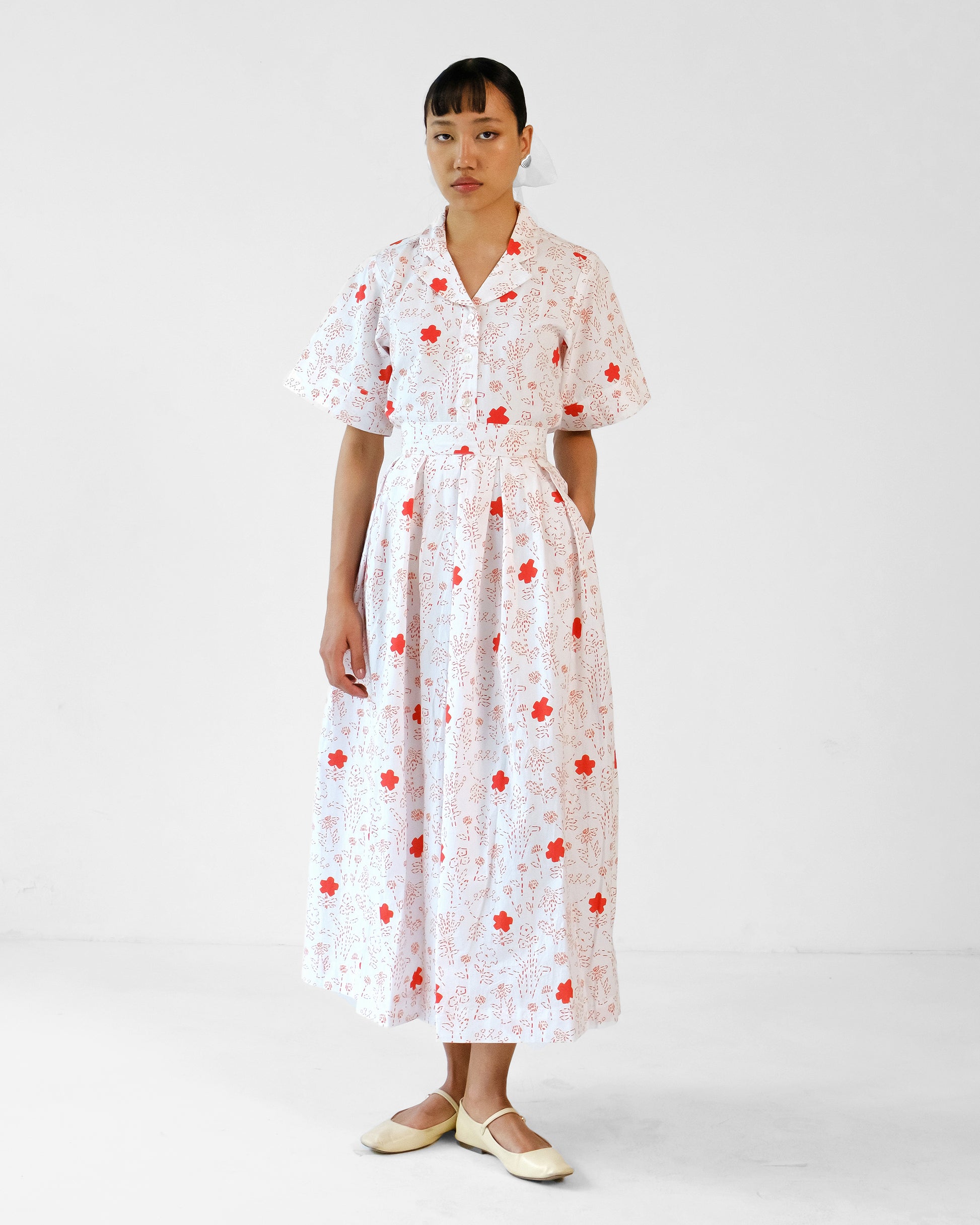 A minimal floral print box pleated skirt paired with a Cuban collar top featuring stunning floral print. The Skirt waist has button closure.
