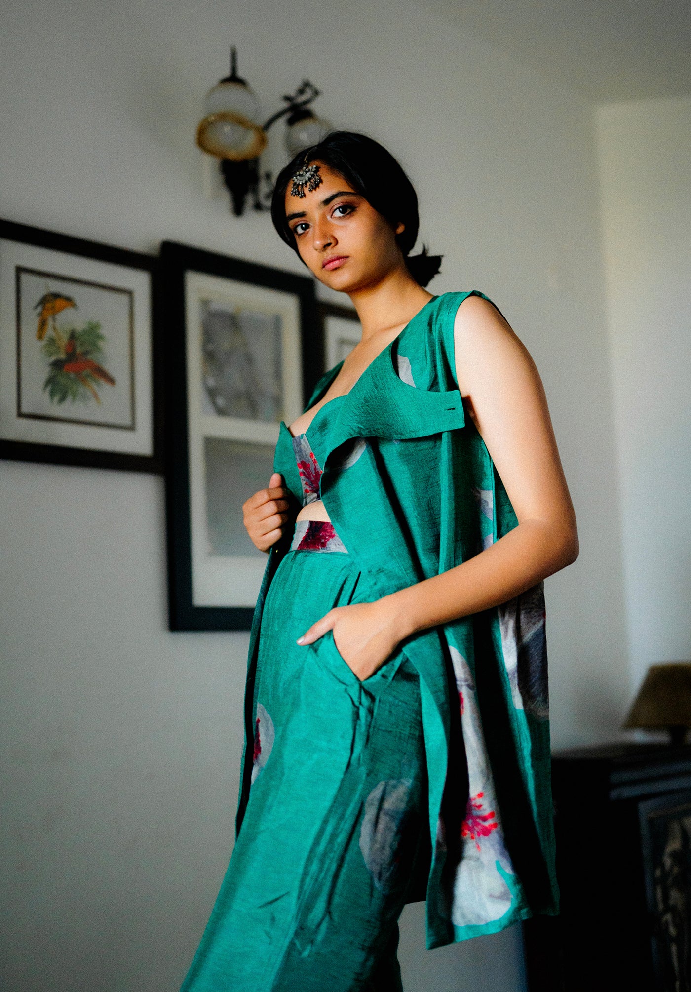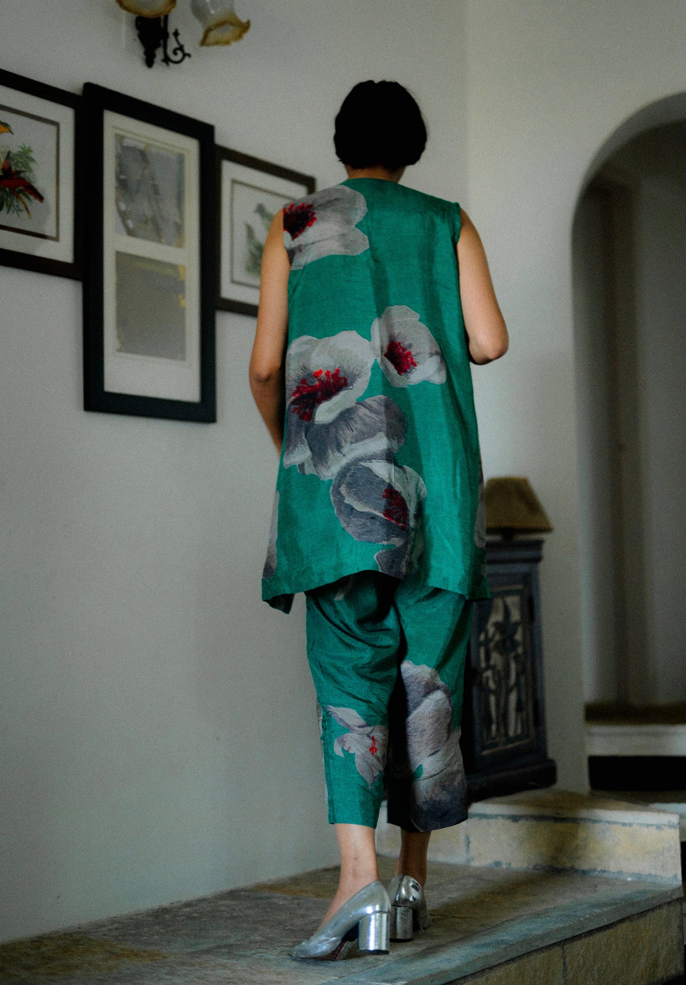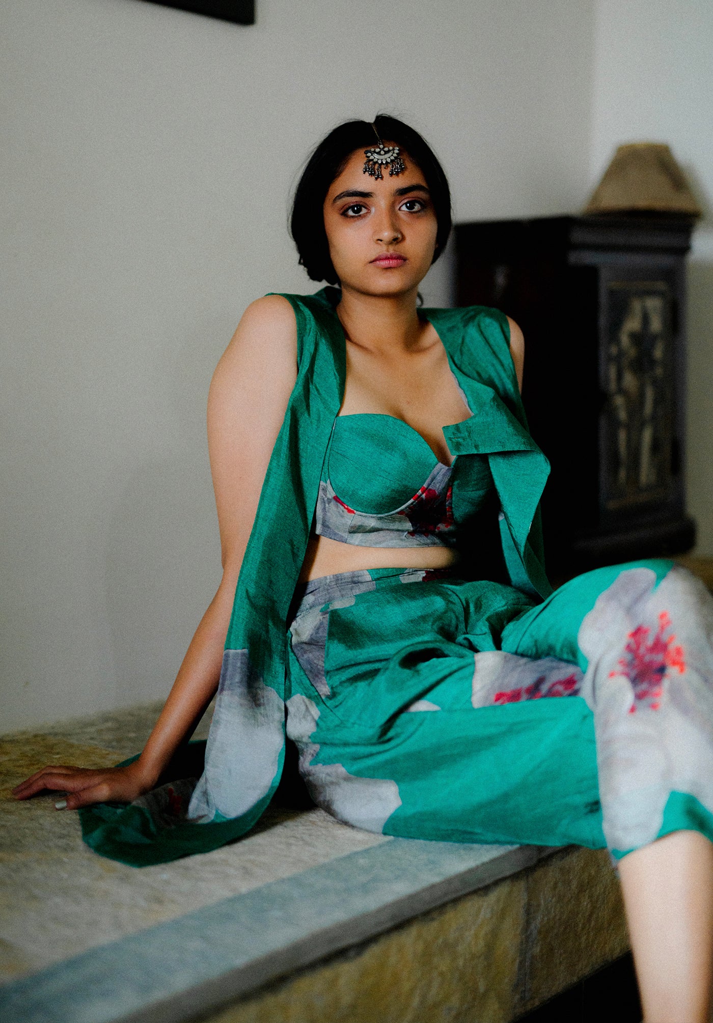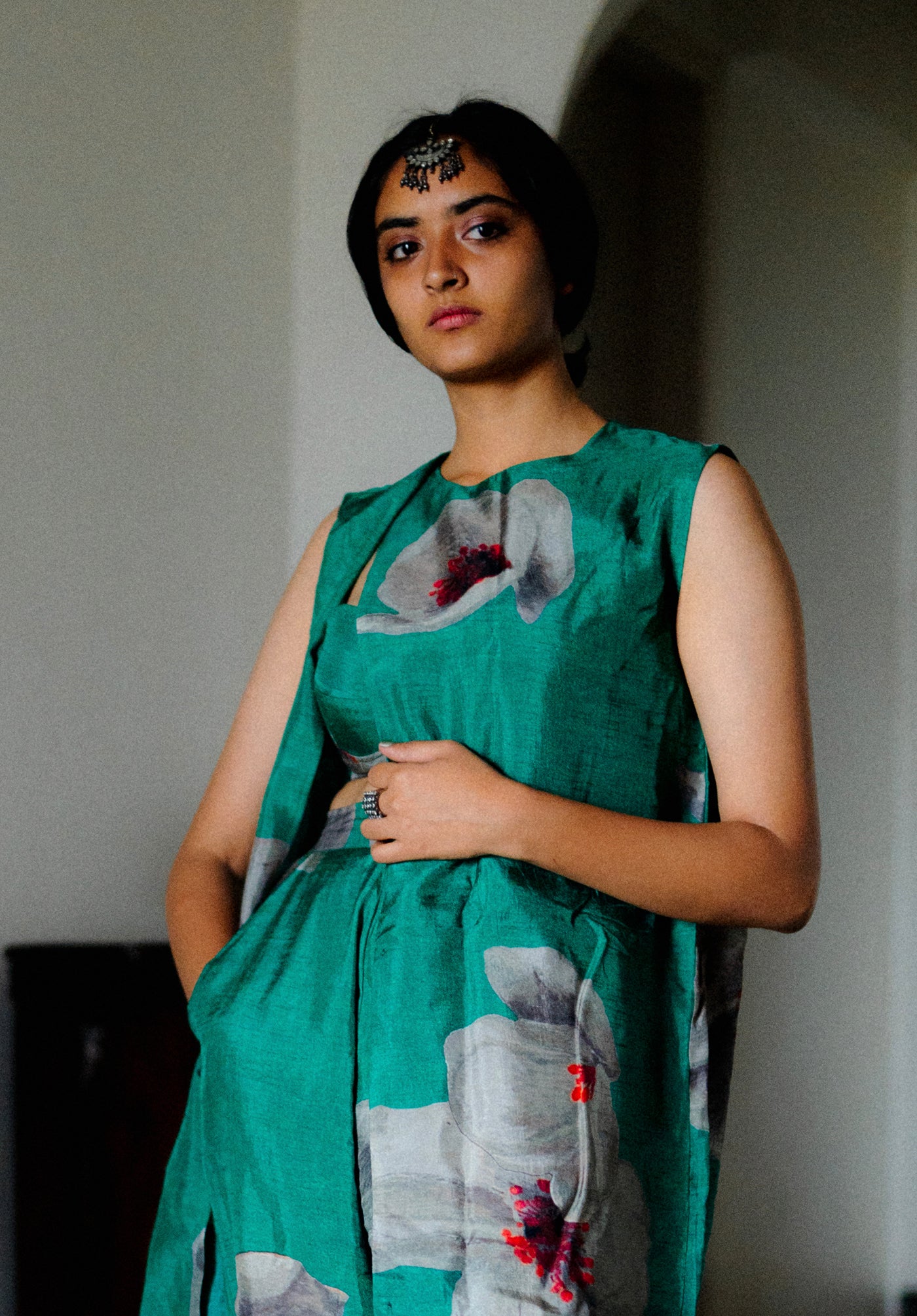 The set is crafted in a unique green colour with massive white poppies carefully printed on dora silk. The set includes a jacket, A pair of pants (back elasticated) and a bralet (back elasticated)