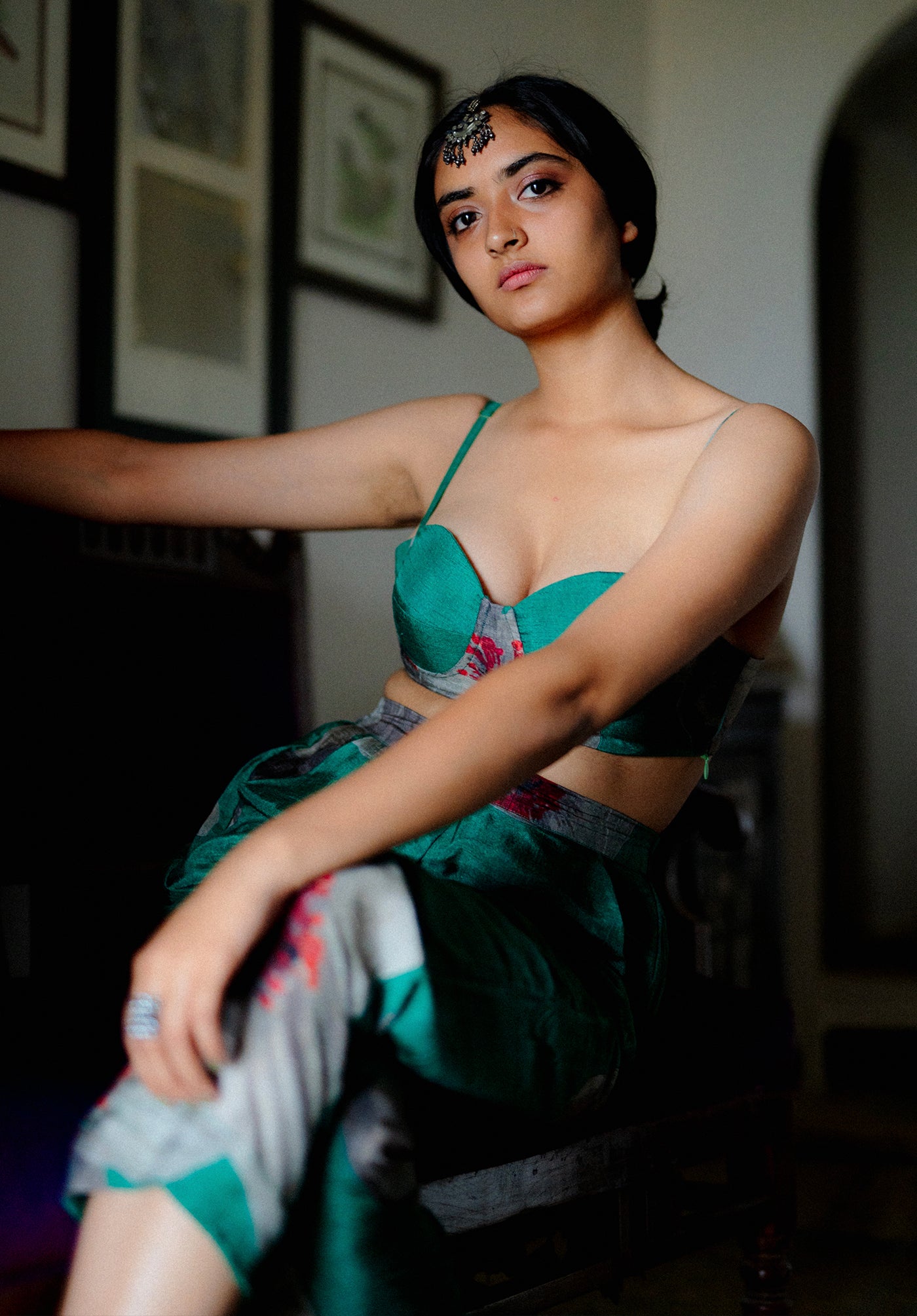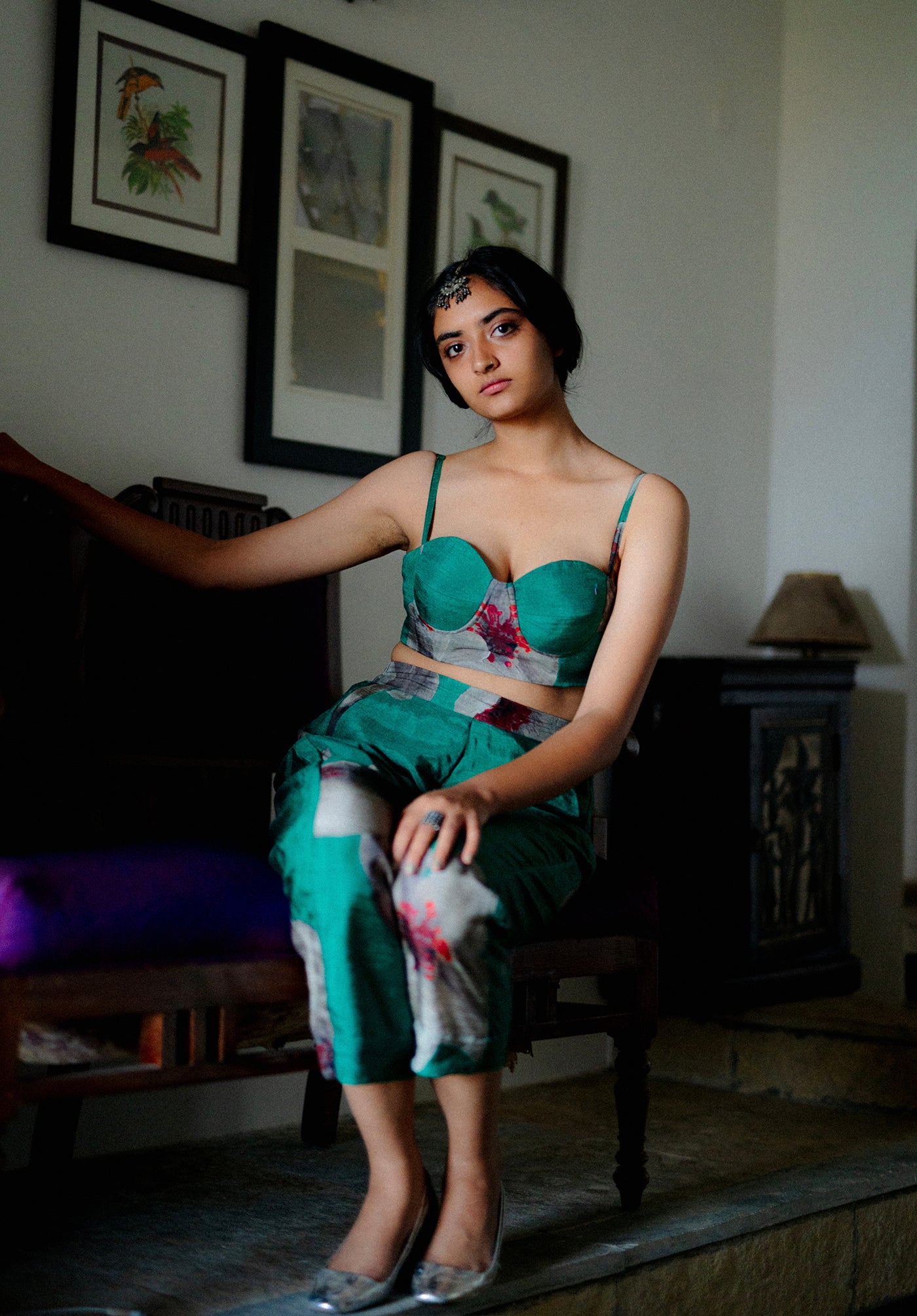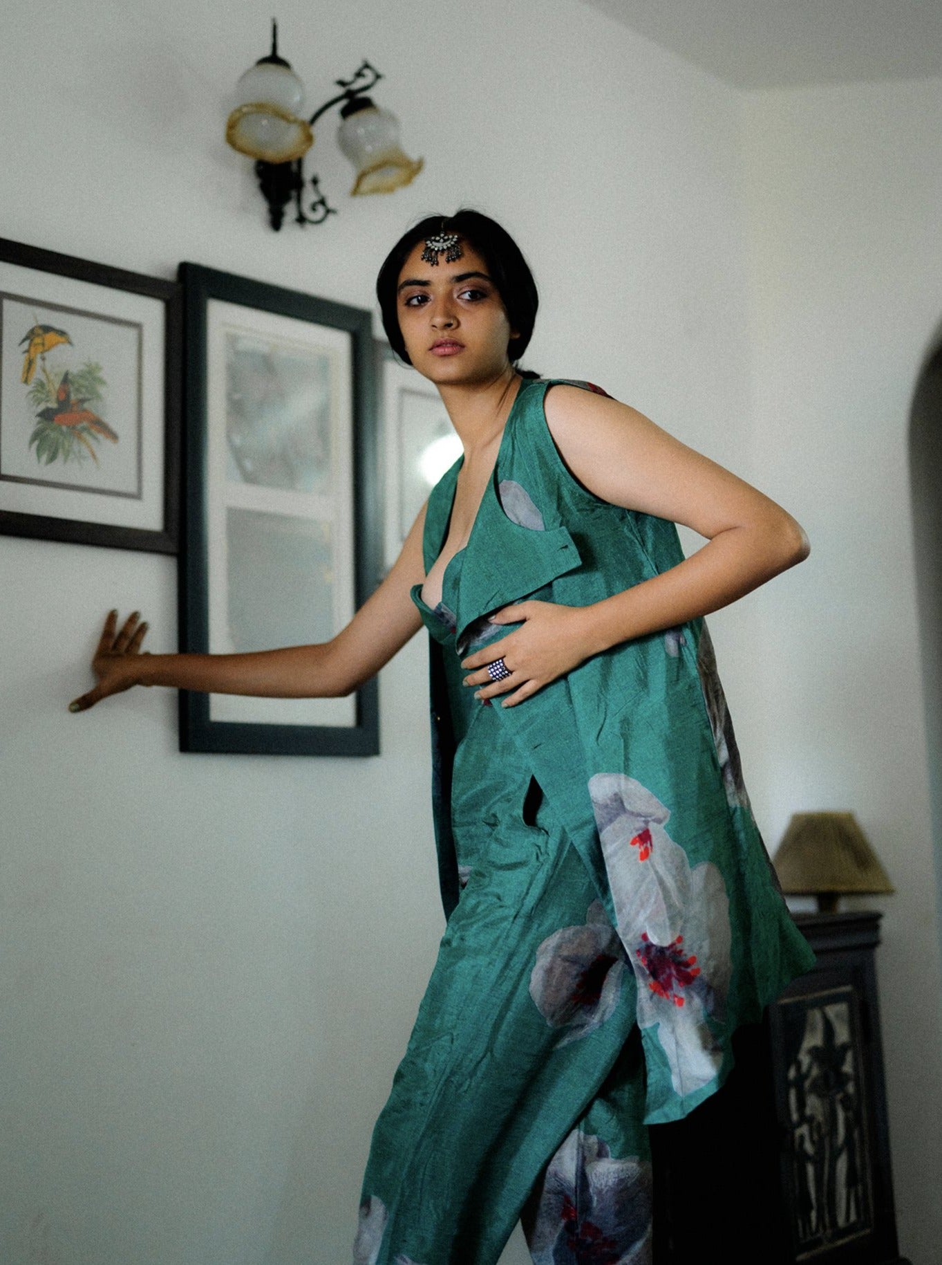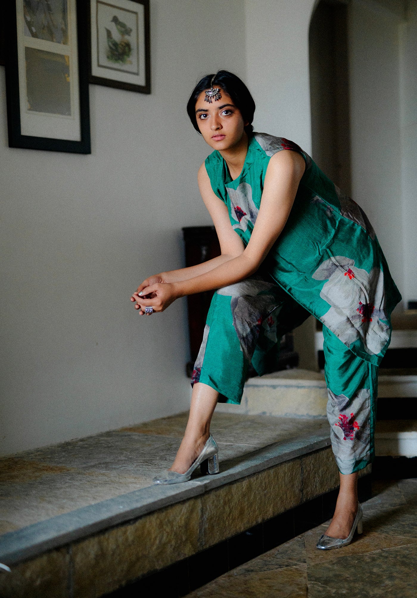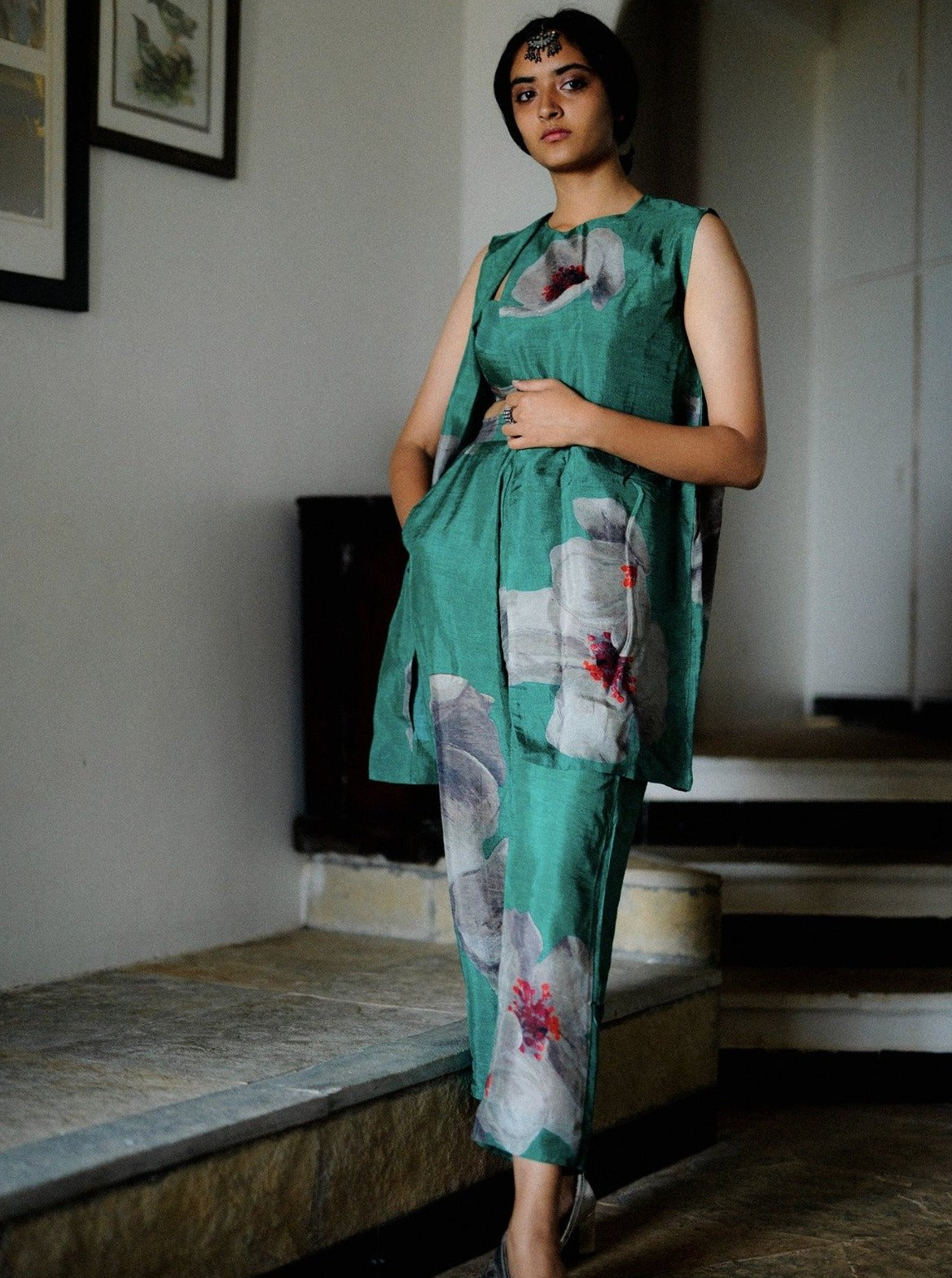 The set is crafted in a unique green colour with massive white poppies carefully printed on dora silk. The set includes a jacket, A pair of pants (back elasticated) and a bralet (back elasticated)