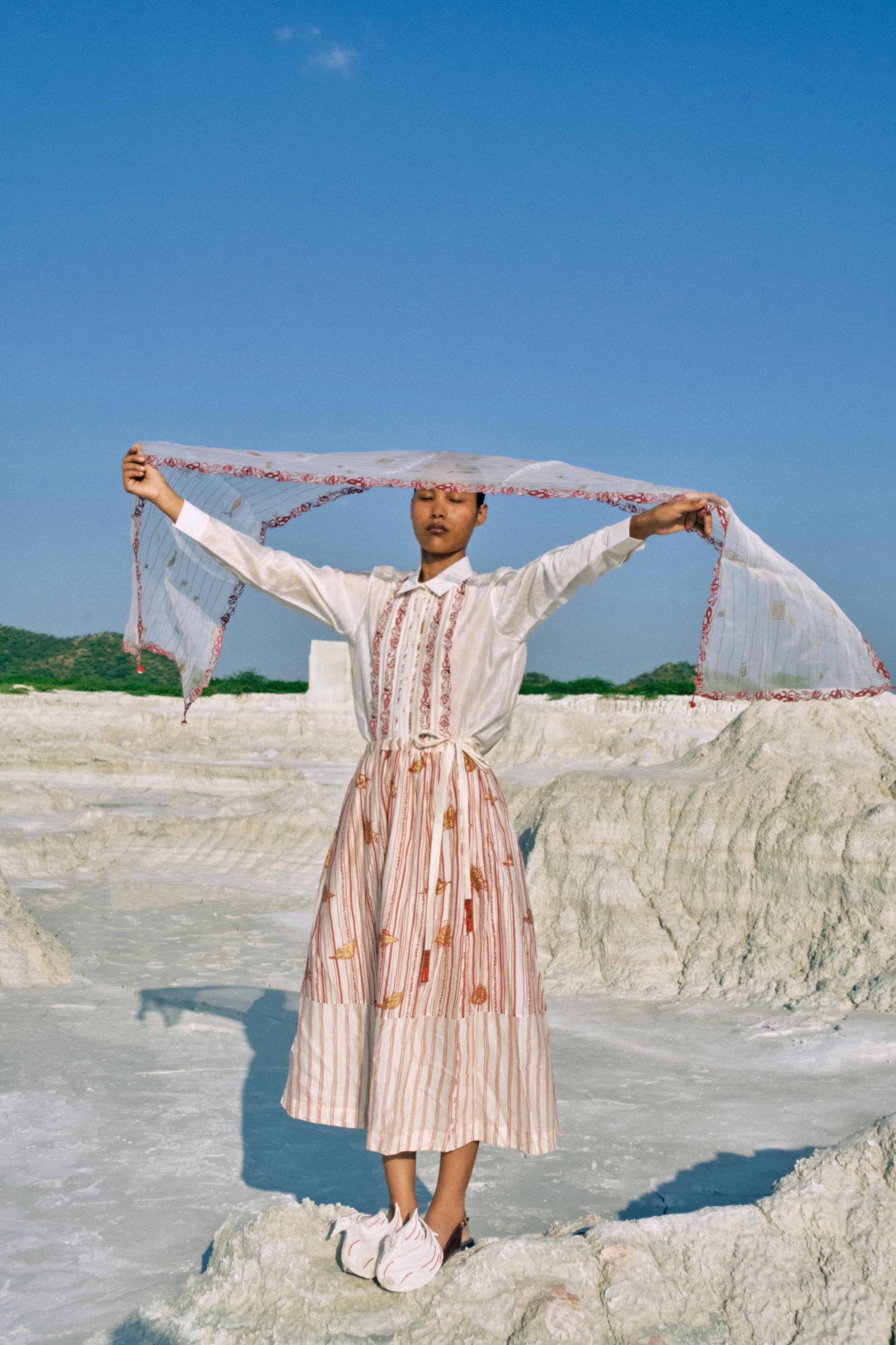 The Win Organza Scarf is a hand-screen-printed silk organza accessory that marries elegance with intricate craftsmanship. Embroidered motifs trace the entire border, while delicate handmade beaded tassels adorn the edges, adding subtle shimmer and texture. Each embroidered stitch and tassel has been completed with hours of meticulous artisan labour, making this scarf a refined and versatile statement of artistry.