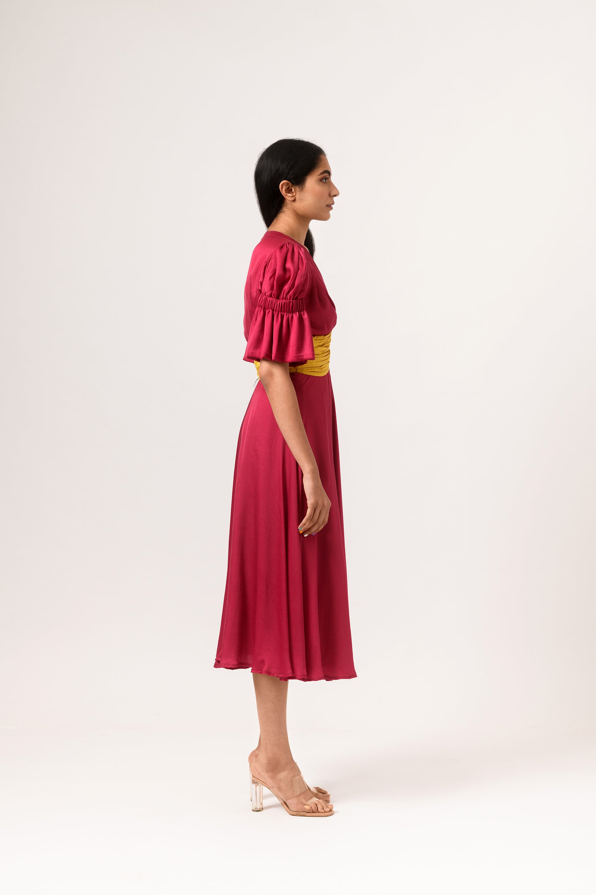 Wine-Yellow Rouching Dress with Yellow Rouching around wasit and elbow patterned sleeve