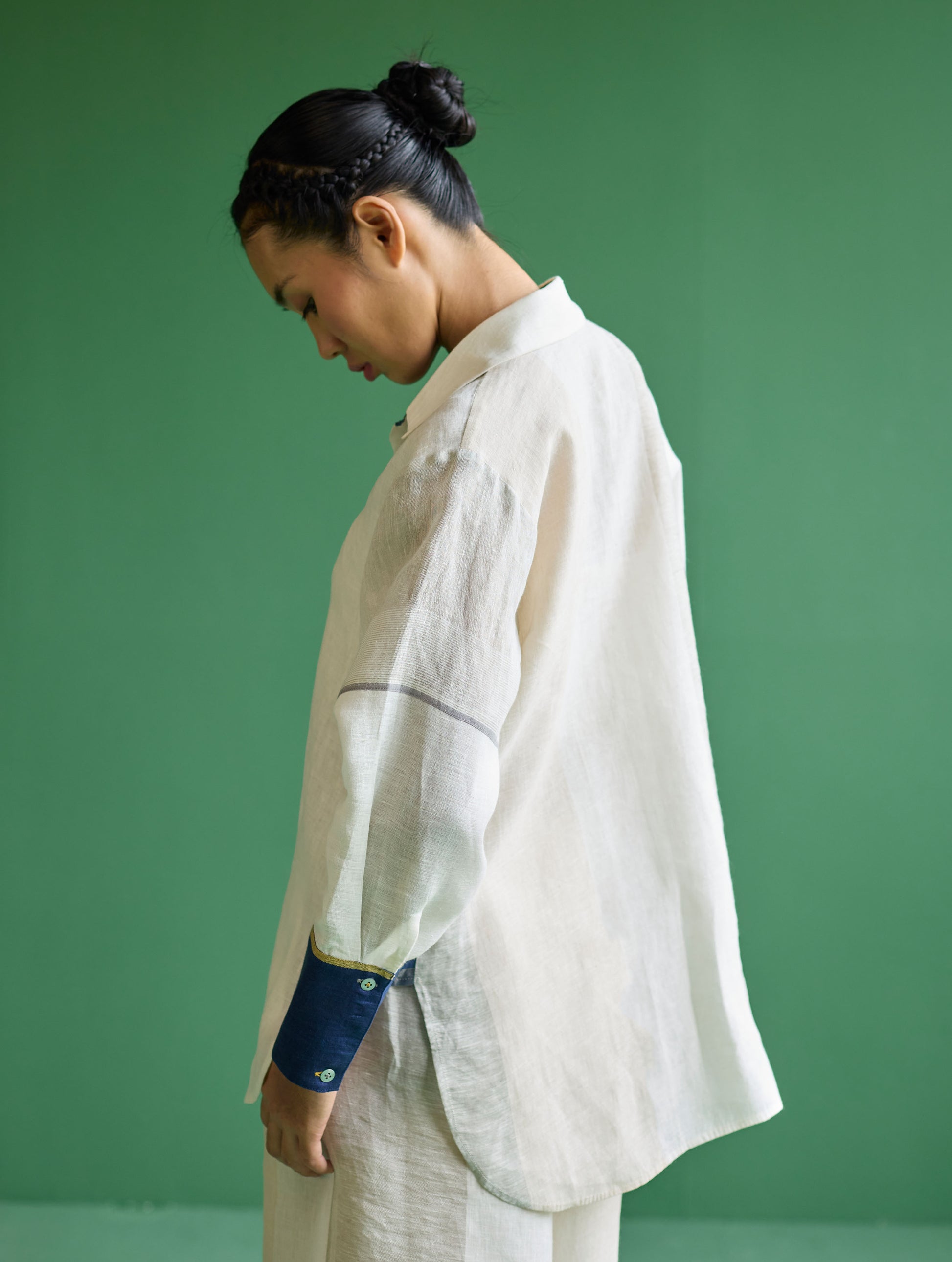 Shirt - This chic and contemporary colour-blocked shirt is crafted from our signature soft handwoven metallic border linen with a grey coloured selvedge; it features a button-down concealed placket, full sleeves with contrasted cuffs finished with brass buttons.