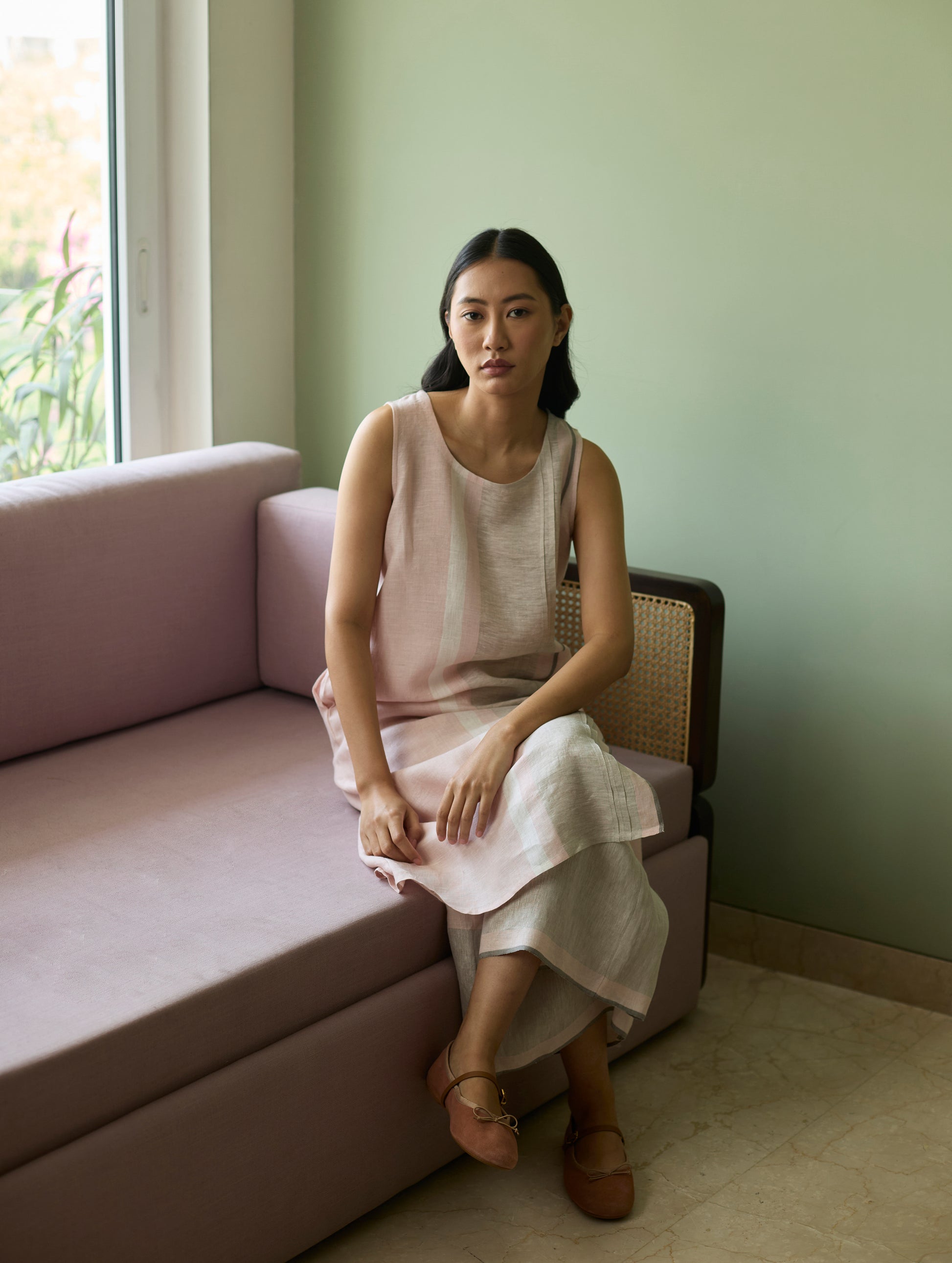 Kurta - The sleeveless kurta is designed in our bespoke soft handwoven metallic border linen with a grey selvedge. The round-neckline is complemented by delicate hand-done pintucks and a subtle grey woven edging along the front. The Yara is finished with a front slit for ease and fluidity and comes with pockets. Perfect for warm days and layered evenings, Yara is a timeless silhouette, that works across seasons.