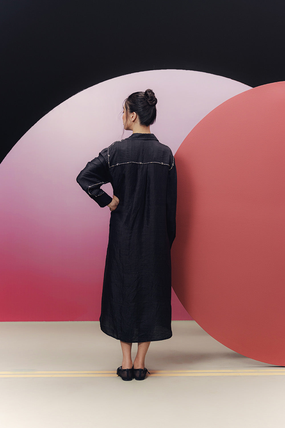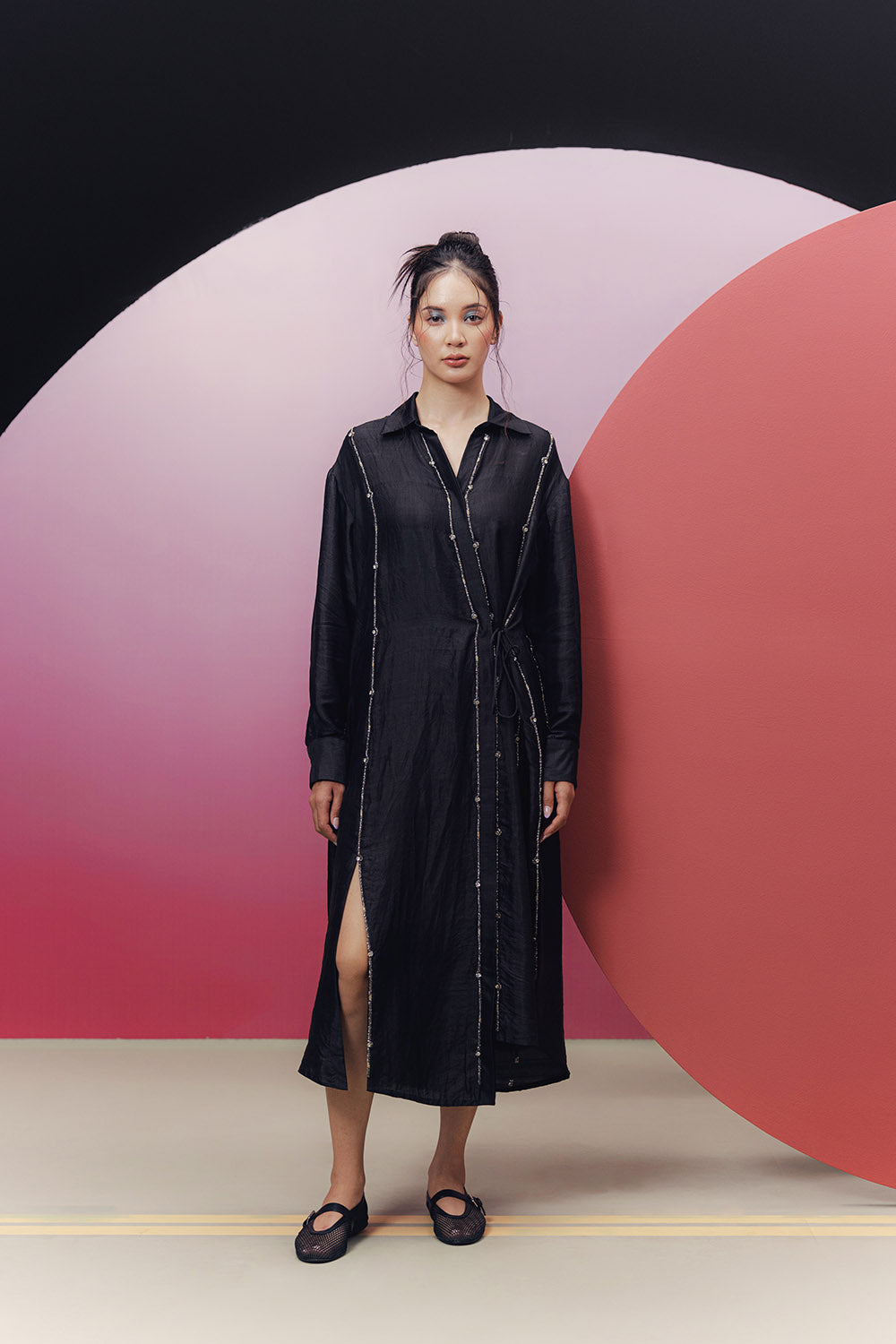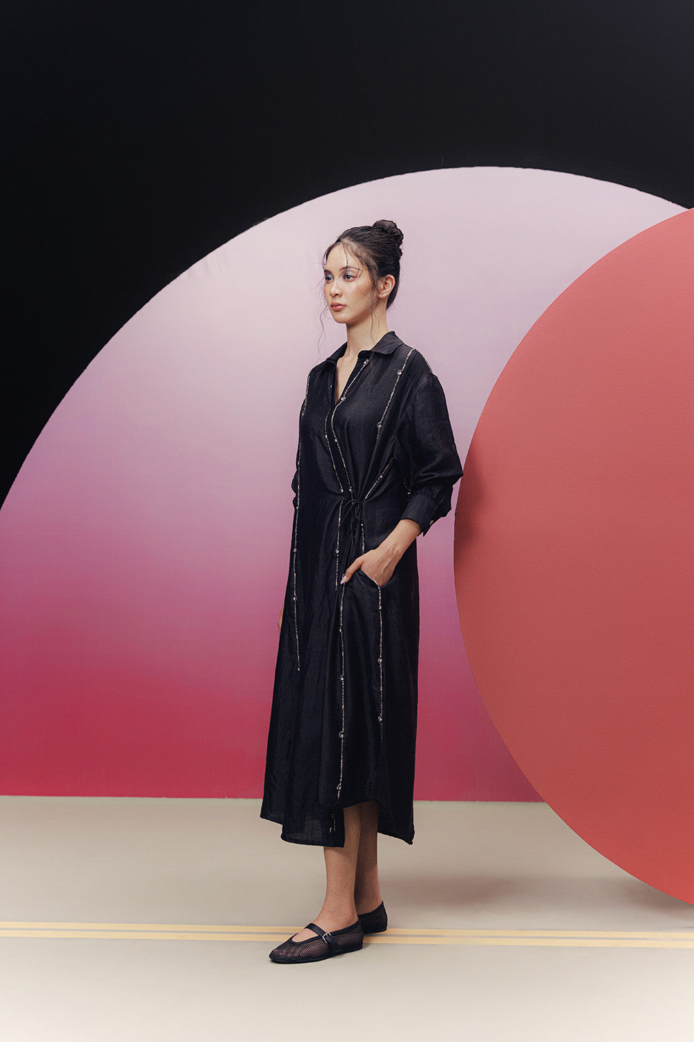 Handwoven silk midi shirt dress with beadwork and stone embroidery along the seams and off-centre tie-up details.