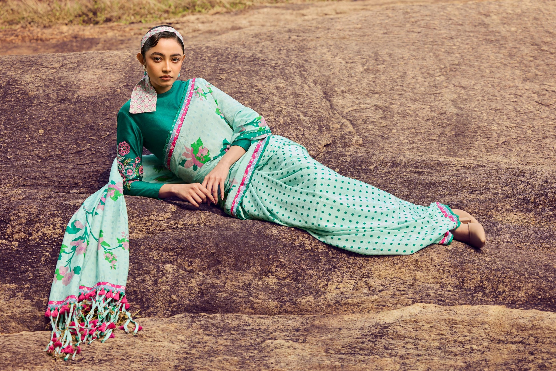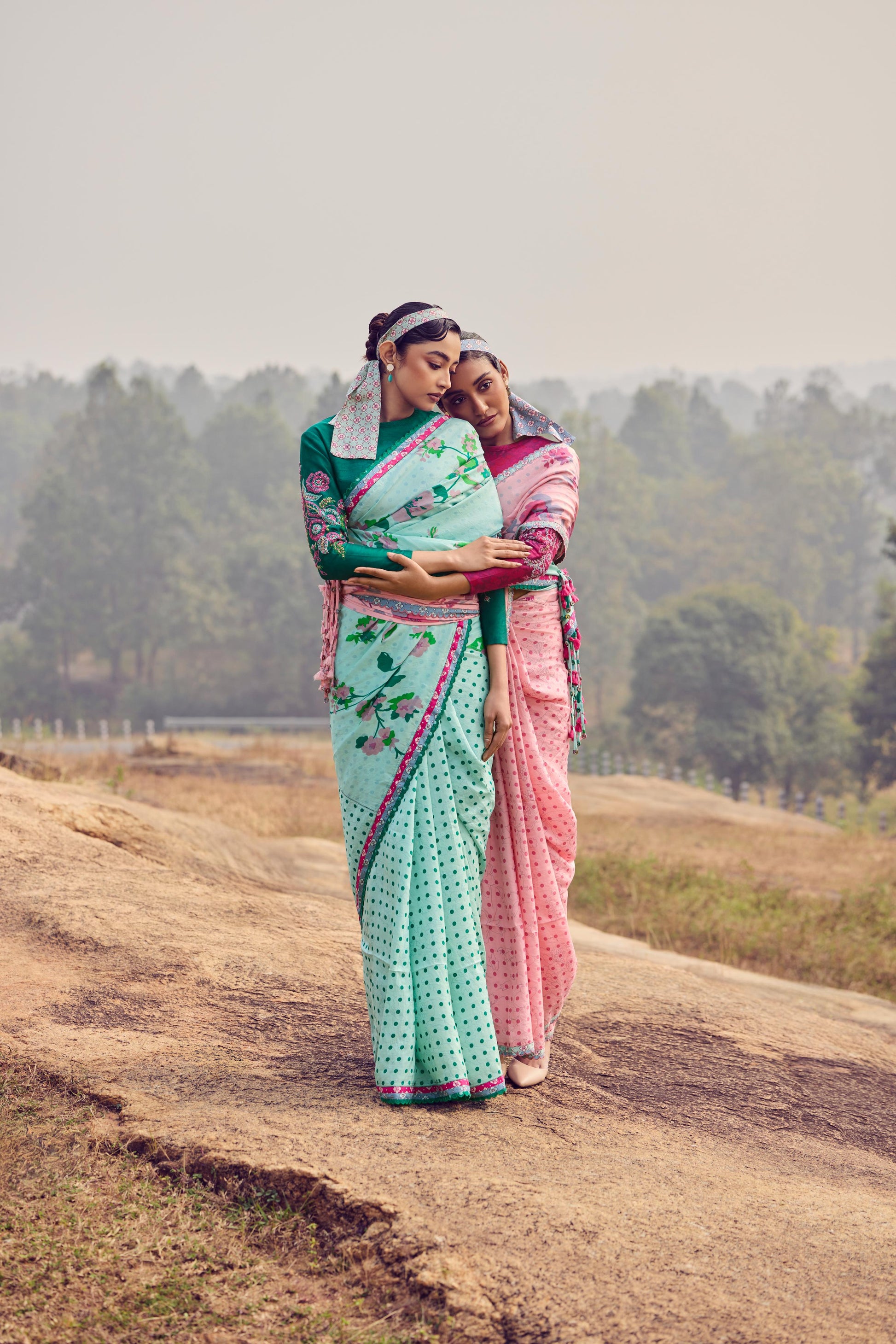 Hand woven, hand printed aqua mulberry silk saree with fringe detail, paired with embroidered blouse.