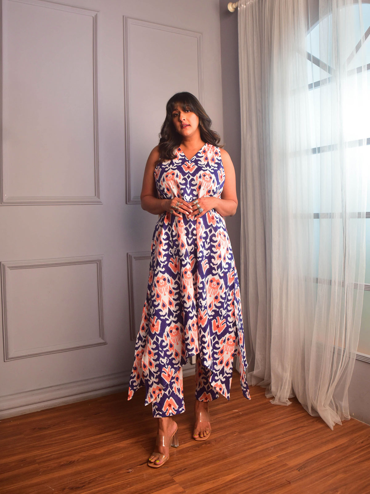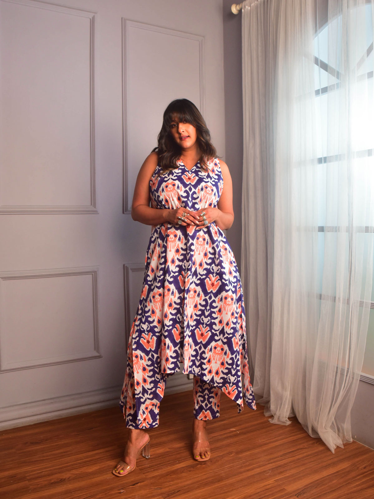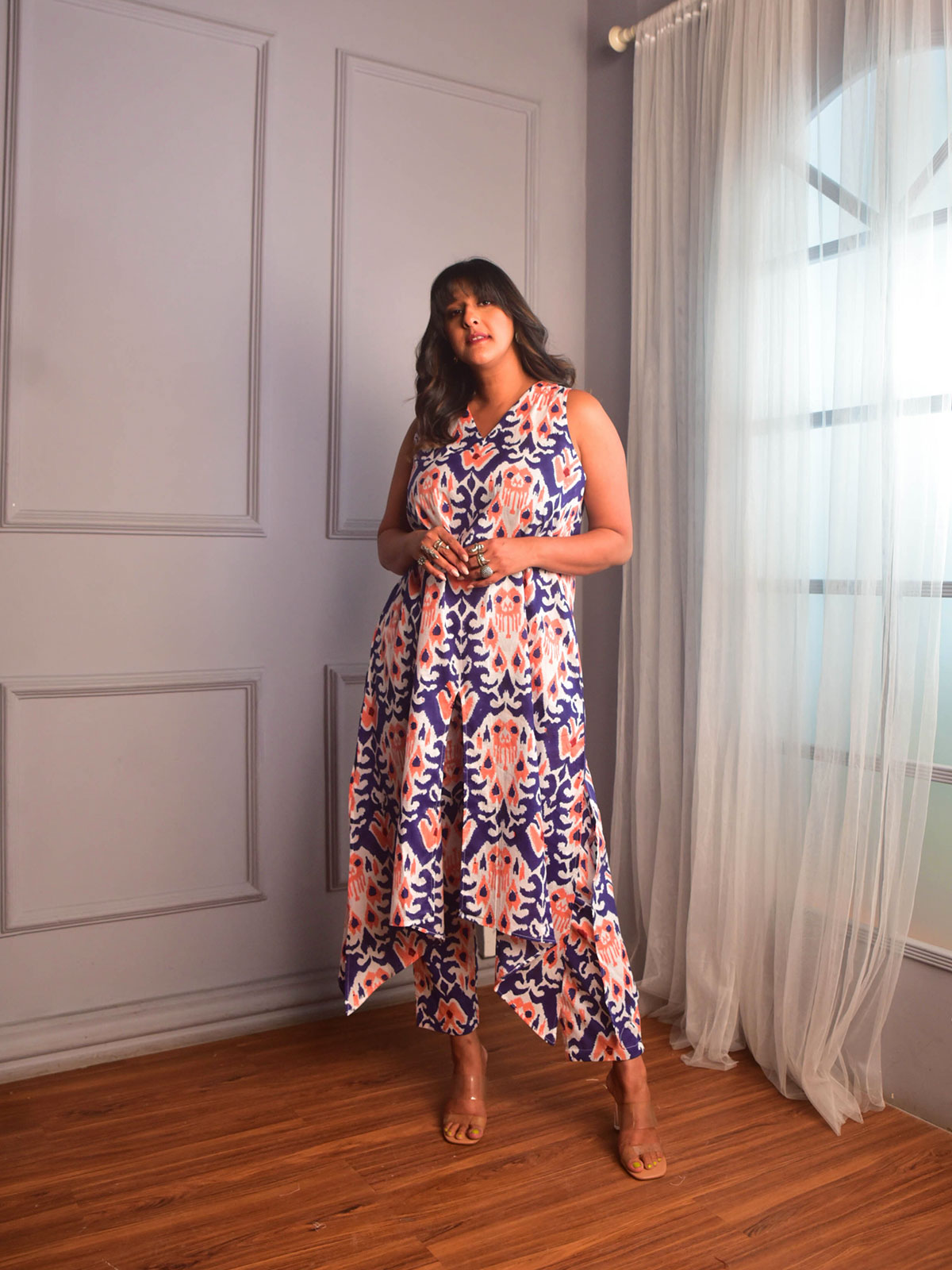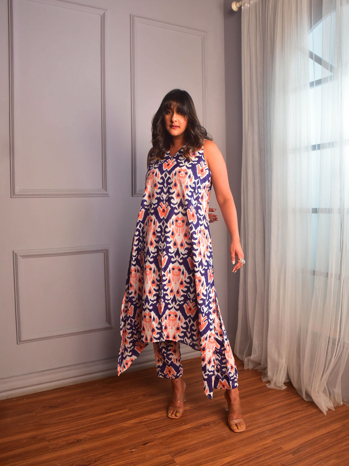 Celebrate in comfort and style with this cotton kurta set, perfect for festive soirées. Cut in our exclusive deep blue, peach and white ikat block-printed cotton, a V-neckline kurta with a slit in the front and sides with in seam pockets. It come with a matching pants.