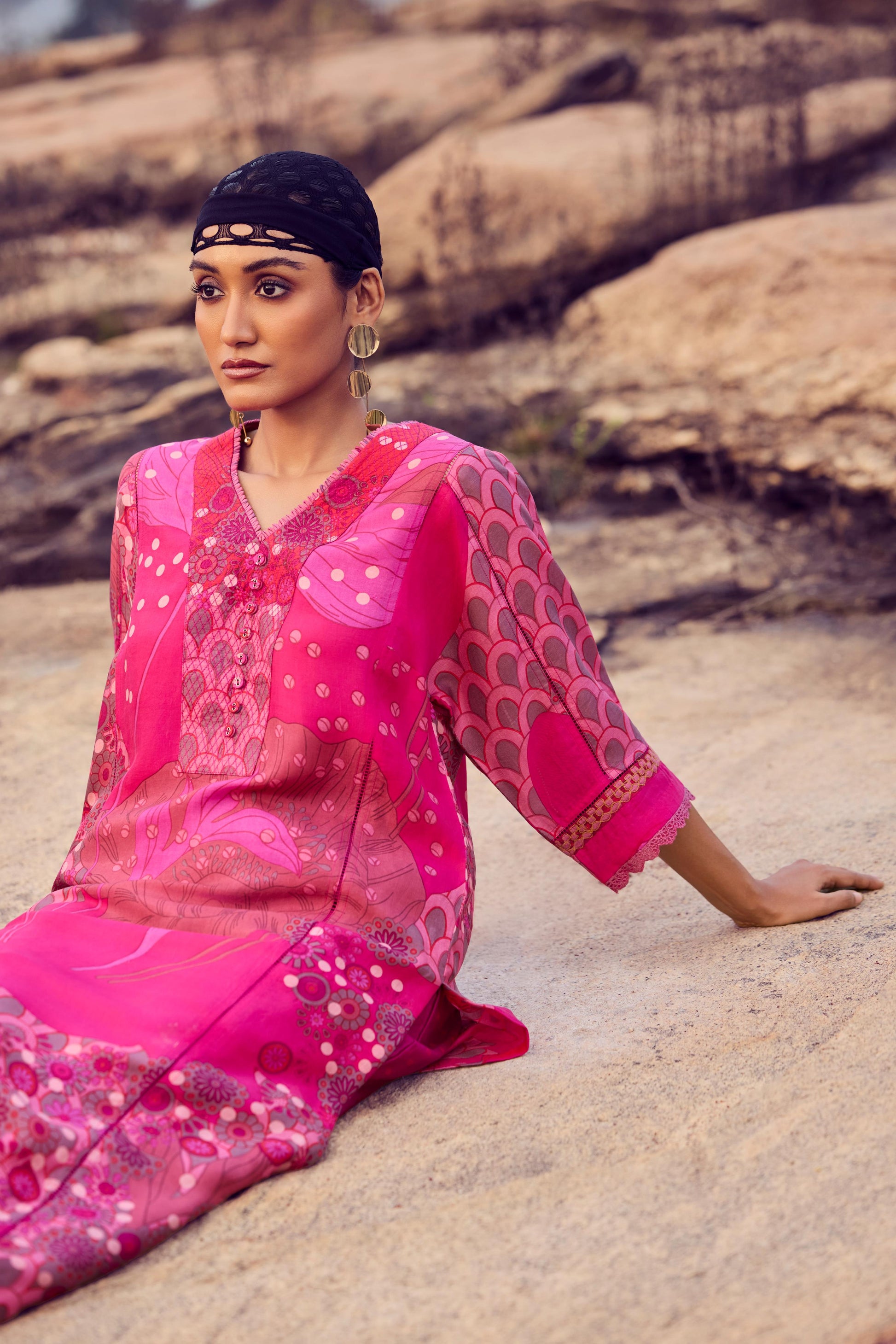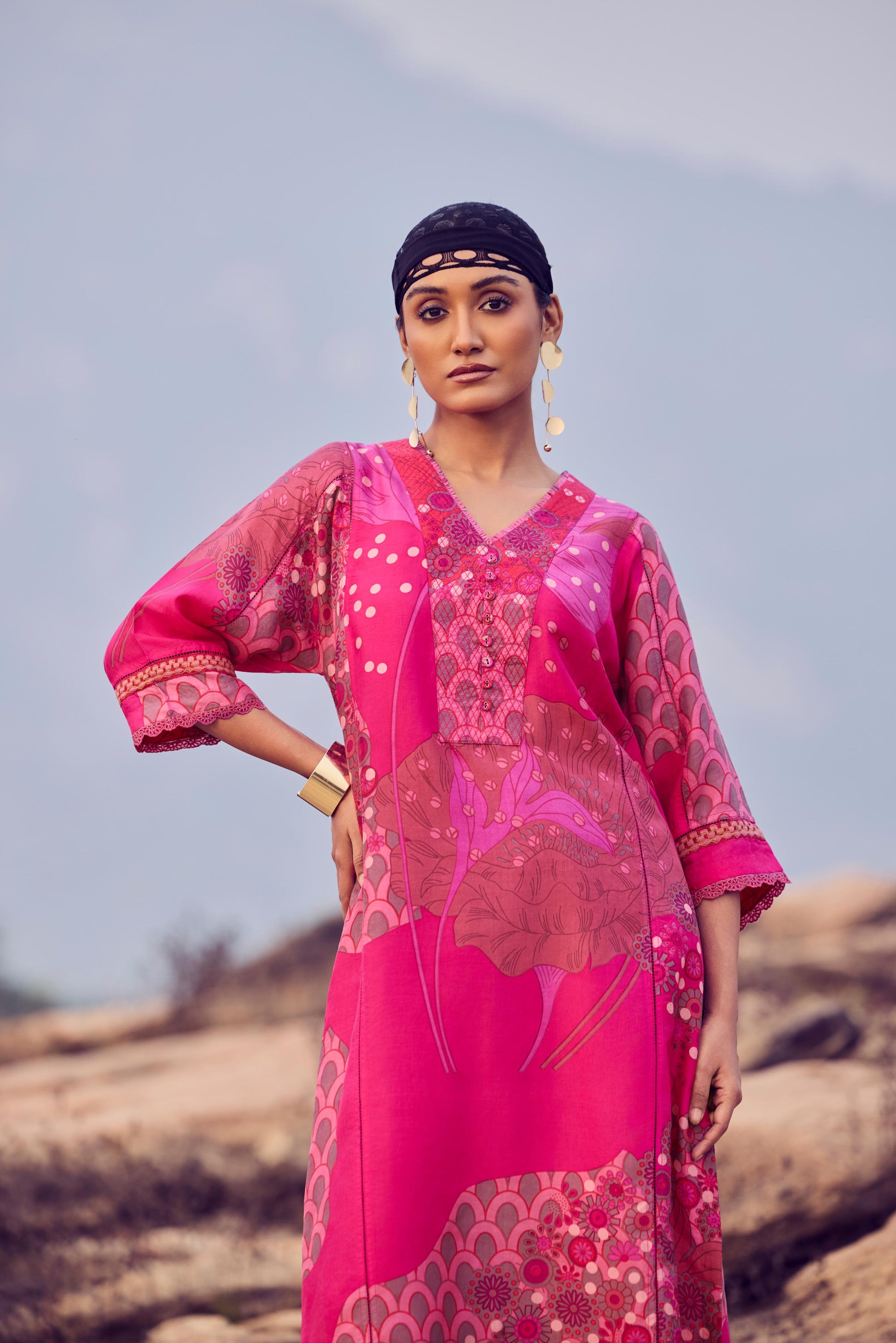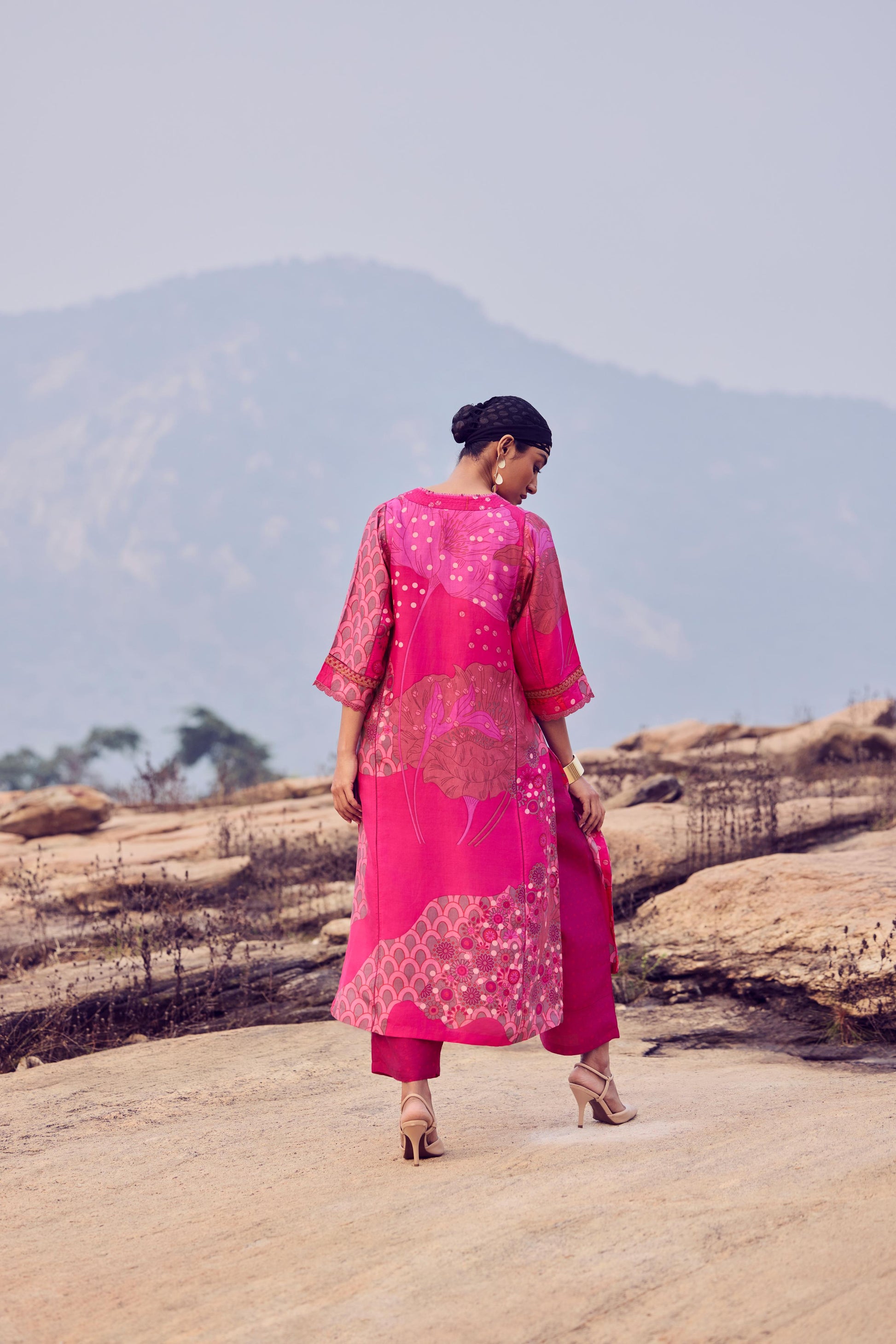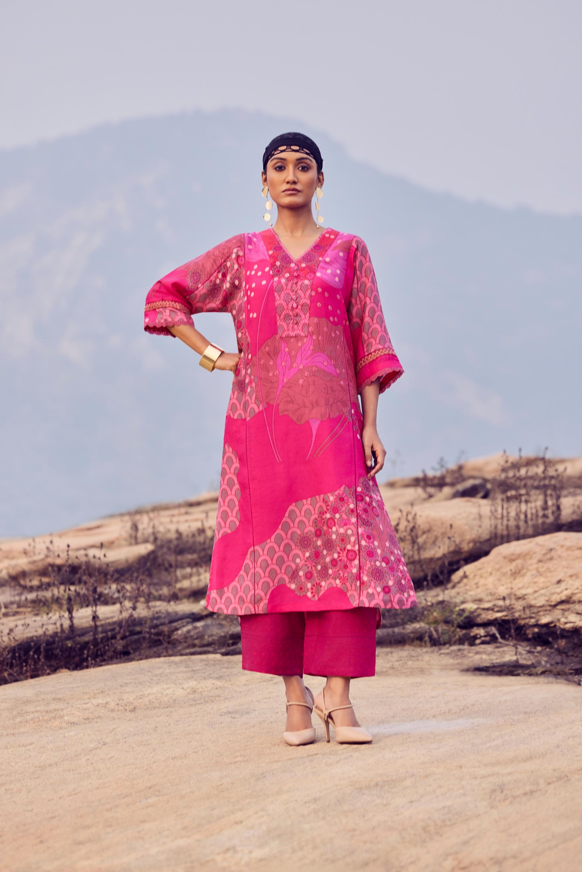 Hot pink hand woven, hand printed A-line kurta, with kaftan cut sleeves, and embroidery detail on sleeves and back, and quilted detail on neckline, paired with pants.