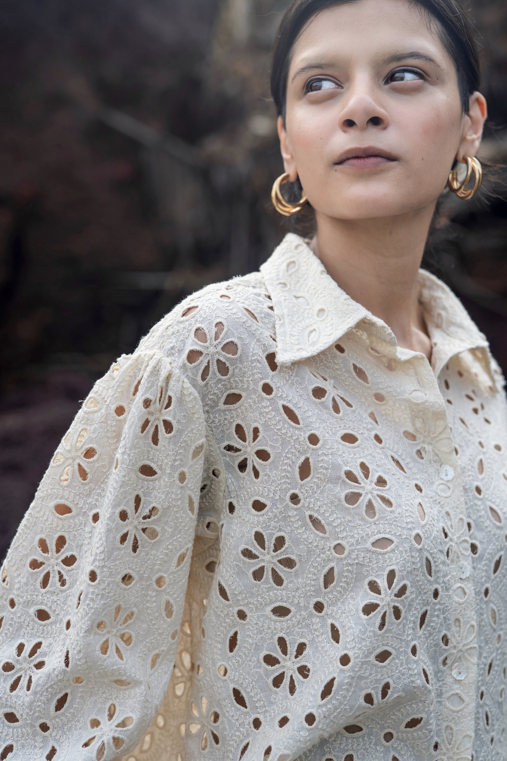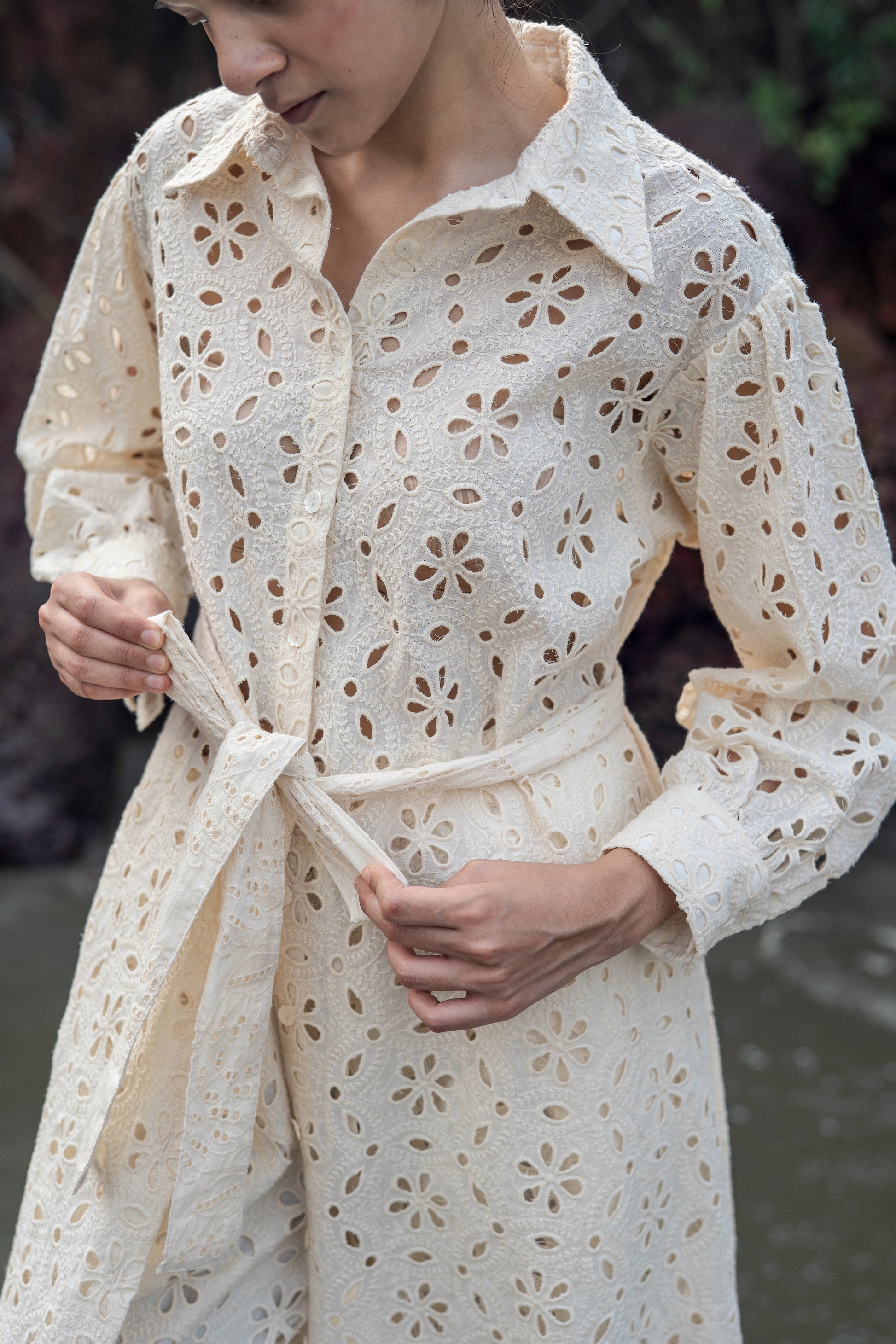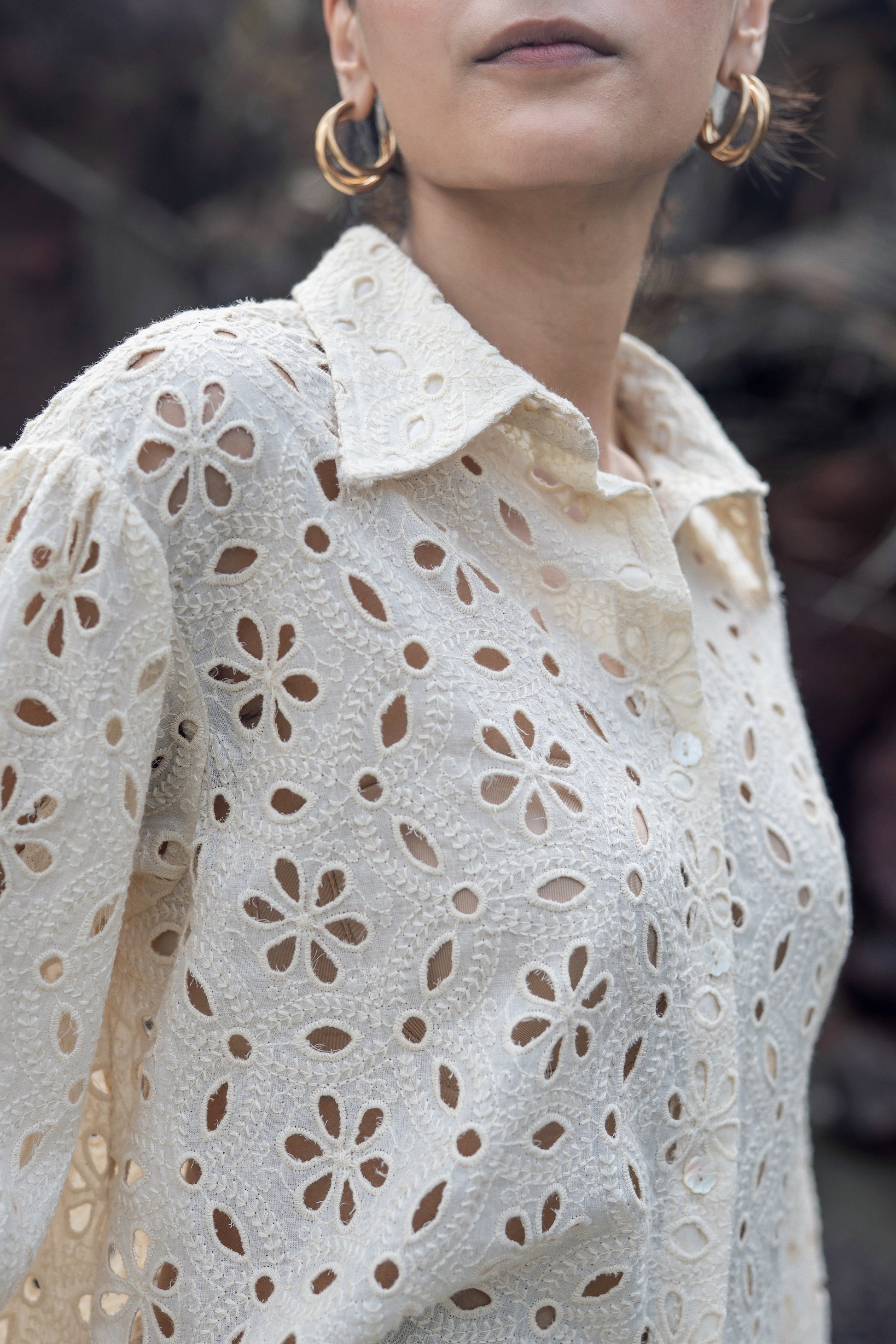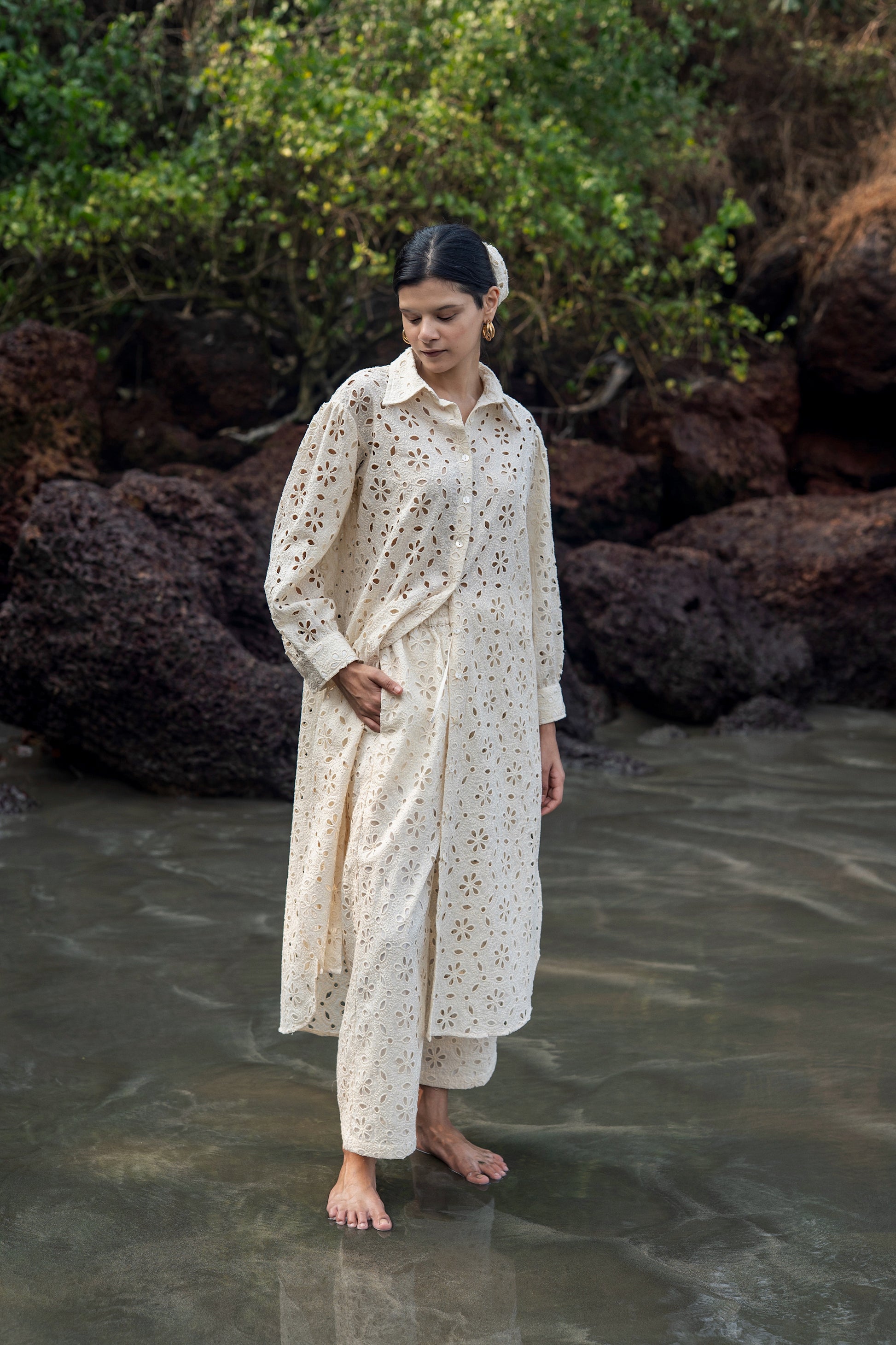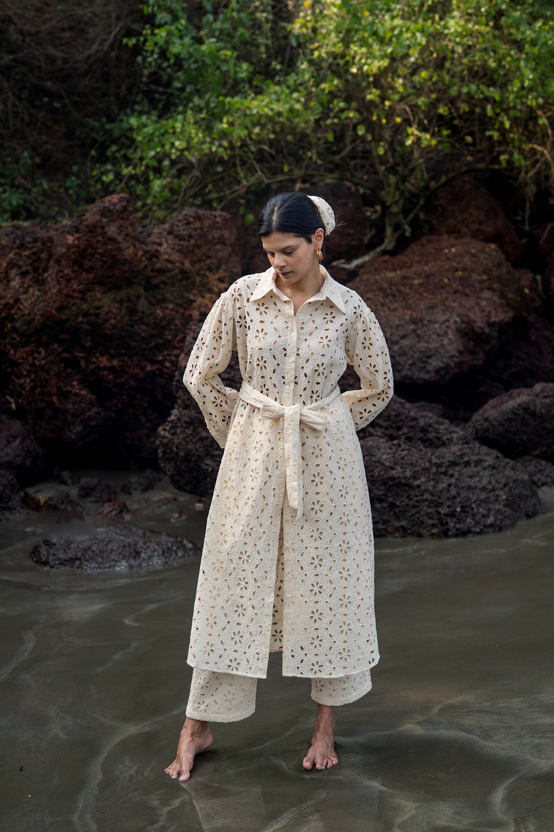 The Zinnia coord set is made from hakoba embroidered fabric. It is a button down tunic paired with hakoba embroidered lined pants and a belt attachment to make it perfect for an afternoon brunch.