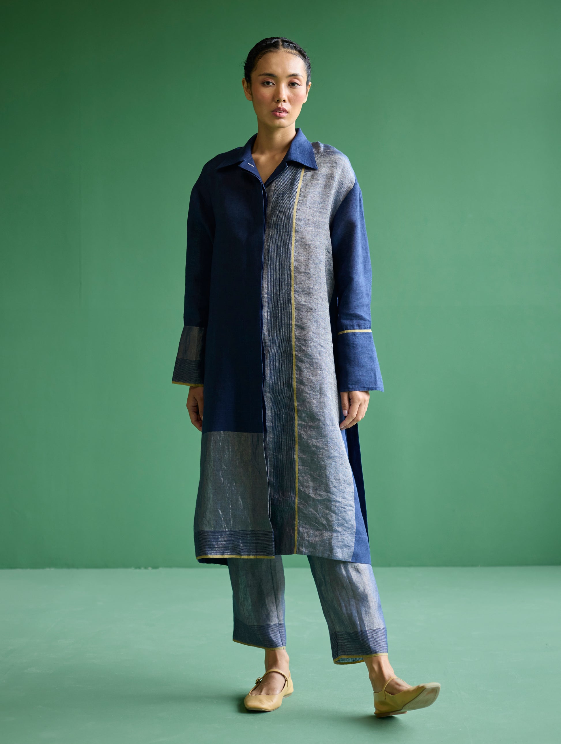 Kurta - The collared shirt-style kurta is handcrafted from our signature yarn-dyed soft handloom metallic border linen with a stripe border weave placed vertically adjacent to the placket and an ochre colored selvedge. It has a statement shirt collar, a button-down front, high side-slits and metallic brass buttons.
