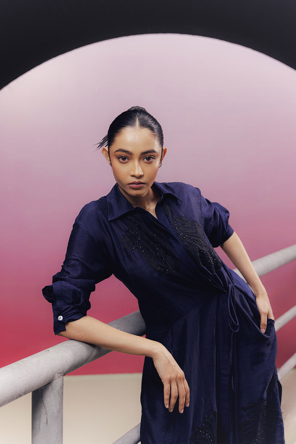 Handwoven silk midi shirt dress with contrast applique and an off-centre tie-up detail. The applique is highlighted with bead work.