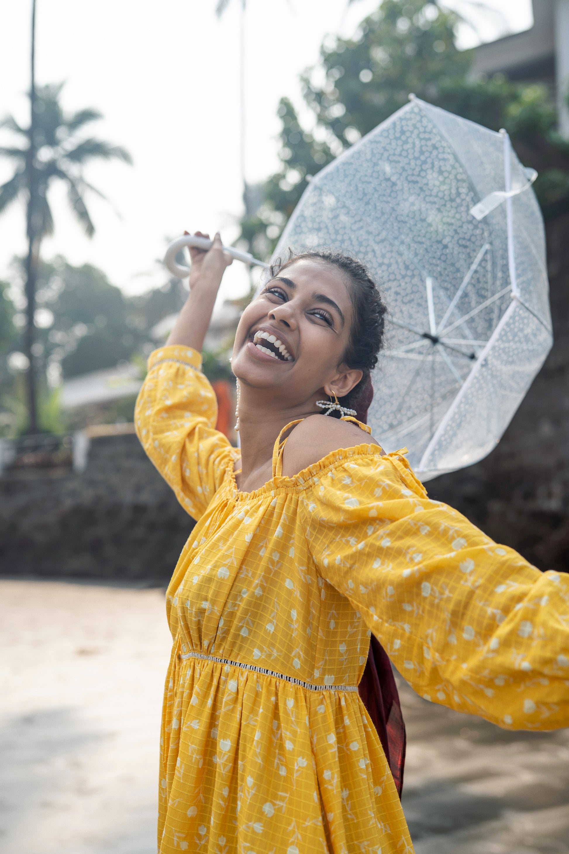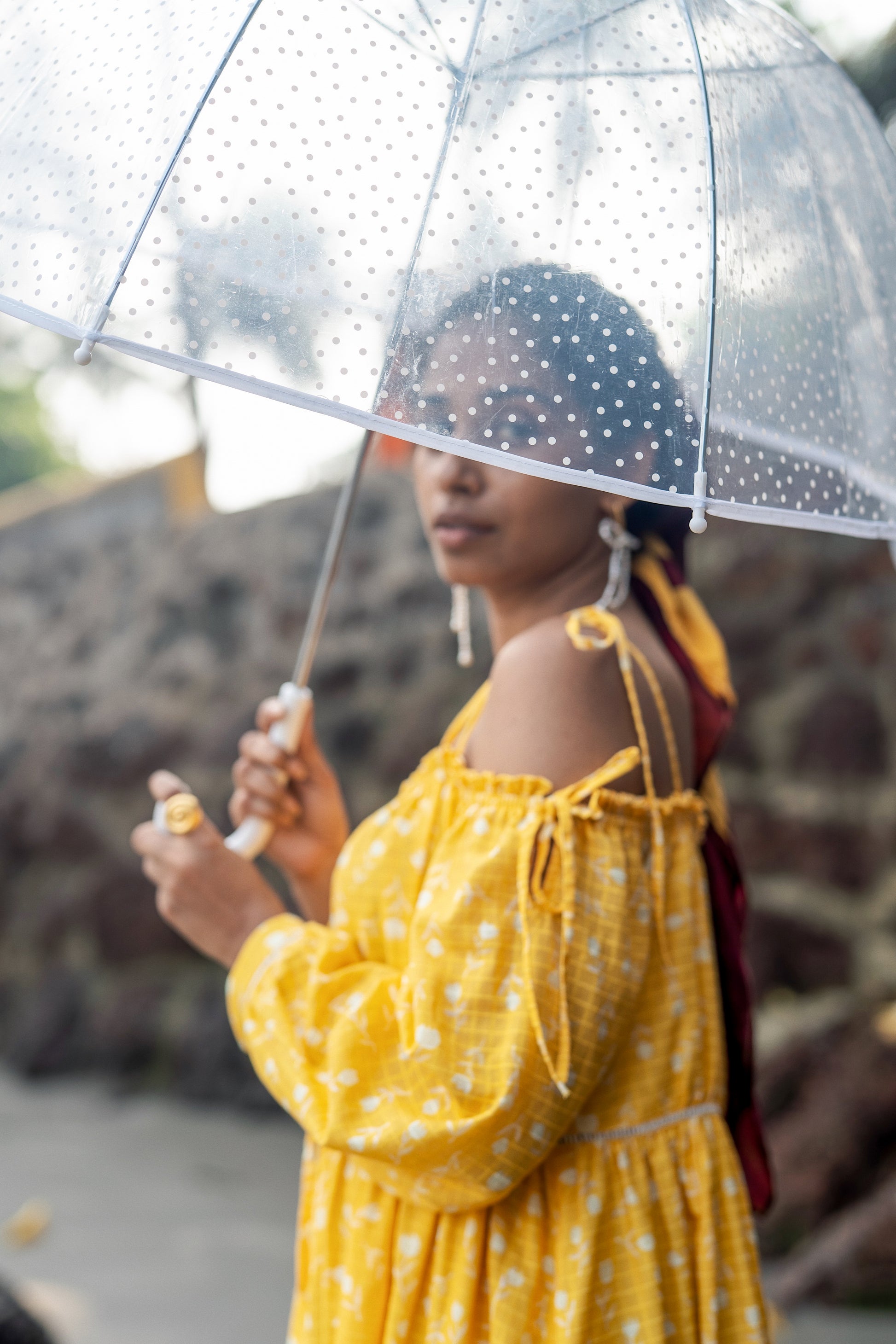 The zoe dress is made from our cotton chequard fabrication in our hand painted floral print. It has a tie up detailing at the shoulder with dropped sleeves and fagotting detailing under the bust.