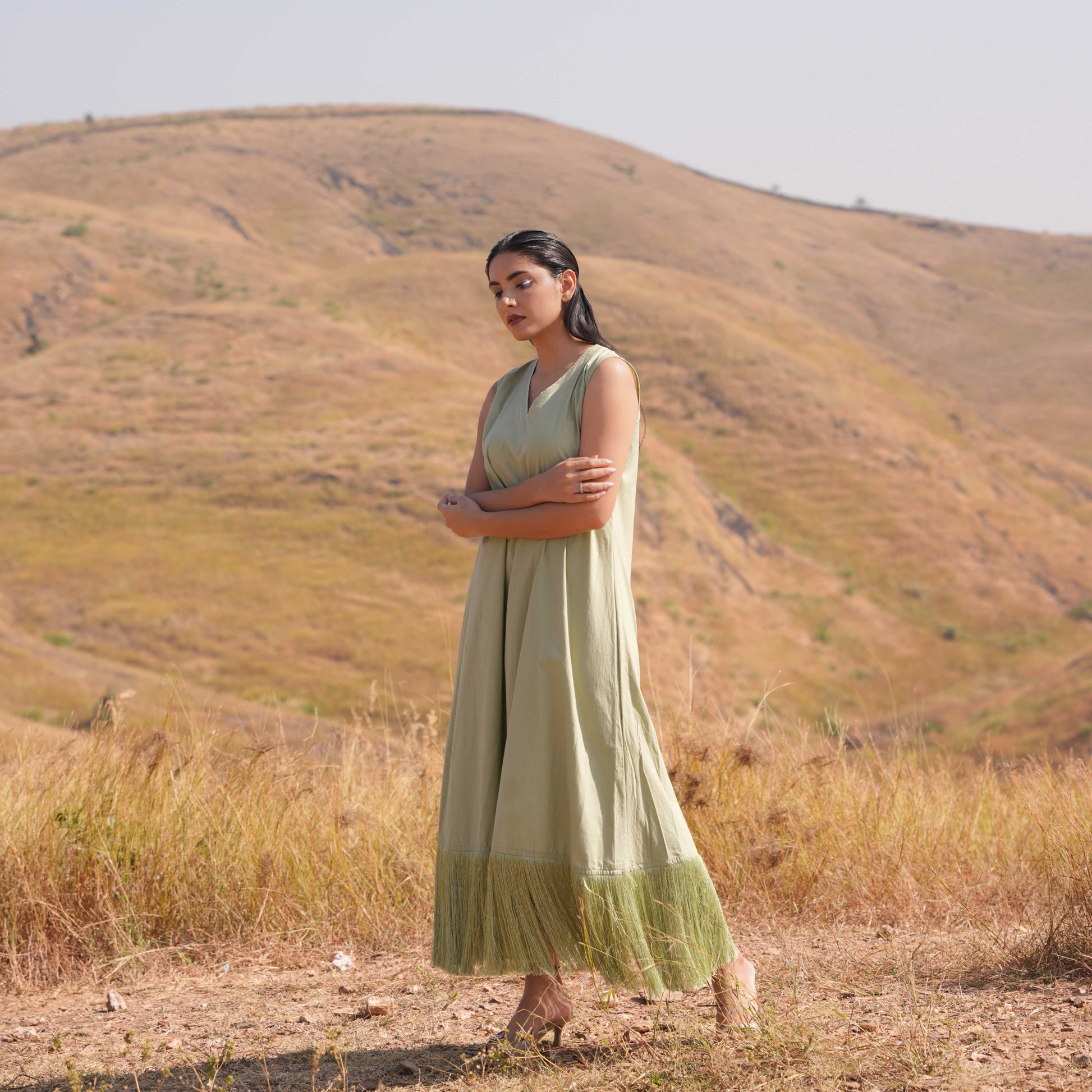 The printed flare and sleeves are beautifully highlighted with intricate sequence details, creating a subtle shimmer and modern flair. Delicate crochet buttons along the front add a charming finish, reflecting artisanal craftsmanship and attention to detail.